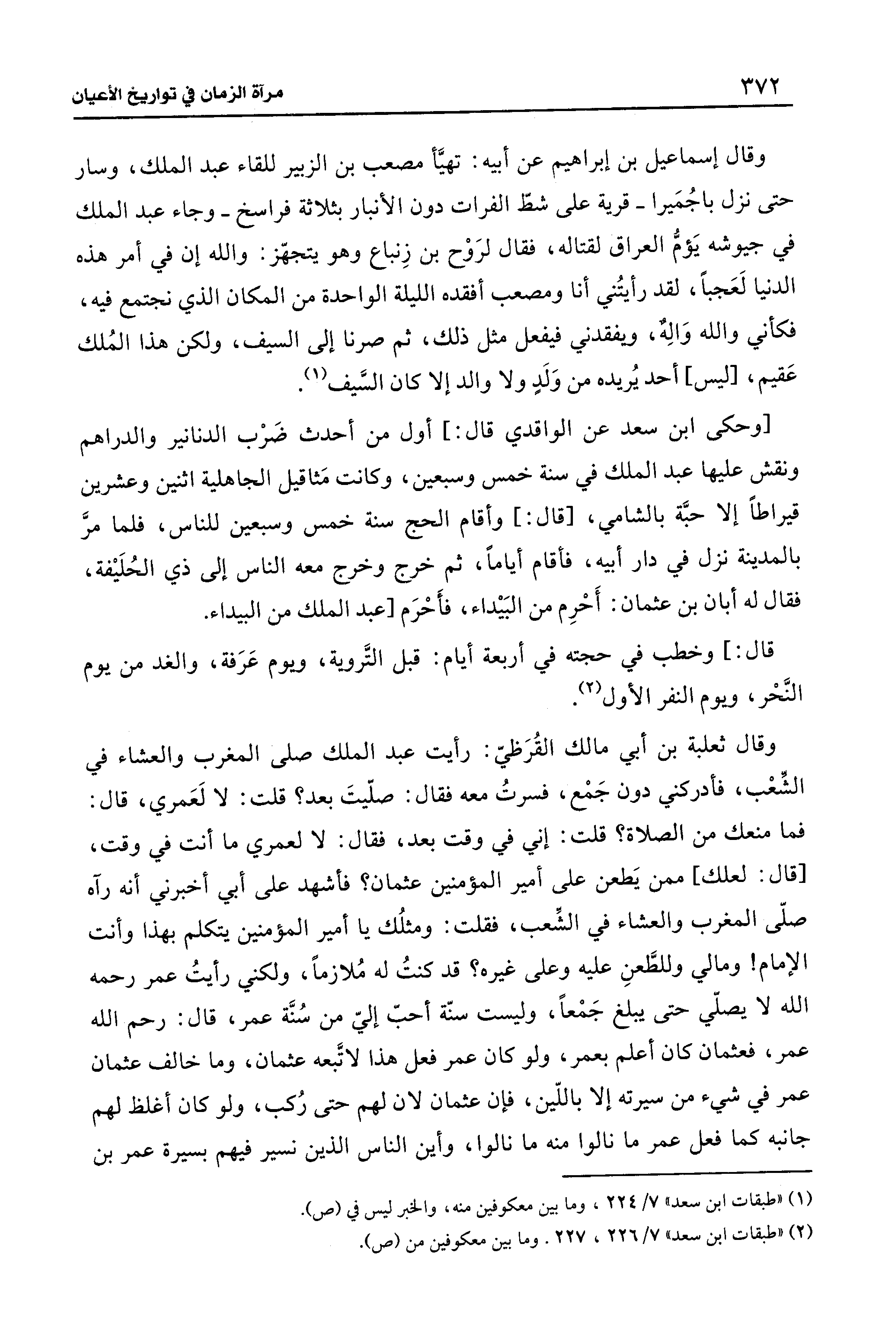 وقال ثعلبة بن أبي مالك القُرَظيّ: رأيت عبد الملك صلى المغرب والعشاء في الشِّعْب، فأدركني دون جَمْع، فسرتُ معه فقال: صلّيتَ بعد؟ قلت: لا لَعَمري، قال: فما منعك من الصلاة؟ قلت: إني في وقت بعد، فقال: لا لعمري ما أنت في وقت، [قال: لعلك] ممن يَطعن علي أمير المؤمنين عثمان؟ فأشهد على أبي أخبرني أنه رآه صلّى المغرب والعشاء في الشِّعب، فقلت: ومثلُك يا أمير المؤمنين يتكلم بهذا وأنت الإمام! وما لي وللطَّعنِ عليه وعلى غيره؟ قد كنتُ له مُلازمًا، ولكني رأيتُ عمر رحمه الله لا يصلّي حتى يبلغ جَمْعًا، وليست سنّة أحبّ إليّ من سُنَّة عمر، قال: رحم الله عمر، فعثمان كان أعلم بعمر، ولو كان عمر فعل هذا لاتَّبعه عثمان، وما خالف عثمان عمر في شيء من سيرته إلا باللّين، فإن عثمان لان لهم حتى رُكب، ولو كان أغلظ لهم جانبه كما فعل عمر ما نالوا منه ما نالوا، وأين الناس الذين نسير فيهم بسيرة عمر بن