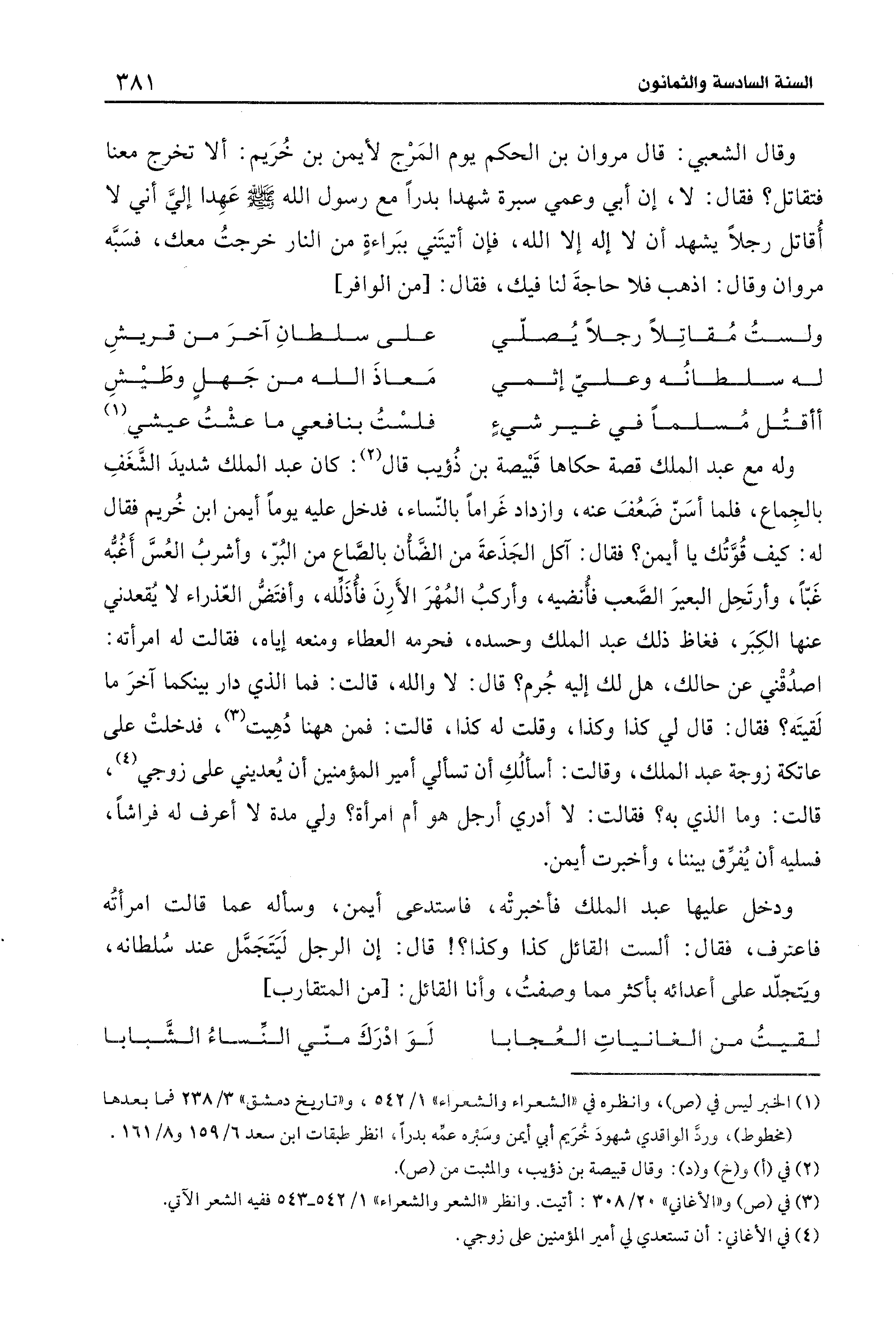 وله مع عبد الملك قصة حكاها قَبْيصة بن ذُؤيب قال (¬2): كان عبد الملك شديدَ الشَّغَفِ بالجِماع، فلما أسنّ ضَعُفَ عنه، وازداد غَراما بالنّساء، فدخل عليه يومًا أيمن ابن خُريم فقال له: كيف قُوَّتُك يا أيمن؟ فقال: آكل الجَذَعةَ من الضَّأن بالصّاع من البُرّ، وأشربُ العُسَّ أَغُبُّه غَبًّا، وأرتَحِل البعيرَ الصَّعب فأُنضيه، وأركبُ المُهْرَ الأَرِن فأُذَلله، وأفتَضّ العّذراء لا يُقعدني عنها الكِبَر، فغاظ ذلك عبد الملك وحسده، فحرمه العطاء ومنعه إياه، فقالت له امرأته: اصدُقْني عن حالك، هل لك إليه جُرم؟ قال: لا والله، قالت: فما الذي دار بينكما آخرَ ما لَقيتَه؟ فقال: قال لي كذا وكذا، وقلت له كذا، قالت: فمن ها هنا دُهِيت (¬3)، فدخلتْ على عاتكة زوجة عبد الملك، وقالت: أسألُكِ أن تسألني أمير المؤمنين أن يُعديني على زوجي (¬4)، قالت. وما الذي به؟ فقالت: لا أدري أرجل هو أم امرأة؟ ولي مدة لا أعرف له فراشًا، فسليه أن يُفرِّق بيننا، وأخبرت أيمن.