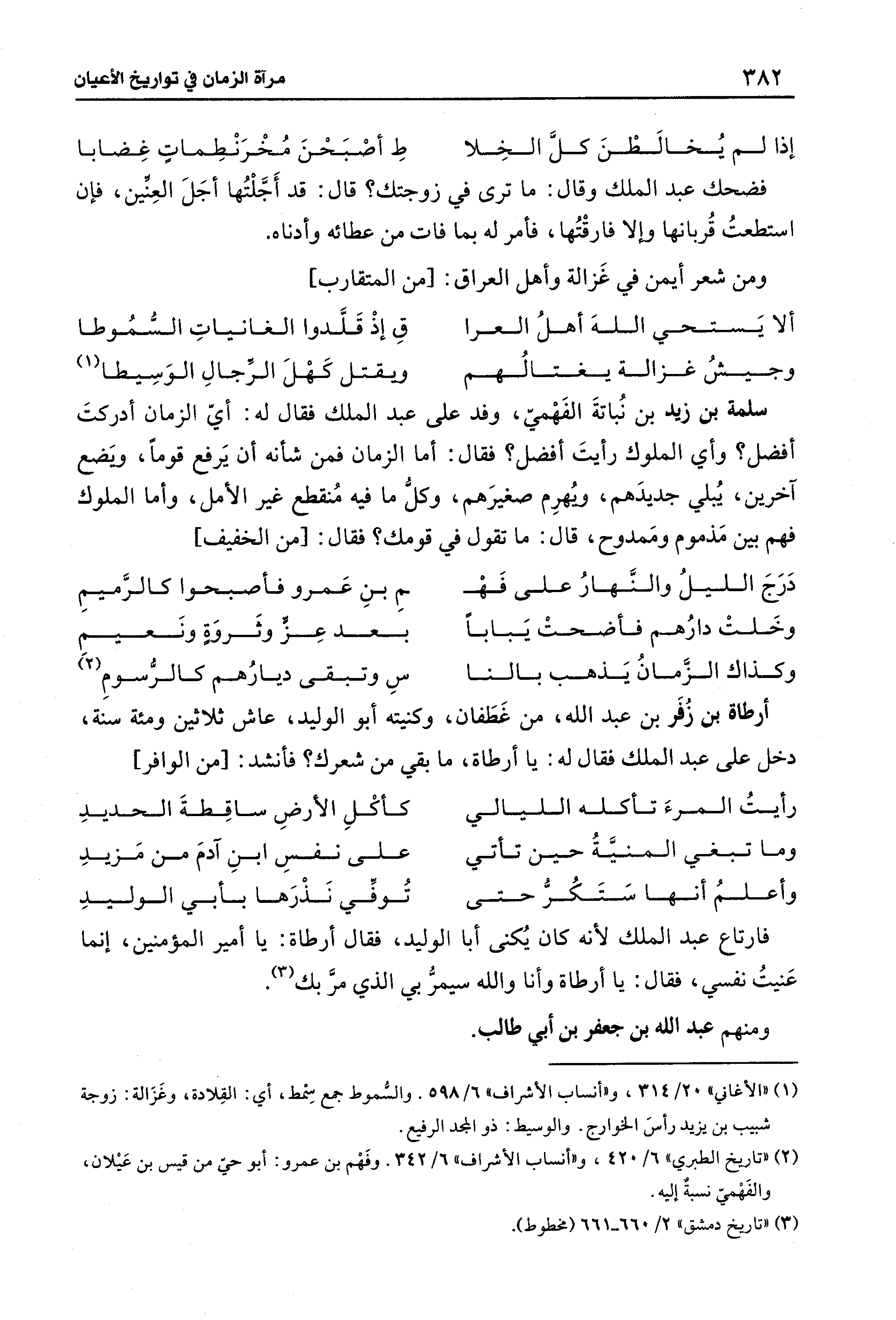 أرطاة بن زُفَر بن عبد الله، من غَطَفان، وكنيته أبو الوليد، عاش ثلاثين ومئة سنة، دخل على عبد الملك فقال له: يا أرطاة، ما بقي من شعرك؟ فأنشد: [من الوافر]