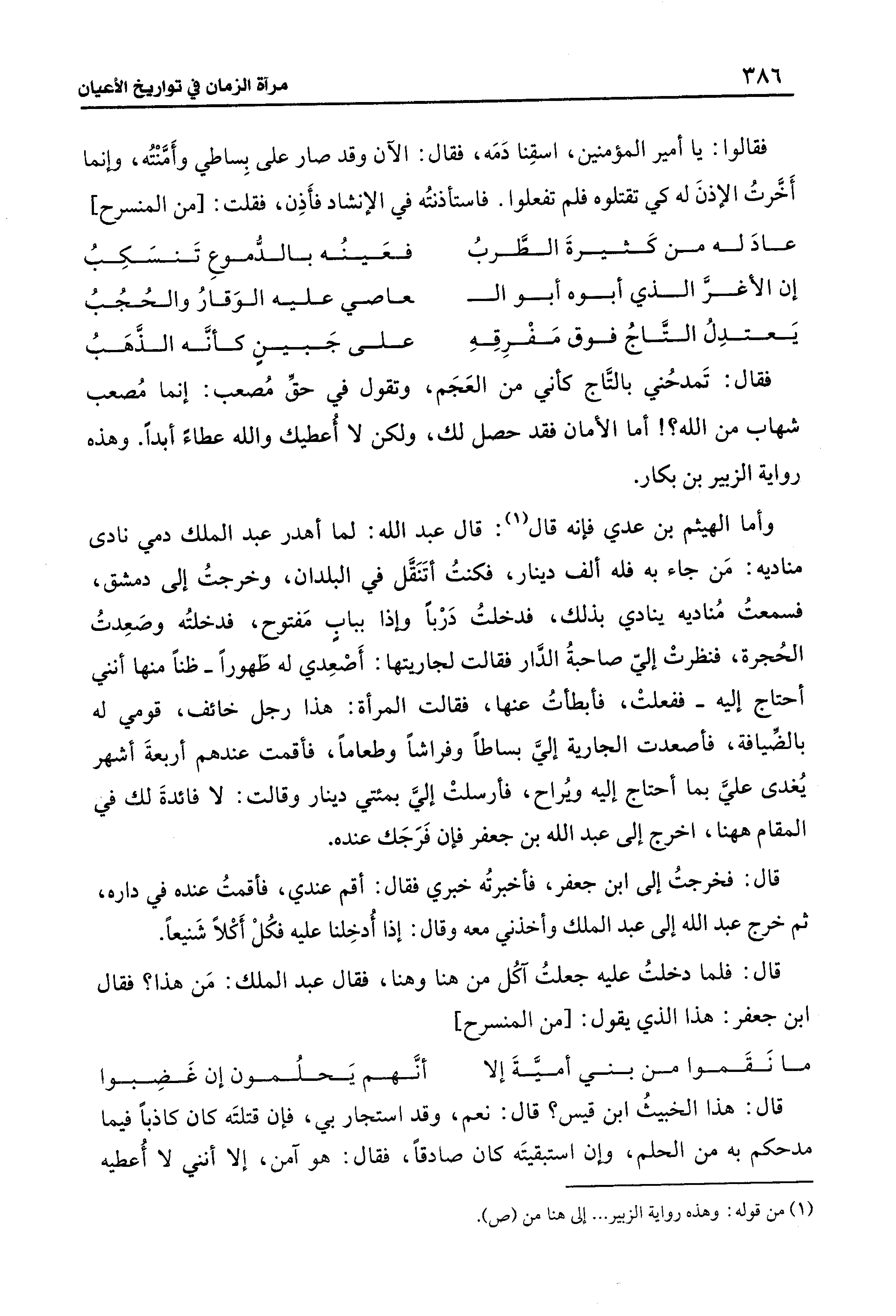 فقالوا: يا أمير المؤمنين، اسقِنا دَمَه، فقال: الآن وقد صار على بِساطي وأَمَّنْتُه، وإنما أَخَّرتُ الإذنَ له كي تقتلوه فلم تفعلوا. فاستأذنتُه في الإنشاد فأَذِن، فقلت: [من المنسرح]