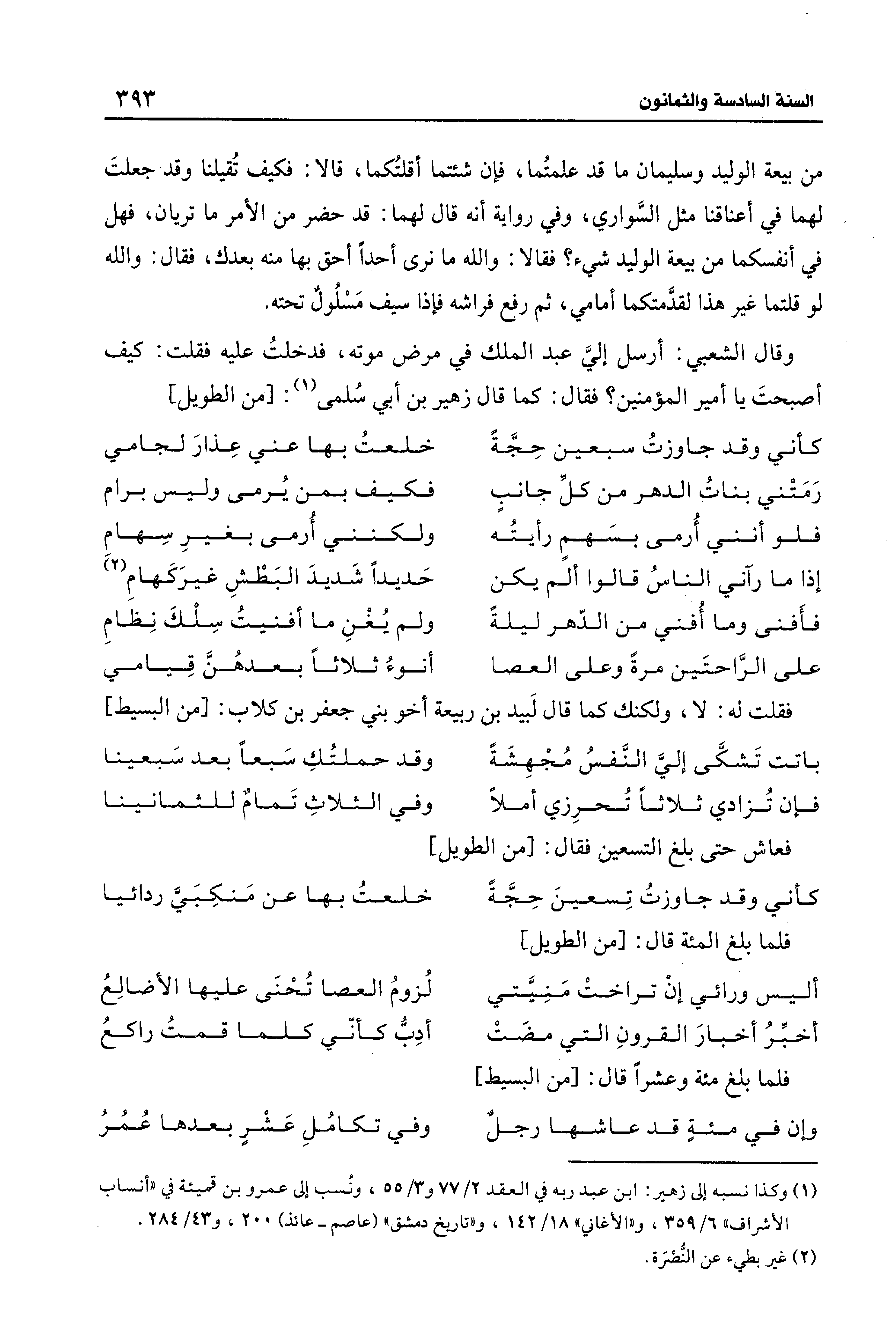 وقال الشعبي: أرسل إليَّ عبد الملك في مرض موته، فدخلتُ عليه فقلت: كيف أصبحتَ يا أمير المؤمنين؟ فقال: كما قال زهير بن أبي سُلمى (¬1): [من الطويل]