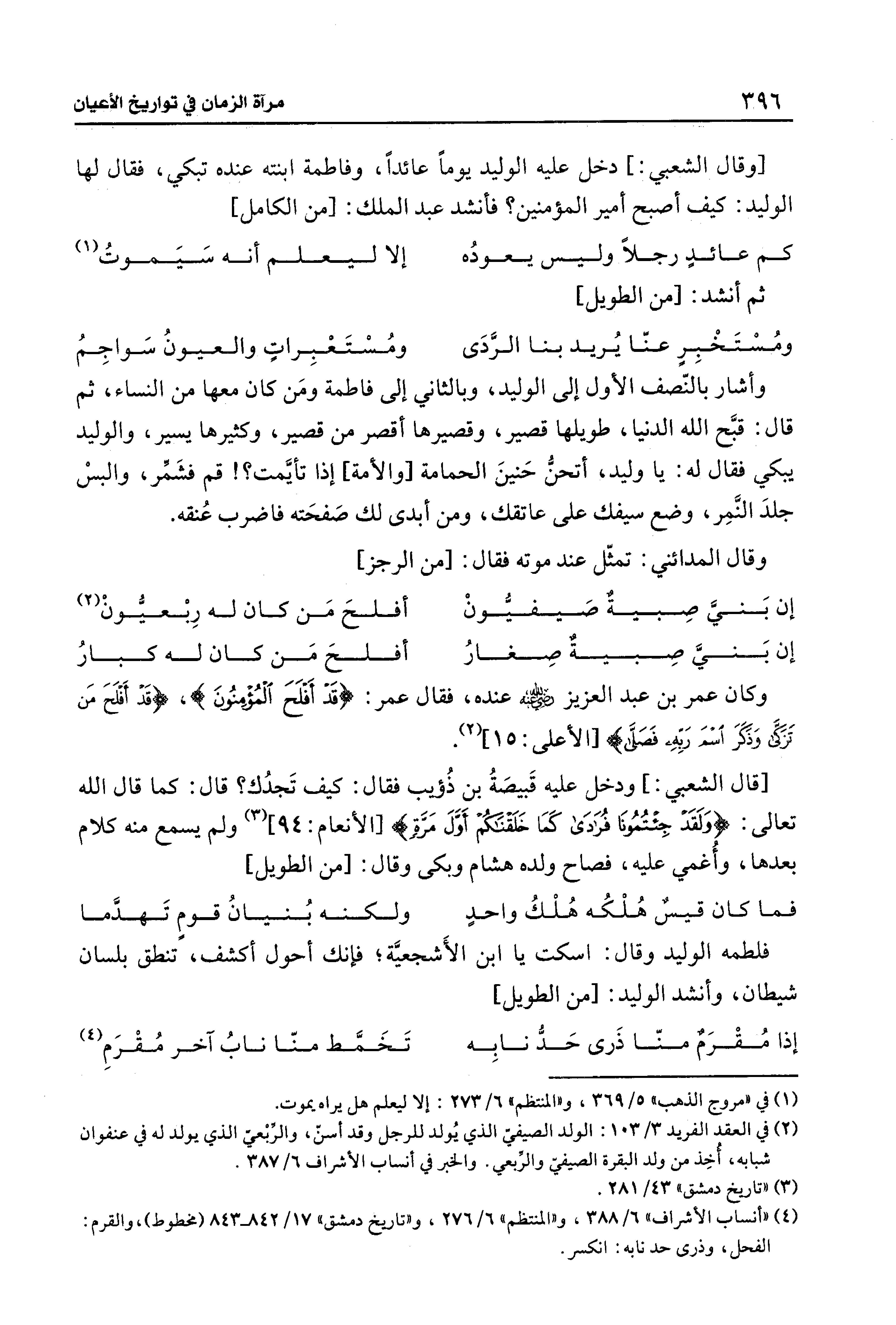 [قال الشعبي: ] ودخل عليه قَبيصَةُ بن ذُؤيب فقال: كيف تَجدُك؟ قال: كما قال الله تعالى: {وَلَقَدْ جِئْتُمُونَا فُرَادَى كَمَا خَلَقْنَاكُمْ أَوَّلَ مَرَّةٍ} [الأنعام: 94] (¬3) ولم يسمع منه كلام بعدها، وأُغمي عليه، فصاح ولده هشام وبكى وقال: [من الطويل]