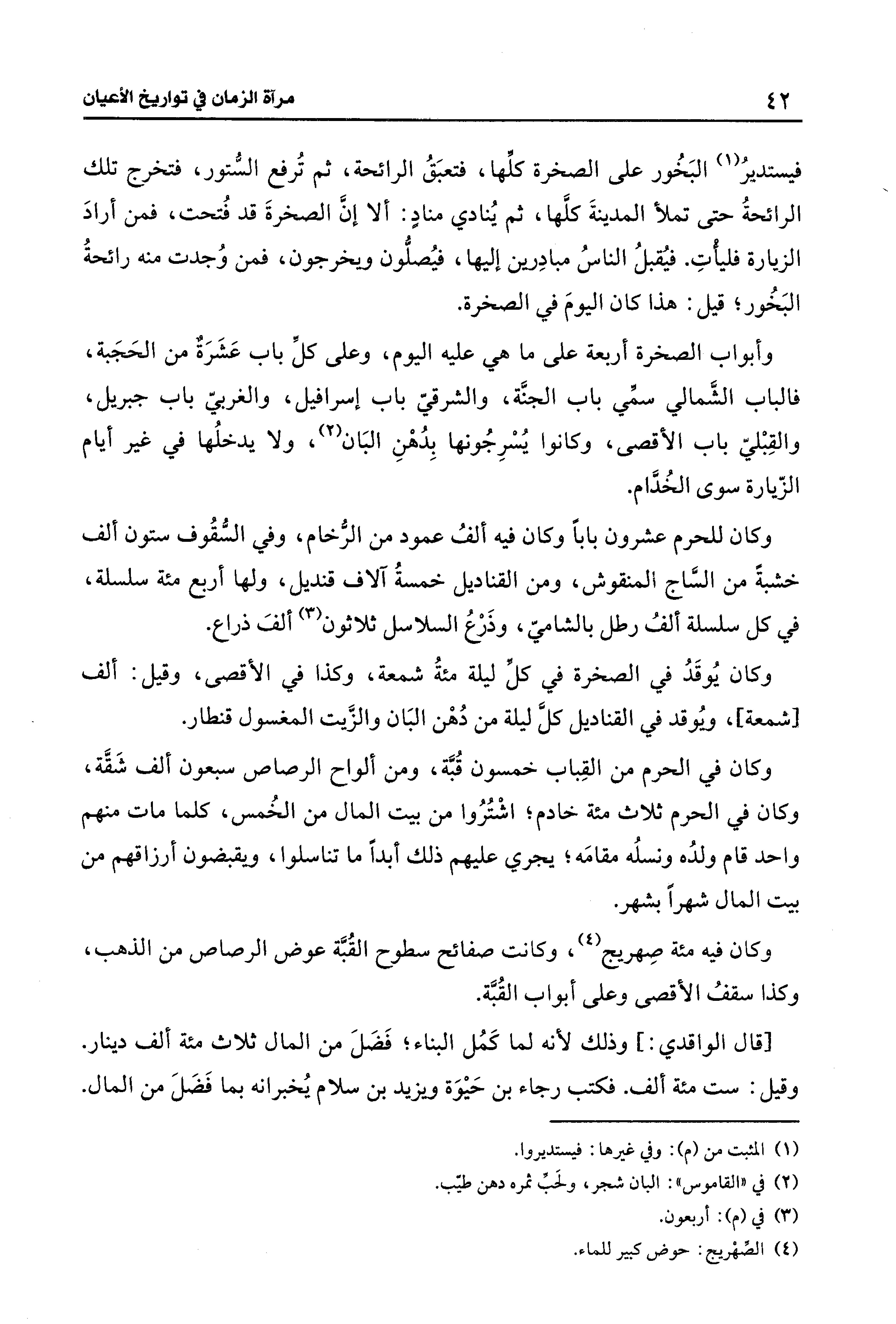 وكان فيه مئة صِهريج (¬4)، وكانت صفائح سطوح القُبَّة عوض الرصاص من الذهب، وكذا سقفُ الأقصى وعلى أبواب القُبَّة.