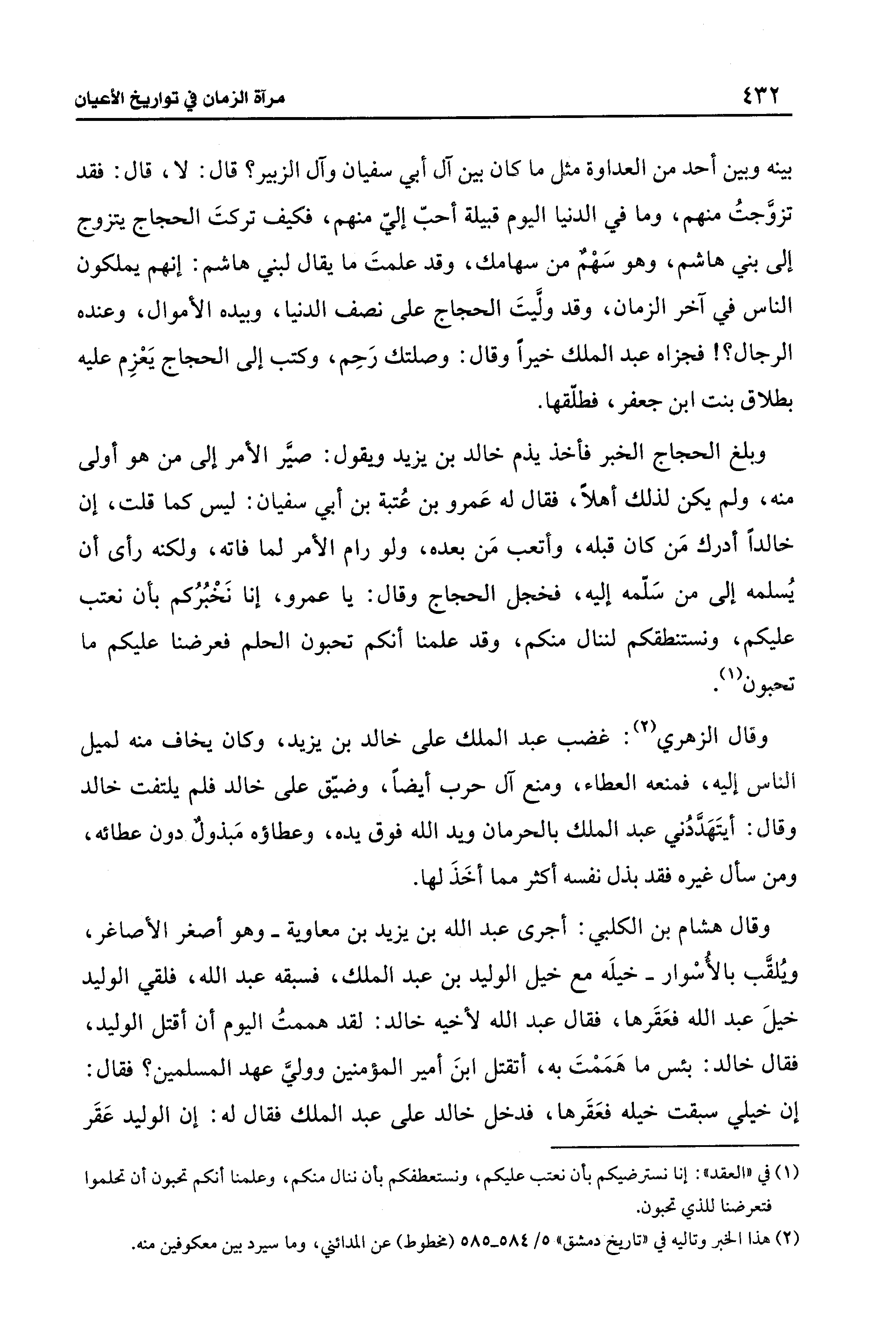 وبلغ الحجاج الخبر فأخذ يذم خالد بن يزيد ويقول: صيَّر الأمر إلى من هو أولى منه، ولم يكن لذلك أهلًا، فقال له عَمرو بن عُتبة بن أبي سفيان: ليس كما قلت، إن خالدًا أدرك مَن كان قبله، وأتعب مَن بعده، ولو رام الأمر لما فاته، ولكنه رأى أن يُسلمه إلى من سَلّمه إليه، فخجل الحجاج وقال: يا عمرو، إنا نَخْبُرُكم بأن نعتب عليكم، ونستنطقكم لننال منكم، وقد علمنا أنكم تحبون الحلم فعرضنا عليكم ما تحبون (¬1).