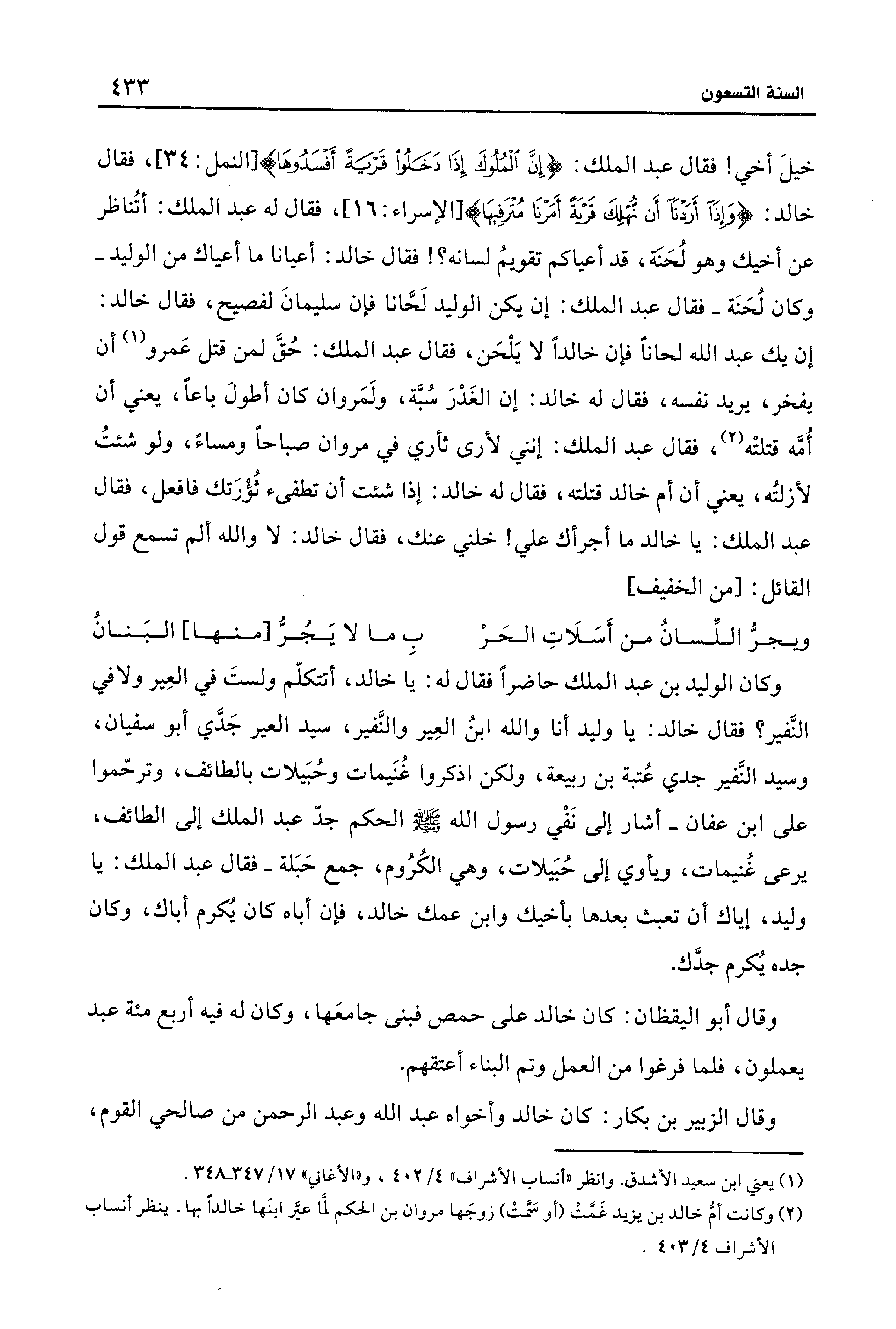 خيلَ أخي! فقال عبد الملك: {إِنَّ الْمُلُوكَ إِذَا دَخَلُوا قَرْيَةً أَفْسَدُو} [النمل: 34]، فقال خالد: {وَإِذَا أَرَدْنَا أَنْ نُهْلِكَ قَرْيَةً أَمَرْنَا مُتْرَفِيهَا} [الإسراء: 16]، فقال له عبد الملك: أتُناظر عن أخيك وهو لُحَنَة، قد أعياكم تقويمُ لسانه؟ ! فقال خالد: أعيانا ما أعياك من الوليد -وكان لُحَنَة- فقال عبد الملك: إن يكن الوليد لَحَّانا فإن سليمانَ لفصيح، فقال خالد: إن يك عبد الله لحانًا فإن خالدًا لا يَلْحَن، فقال عبد الملك: حُقَّ لمن قتل عَمرو (¬1) أن يفخر، يريد نفسه، فقال له خالد: إن الغَدْرَ سُبَّة، ولَمَروان كان أطولَ باعًا، يعني أن أُمَّه قتلتْه (¬2)، فقال عبد الملك: إنني لأرى ثأري في مروان صباحًا ومساءً، ولو شئتُ لأزلتُه، يعني أن أم خالد قتلته، فقال له خالد: إذا شئت أن تطفئ ثُورَتك فافعل، فقال عبد الملك: يا خالد ما أجرأك علي! خلني عنك، فقال خالد: لا والله ألم تسمع قول القائل: [من الخفيف]