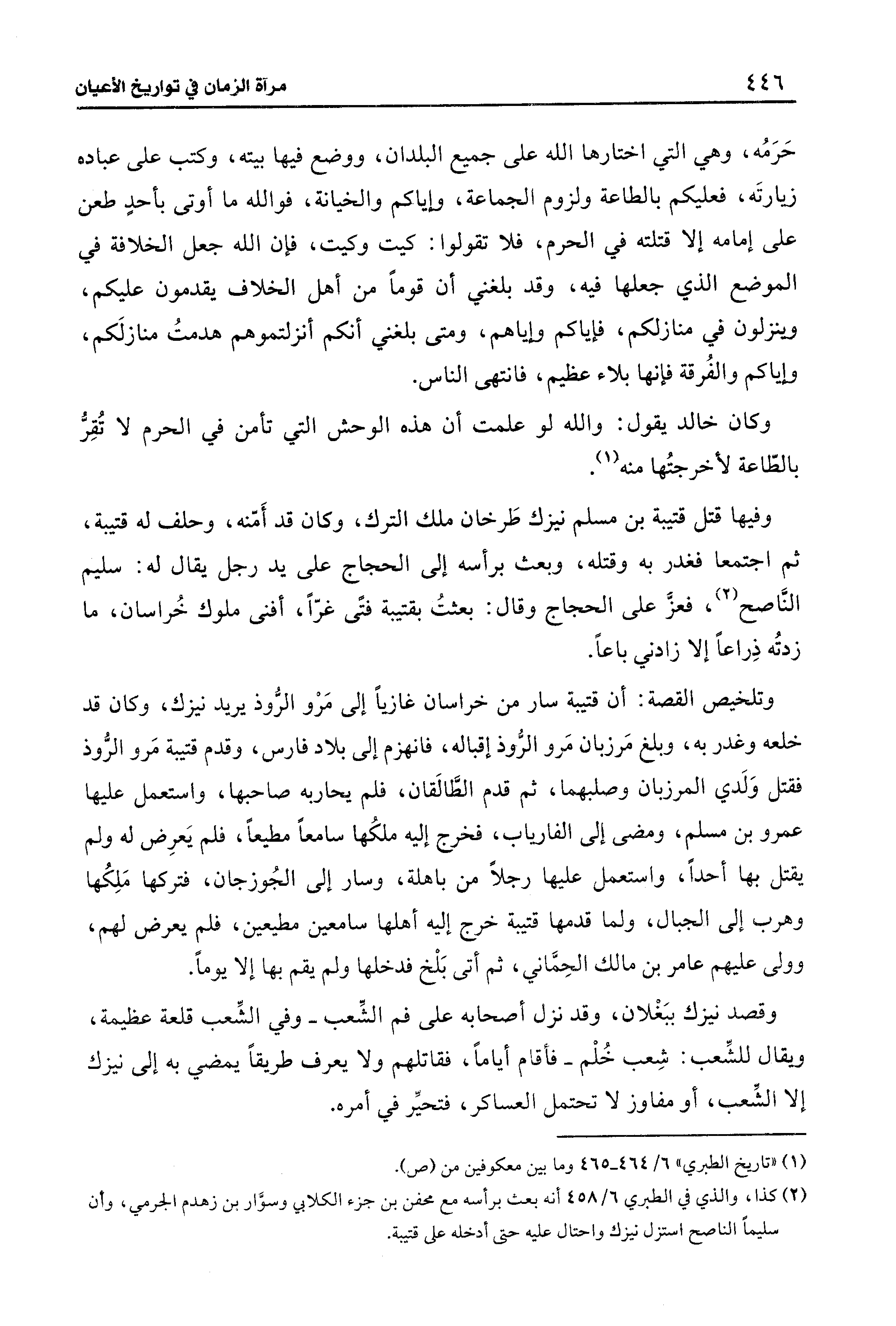 حَرَمُه، وهي التي اختارها الله على جميع البلدان، ووضع فيها بيته، وكتب على عبادة زيارتَه، فعليكم بالطَّاعة ولزوم الجماعة، وإيَّاكم والخيانة، فوالله ما أوتى بأحدٍ طعن على إمامه إلَّا قتلته في الحرم، فلا تقولوا: كيت وكيت، فإن الله جعل الخلافة في الموضع الذي جعلها فيه، وقد بلغني أن قومًا من أهل الخلاف يقدمون عليكم، وينزلون في منازلكم، فإياكم وإياهم، ومتى بلغني أنكم أنزلتموهم هدمتُ منازلَكم، وإياكم والفُرقة فإنَّها بلاء عظيم، فانتهى النَّاس.