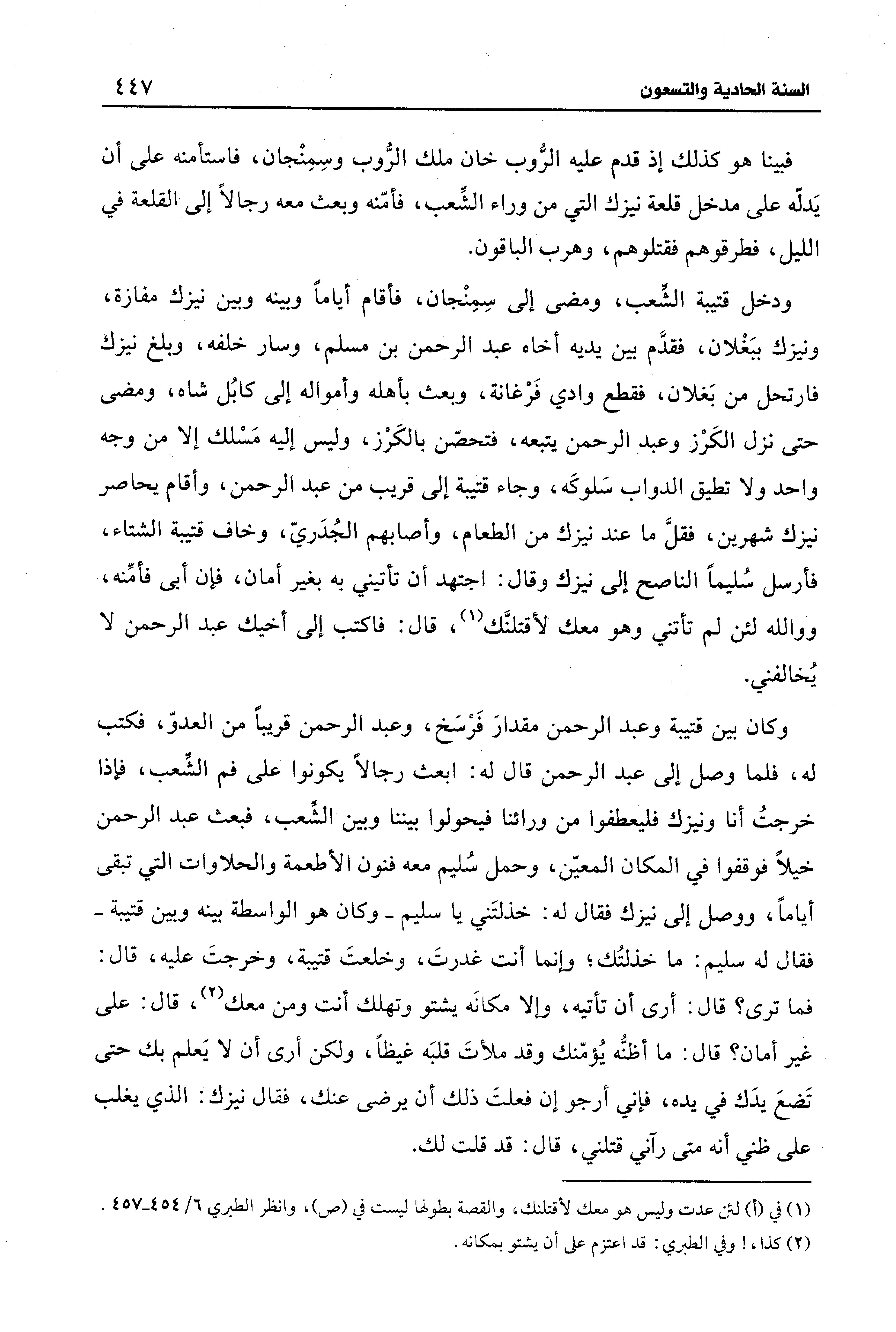 وكان بين قتيبة وعبد الرَّحْمَن مقدارَ فَرْسَخ، وعبد الرَّحْمَن قريبًا من العدوّ، فكتب له، فلما وصل إلى عبد الرَّحْمَن قال له: ابعث رجالًا يكونوا على فم الشِّعب، فإذا خرجت أنا ونيزك فليعطفوا من ورائنا فيحولوا بيننا وبين الشِّعب، فبعث عبد الرَّحْمَن خيلًا فوقفوا في المكان المعيّن، وحمل سُليم معه فنون الأطعمة والحلاوات التي تبقى أيامًا، ووصل إلى نيزك فقال له: خذلتَني يَا سليم -وكان هو الواسطة بينه وبين قتيبة- فقال له سليم: ما خذلتُك؛ وإنما أَنْتَ غدرتَ، وخلعتَ قتيبة، وخرجتَ عليه، قال: فما ترى؟ قال: أرى أن تأتيه، وإلا مكانَه يشتو وتهلك أَنْتَ ومن معك (¬2)، قال: على غير أمان؟ قال: ما أظنُّه يُؤمّنك وقد ملأتَ قلبَه غيظًا، ولكن أرى أن لا يَعلم بك حتَّى تَضعَ يدَك في يده، فإنِّي أرجو إن فعلتَ ذلك أن يرضى عنك، فقال نيزك: الذي يغلب على ظني أنَّه متى رآني قتلني، قال: قد قلت لك.