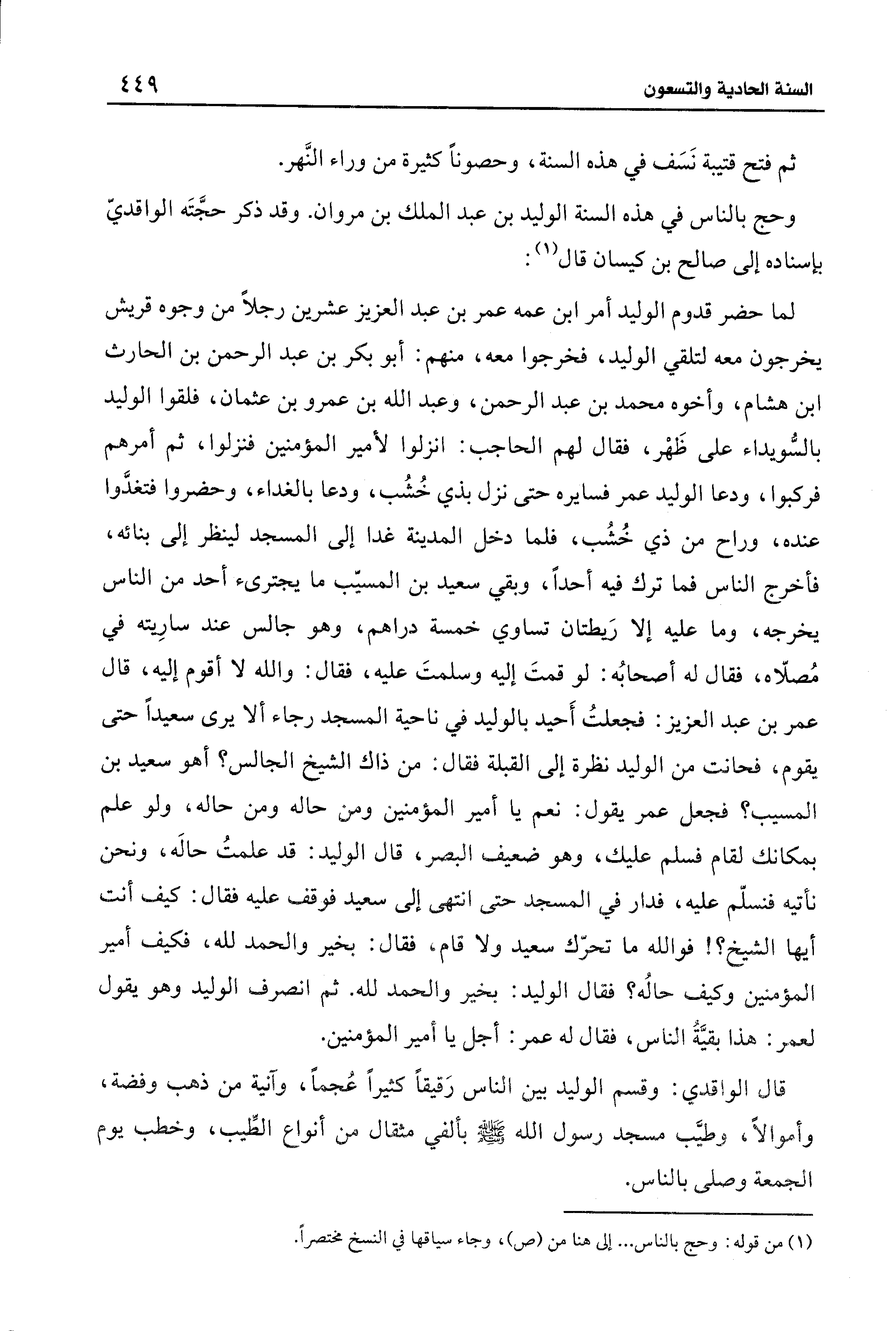 وحج بالنَّاس في هذه السنة الوليد بن عبد الملك بن مروان. وقد ذكر حجَّتَه الواقديّ بإسناده إلى صالح بن كيسان قال (¬1):