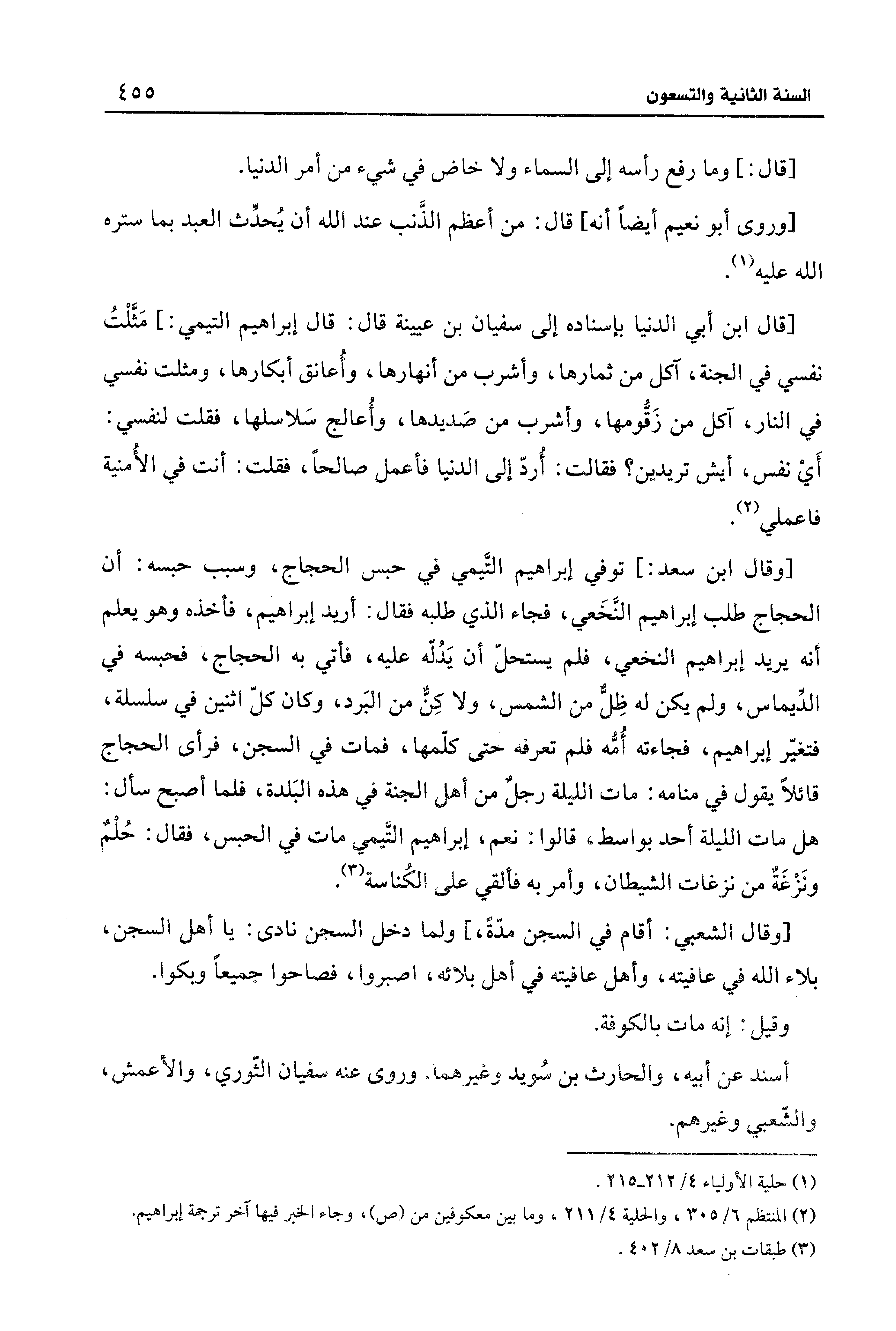 (¬2) المنتظم 6/ 305، والحلية 4/ 211، وما بين معكوفين من (ص)، وجاء الخبر فيها آخر ترجمة إبراهيم.