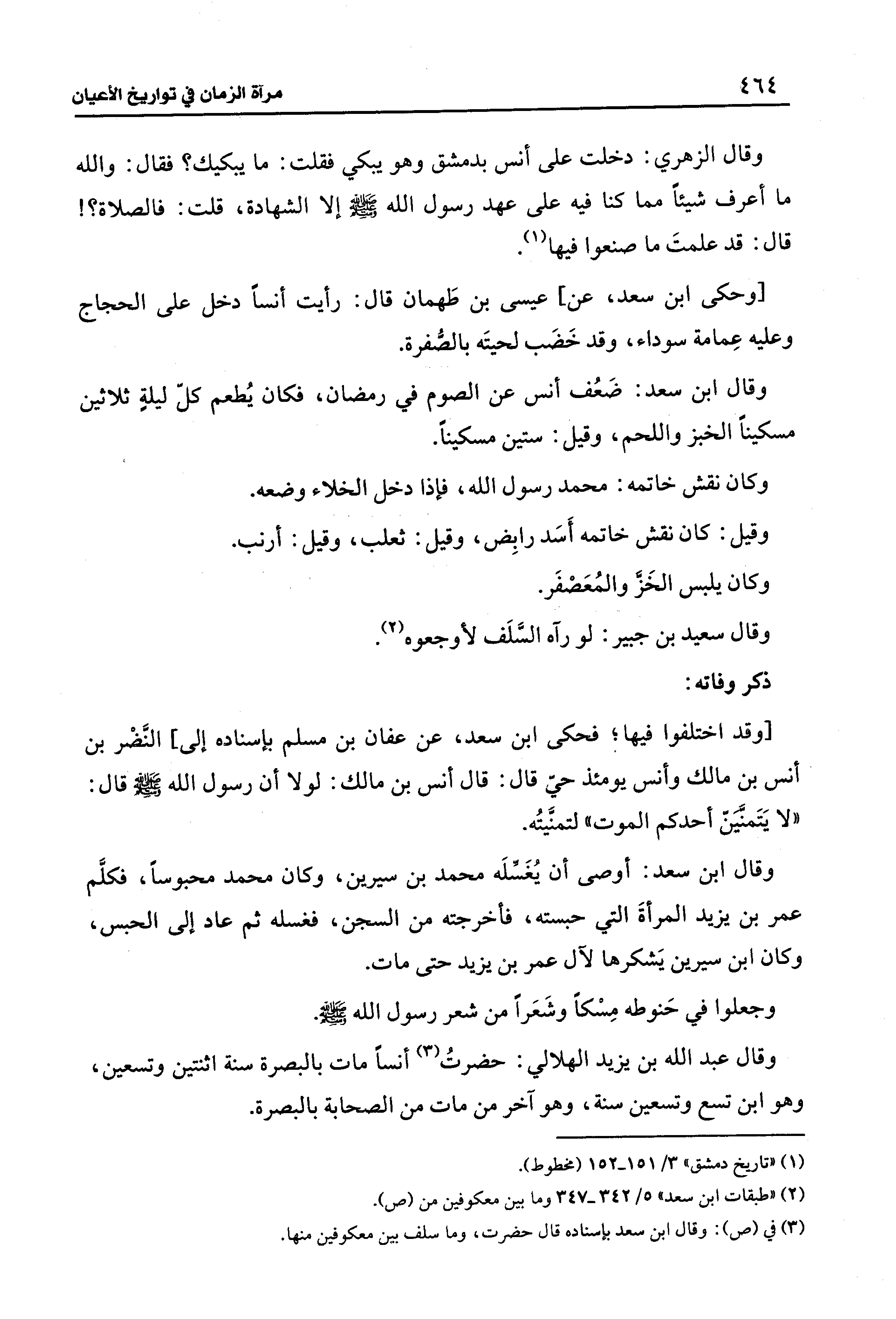 [وقد اختلفوا فيها؛ فحكى ابن سعد، عن عفان بن مسلم بإسناده إلى] النَّضْر بن أنس بن مالك وأنس يومئذ حيّ قال: قال أنس بن مالك: لولا أن رسول الله - صلى الله عليه وسلم - قال: "لا يَتَمنَّيَنّ أحدكم الموت" لتمنَّيتُه.