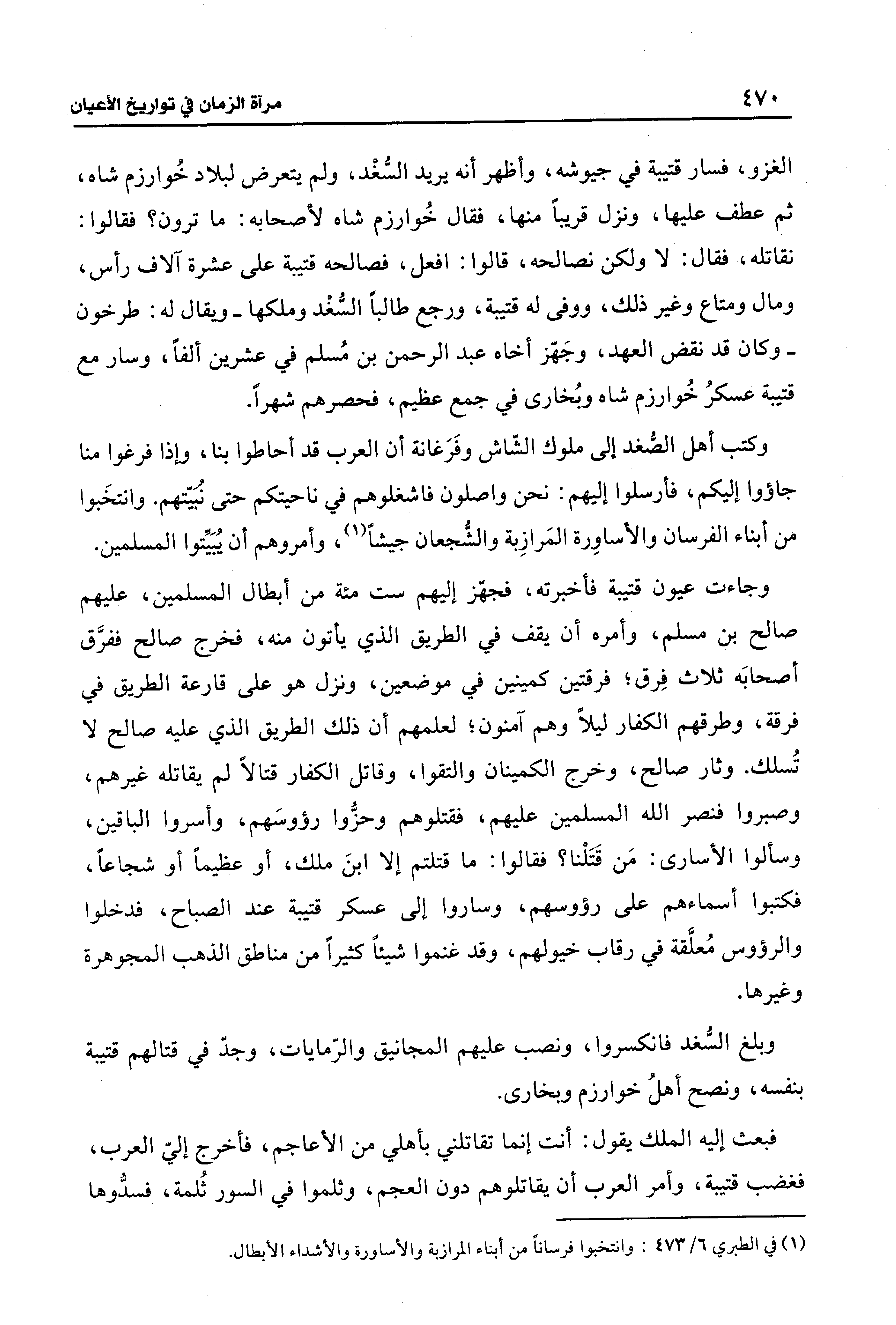 الغزو، فسار قتيبة في جيوشه، وأظهر أنَّه يريد السُّغْد، ولم يتعرض لبلاد خُوارزم شاه، ثم عطف عليها، ونزل قريبًا منها، فقال خُوارزم شاه لأصحابه: ما ترون؟ فقالوا: نقاتله، فقال: لا ولكن نصالحه، قالوا: افعل، فصالحه قتيبة على عشرة آلاف رأس، ومال ومتاع وغير ذلك، ووفى له قتيبة، ورجع طالبًا السُّغْد وملكها -ويقال له: طرخون- وكان قد نقض العهد، وجَهّز أخاه عبد الرَّحْمَن بن مُسلم في عشرين ألفًا، وسار مع قتيبة عسكرُ خُوارزم شاه وبُخارى في جمع عظيم، فحصرهم شهرًا.