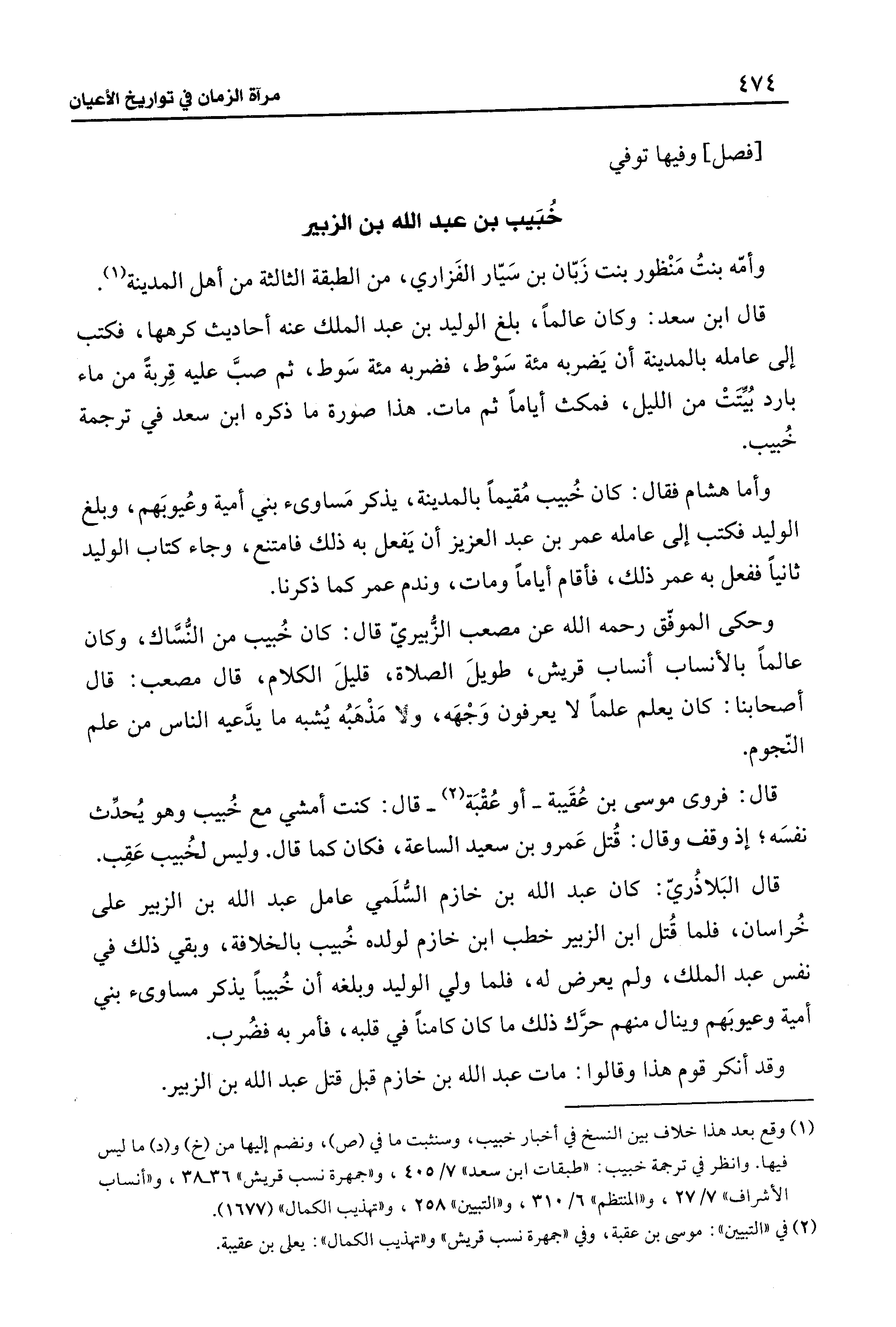 وأما هشام فقال: كان خُبيب مُقيمًا بالمدينة، يذكر مَساوئ بني أمية وعُيوبَهم، وبلغ الوليد فكتب إلى عامله عمر بن عبد العزيز أن يَفعل به ذلك فامتنع، وجاء كتاب الوليد ثانيًا ففعل به عمر ذلك، فأقام أيامًا ومات، وندم عمر كما ذكرنا.