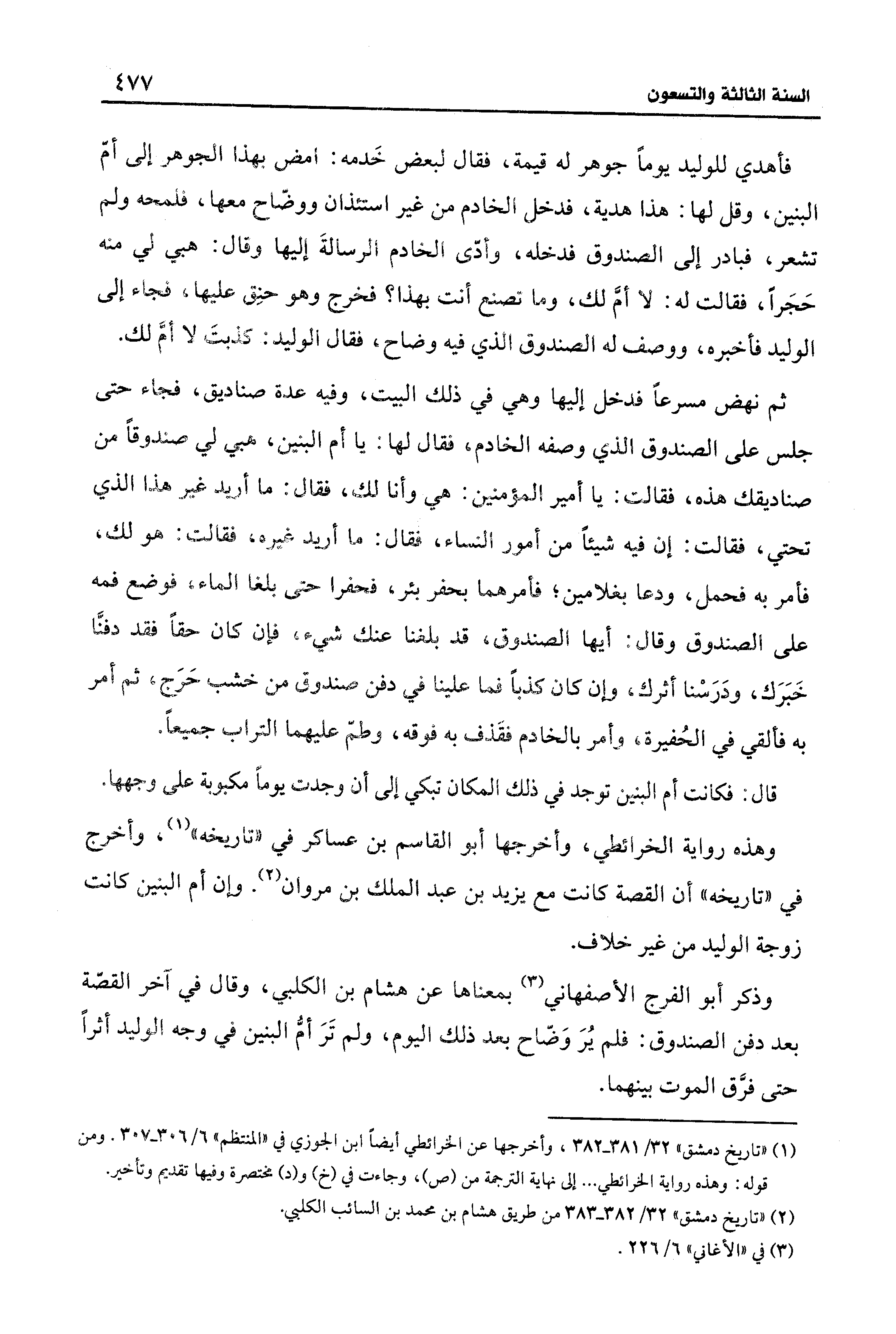 وذكر أبو الفرج الأصفهاني (¬3) بمعناها عن هشام بن الكلبي, وقال في آخر القصّة بعد دفن الصندوق: فلم يُرَ وَضّاح بعد ذلك اليوم، ولم تَرَ أمُّ البنين في وجه الوليد أثرًا حتَّى فرَّق الموت بينهما.