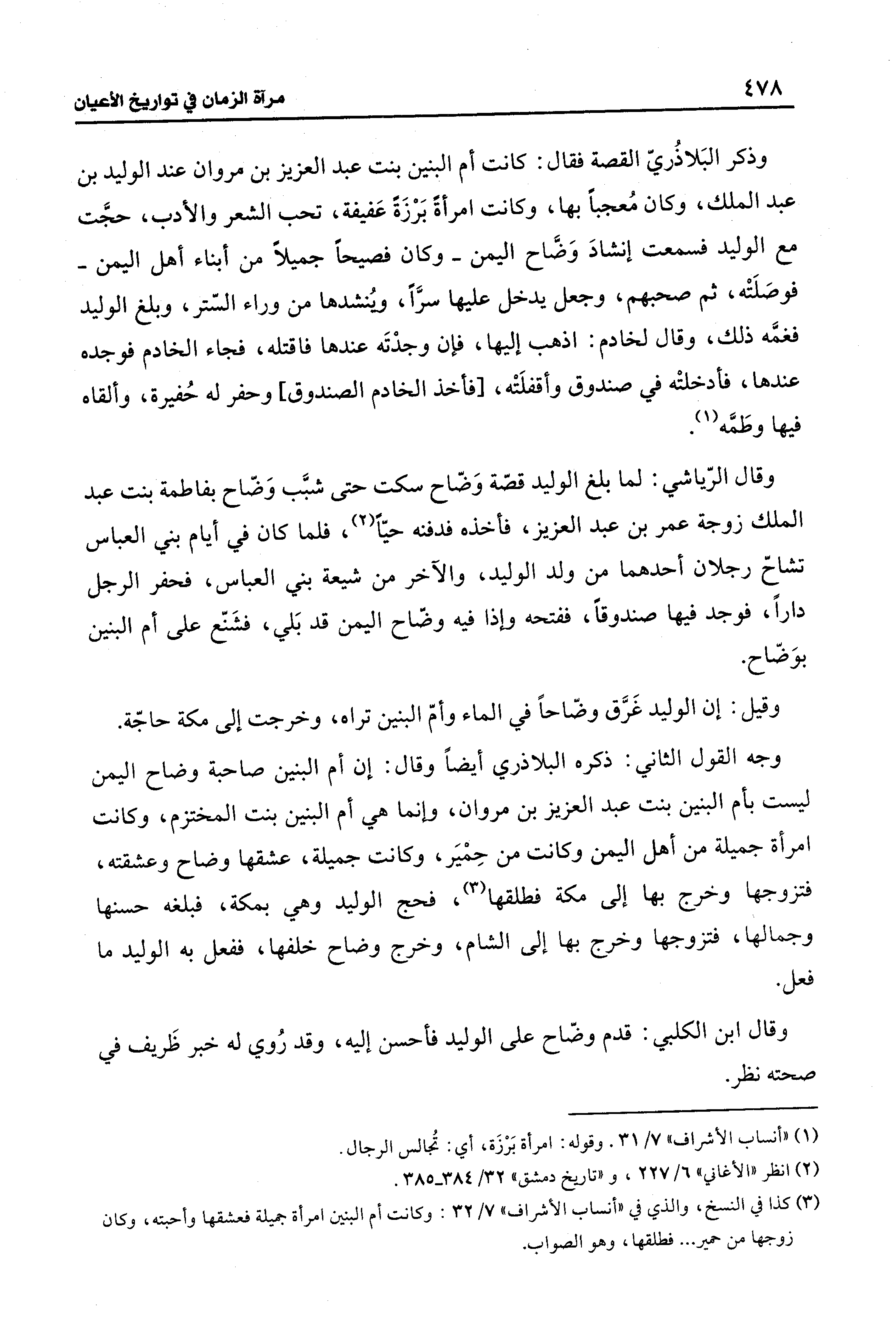 وذكر البَلاذُريّ القصة فقال: كانت أم البنين بنت عبد العزيز بن مروان عند الوليد بن عبد الملك، وكان مُعجبًا بها، وكانت امرأةً بَرْزَةً عَفيفة، تحب الشعر والأدب، حجَّت مع الوليد فسمعت إنشادَ وَضَّاح اليمن -وكان فصيحًا جميلًا من أبناء أهل اليمن- فوصَلَتْه، ثم صحبهم، وجعل يدخل عليها سرًّا، ويُنشدها من وراء السّتر، وبلغ الوليد فغمَّه ذلك، وقال لخادم: اذهب إليها، فإن وجدْتَه عندها فاقتله، فجاء الخادم فوجده عندها، فأدخلتْه في صندوق وأقفلَتْه، [فأخذ الخادم الصندوق] وحفر له حُفيرة، وألقاه فيها وطَمَّه (¬1).