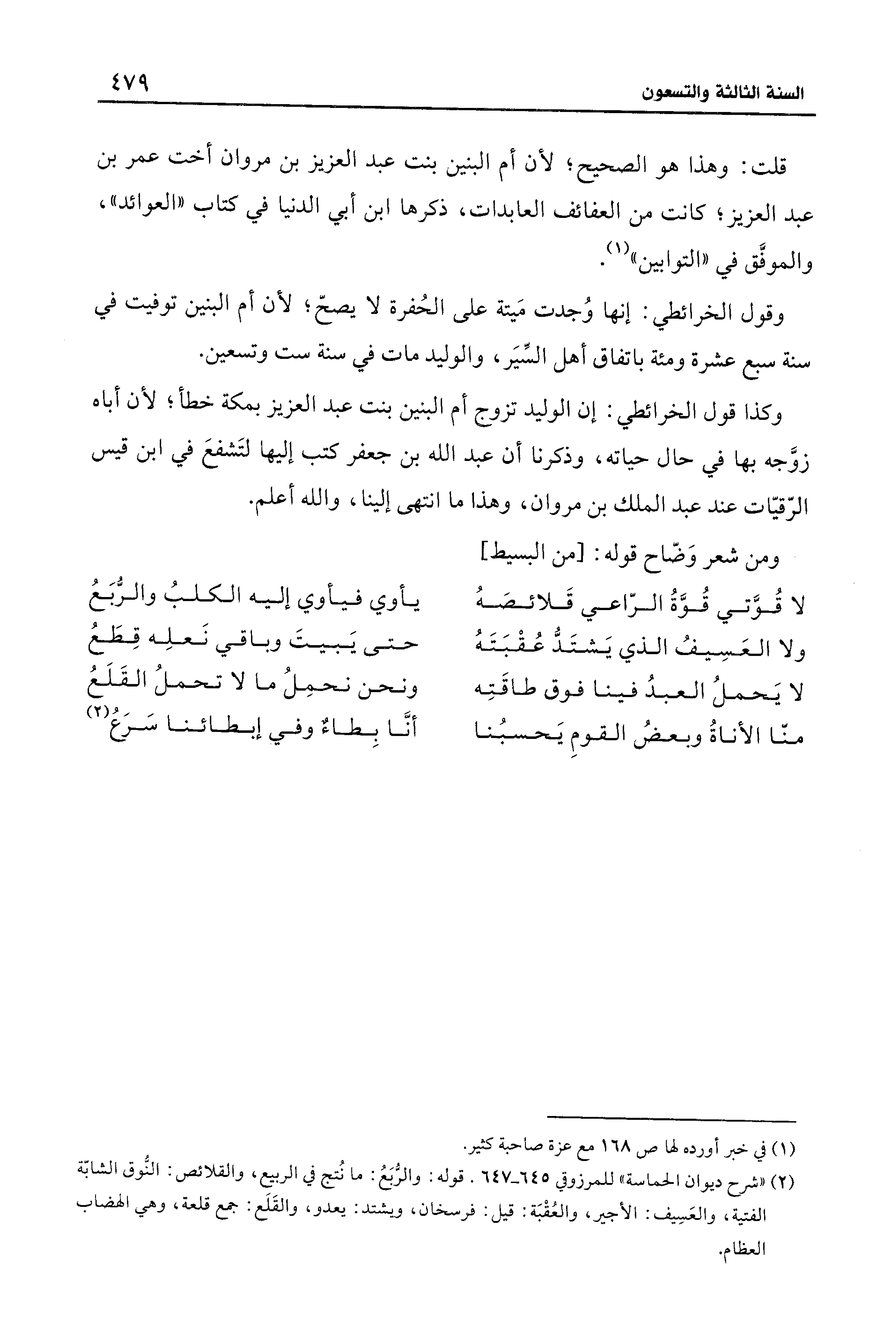 وكذا قول الخرائطي: إن الوليد تزوج أم البنين بنت عبد العزيز بمكة خطأ؛ لأن أباه زوَّجه بها في حال حياته، وذكرنا أن عبد الله بن جعفر كتب إليها لتَشفعَ في ابن قيس الرّقيّات عند عبد الملك بن مروان، وهذا ما انتهى إلينا، والله أعلم.