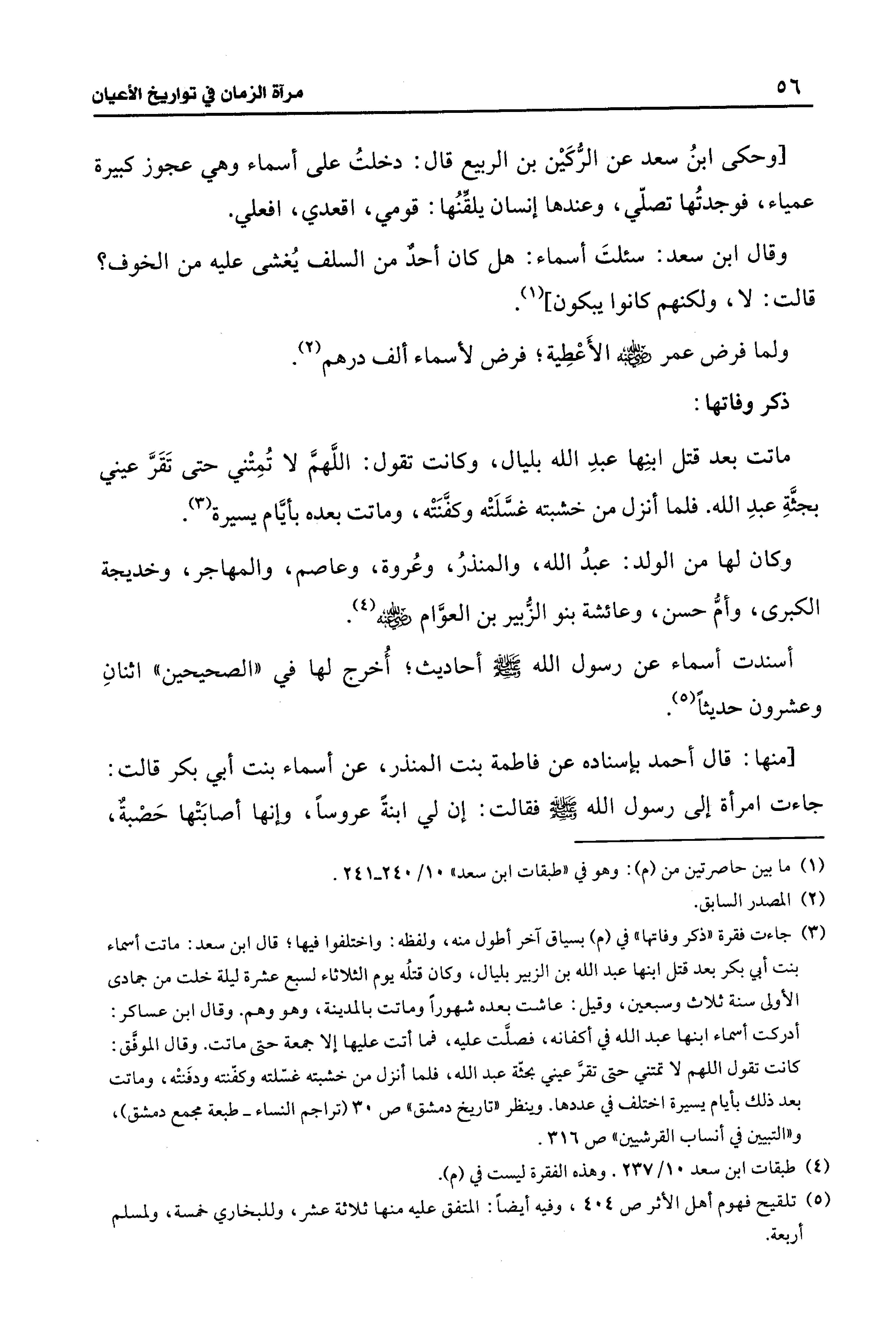 (¬3) جاءت فقرة "ذكر وفاتها" في (م) بسياق آخر أطول منه، ولفظه: واختلفوا فيها؛ قال ابن سعد: ماتت أسماء بنت أبي بكر بعد قتل ابنها عبد الله بن الزبير بليال، وكان قتلُه يوم الثلاثاء لسبع عشرة ليلة خلت من جمادى الأولى سنة ثلاث وسبعين، وقيل: عاشت بعده شهورًا وماتت بالمدينة، وهو وهم. وقال ابن عساكر: أدركت أسماء ابنها عبد الله في أكفانه، فصلَّت عليه، في أتت عليها إلا جمعة حتى ماتت. وقال الموفق: كانت تقول اللهم لا تمتني حتى تقرَّ عيني بجثَّة عبد الله، فلما أنزل من خشبته غسَّلته وكفَّنته ودفَنتْه، وماتت بعد ذلك بأيام يسيرة اختلف في عددها. وينظر "تاريخ دمشق" ص 30 (تراجم النساء- طبعة مجمع دمشق)، و"التبيين في أنساب القرشيين" ص 316.