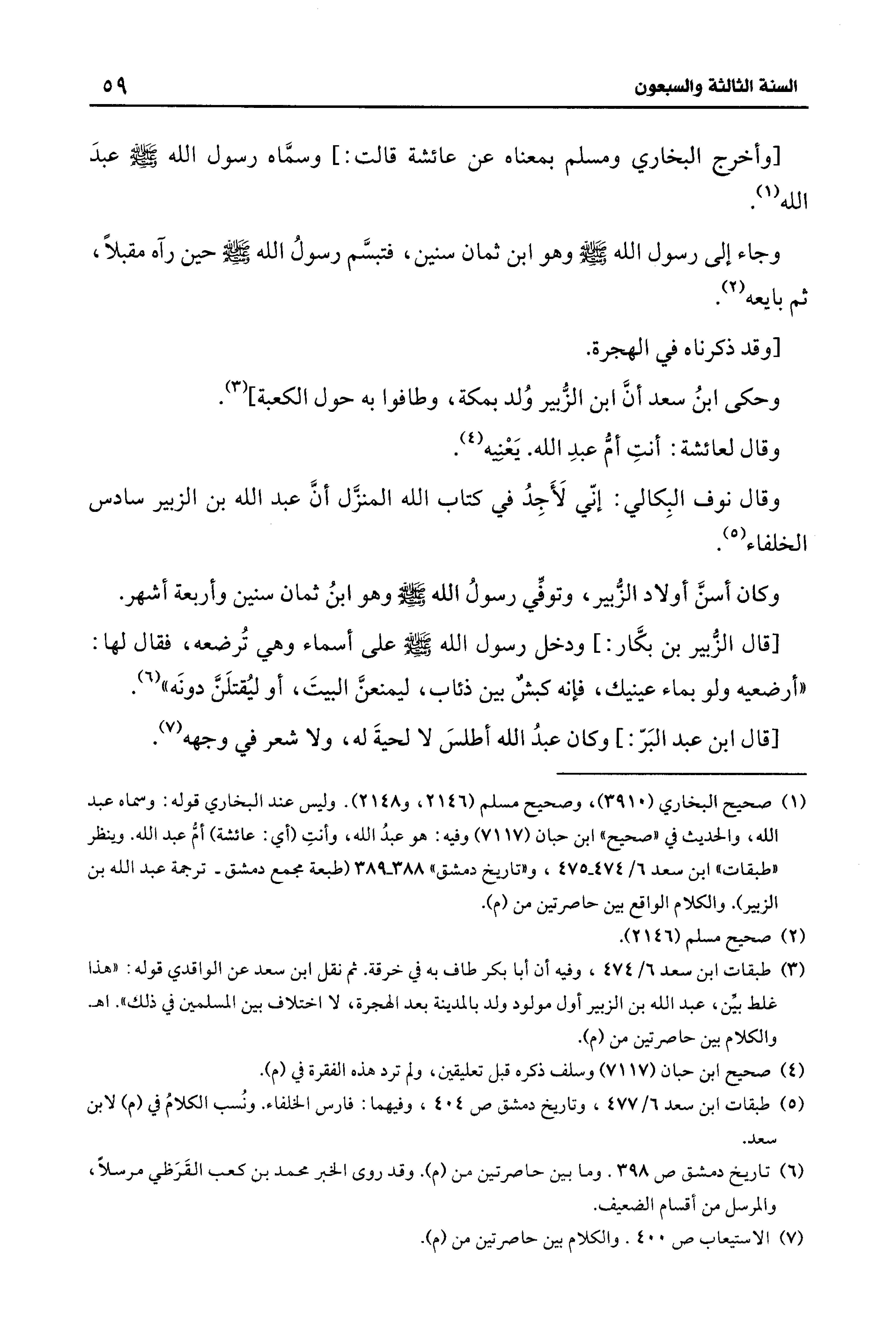 (¬3) طبقات ابن سعد 6/ 474، وفيه أن أبا بكر طاف به في خرقة. ثم نقل ابن سعد عن الواقدي قوله: "هذا غلط بيِّن، عبد الله بن الزبير أول مولود ولد بالمدينة بعد الهجرة، لا اختلاف بين المسلمين في ذلك". اهـ.