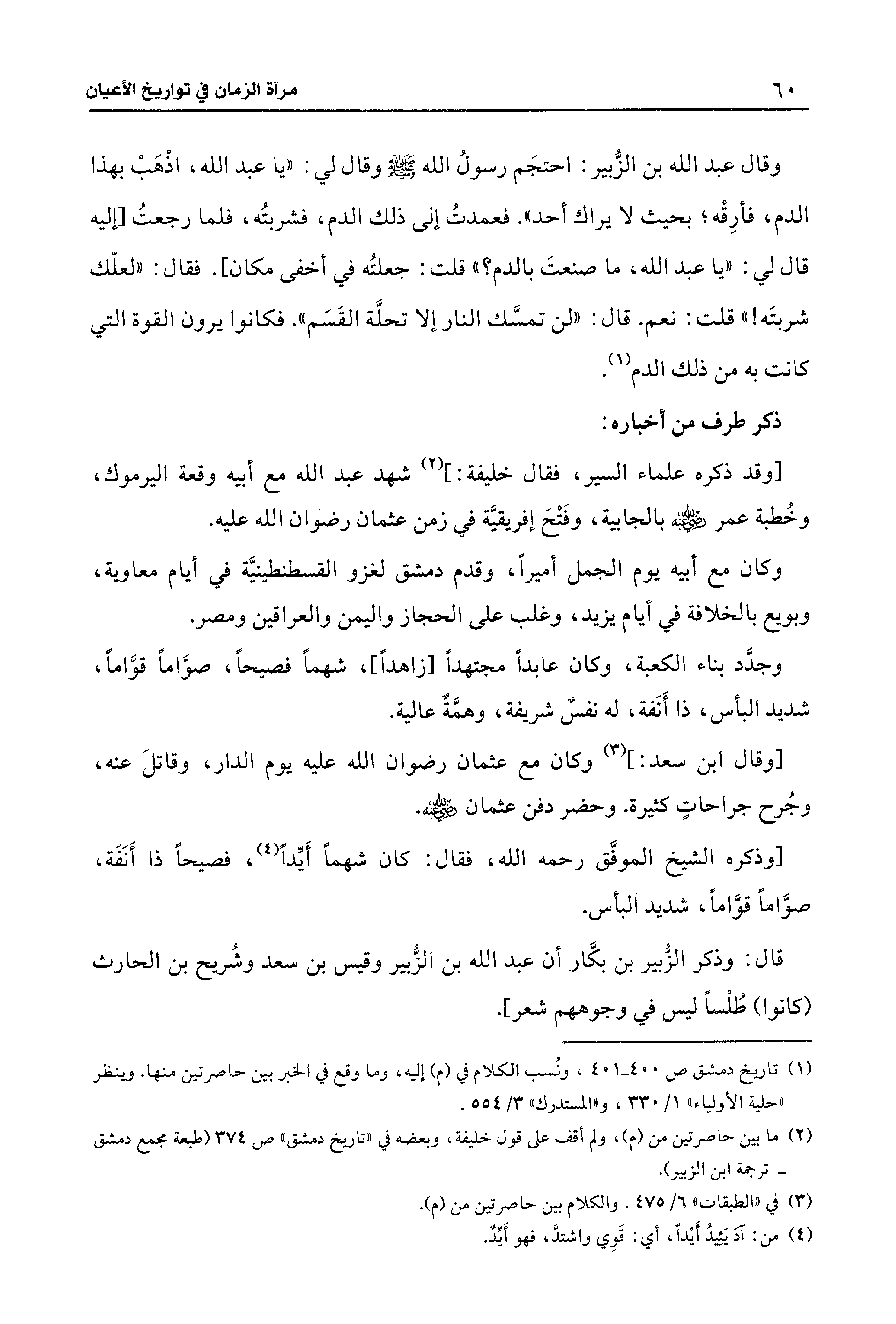 وقال عبد الله بن الزُّبير: احتجَم رسولُ الله - صلى الله عليه وسلم - وقال لي: "يا عبد الله، اذْهَبْ بهذا الدم، فأرِقْه؛ بحيث لا يراك أحد". فعمدتُ إلى ذلك الدم، فشربتُه، فلما رجعتُ [إليه قال لي: "يا عبد الله، ما صنعتَ بالدم؟ " قلت: جعلتُه في أخفى مكان]. فقال: "لعلّك شربتَه! " قلت: نعم. قال: "لن تمسَّك النار إلا تحلَّة القَسَم". فكانوا يرون القوة التي كانت به من ذلك الدم (¬1).