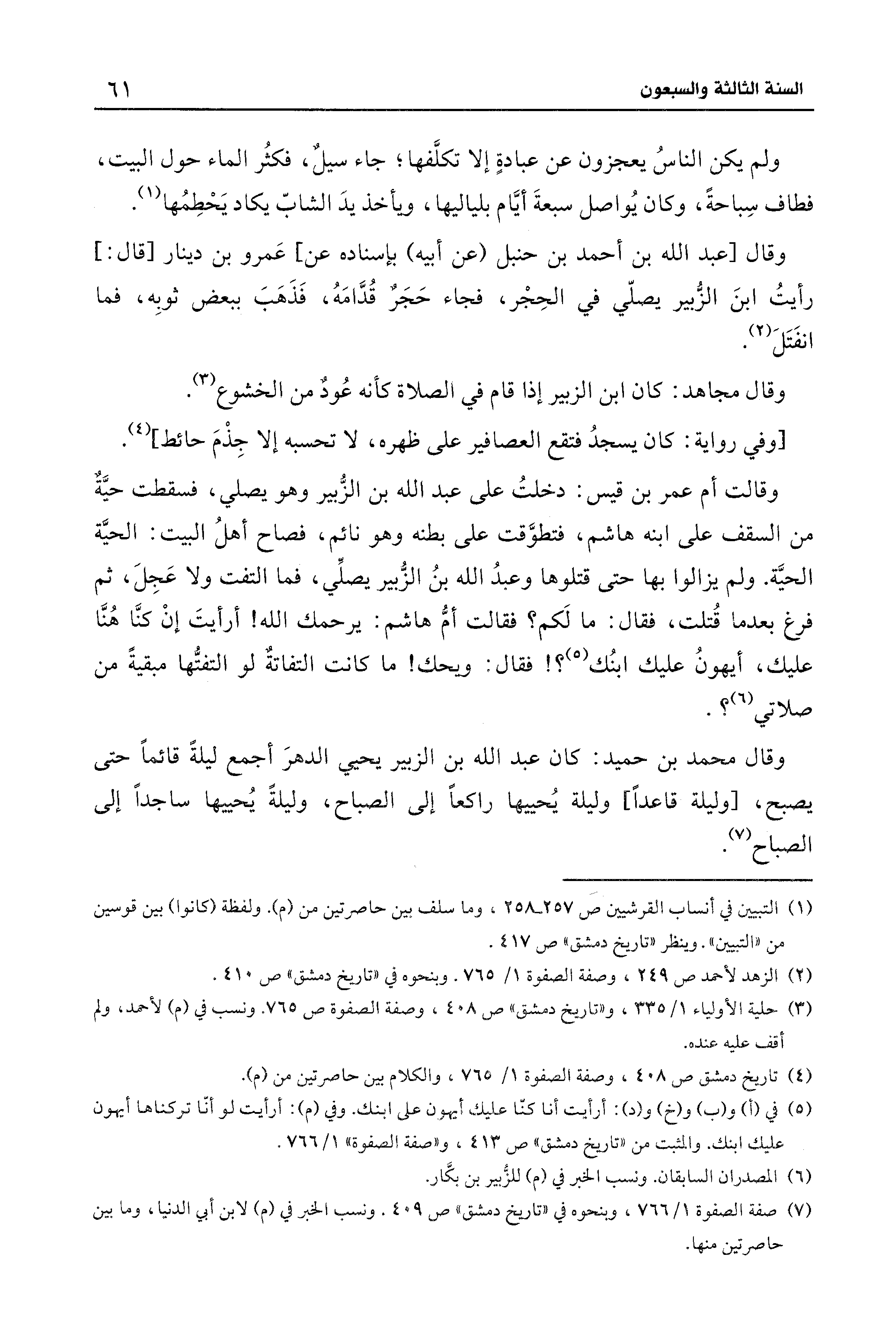 وقال محمد بن حميد: كان عبد الله بن الزبير يحيي الدهرَ أجمع ليلةً قائمًا حتَّى يصبح، [وليلة قاعدًا] وليلة يُحييها راكعًا إلى الصباح، وليلةً يُحييها ساجدًا إلى الصباح (¬7).