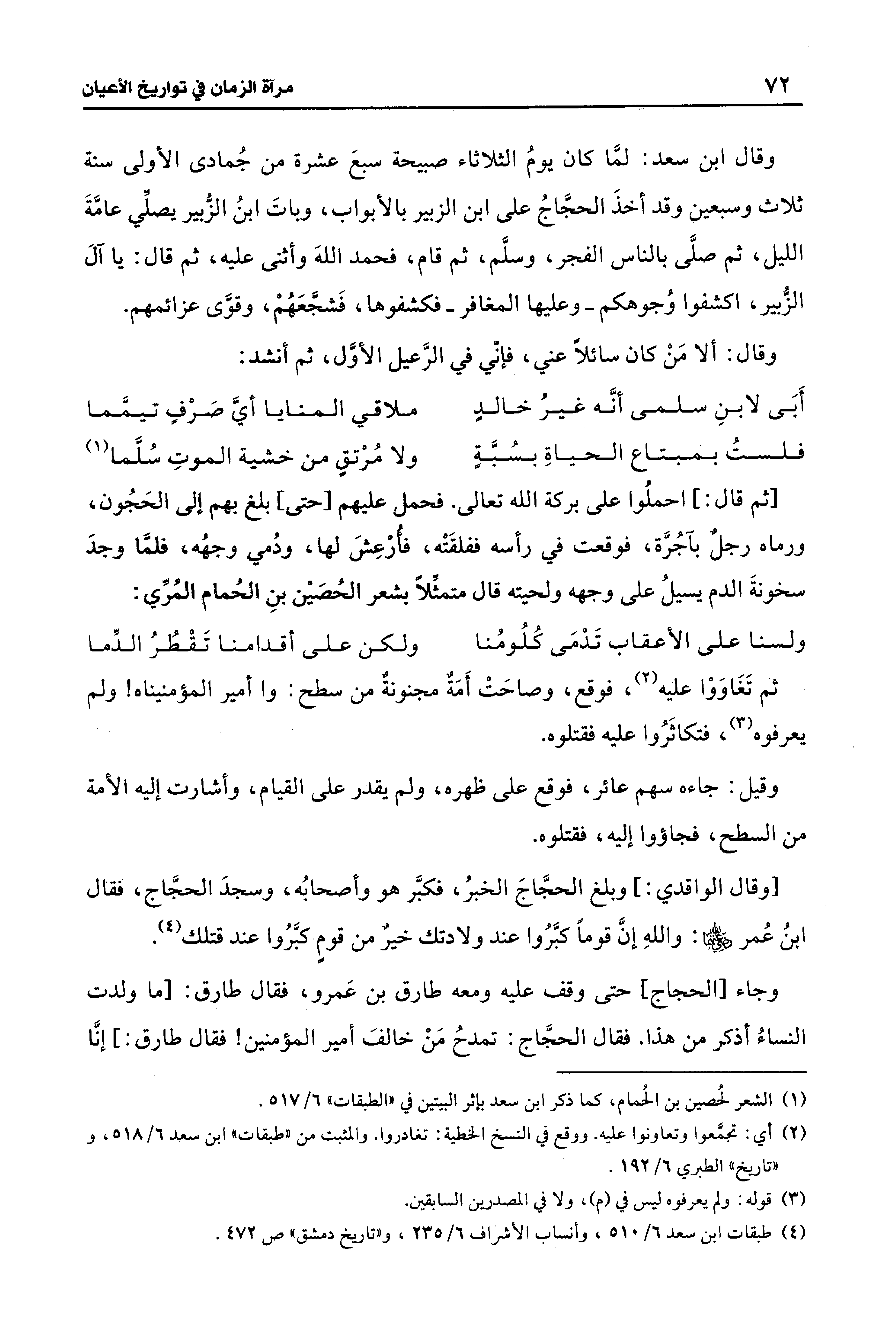 وقال ابن سعد: لمَّا كان يومُ الثلاثاء صبيحة سبعَ عشرة من جُمادى الأولى سنة ثلاث وسبعين وقد أخذَ الحجَّاجُ على ابن الزبير بالأبواب، وباتَ ابنُ الزُّبير يصلِّي عامَّةَ الليل، ثم صلَّى بالناس الفجر، وسلَّم، ثم قام، فحمد اللهَ وأثنى عليه، ثم قال: يا آلَ الزُّبير، اكشفوا وُجوهكم -وعليها المغافر- فكشفوها، فَشجَّعَهُمْ، وقوَّى عزائمهم.