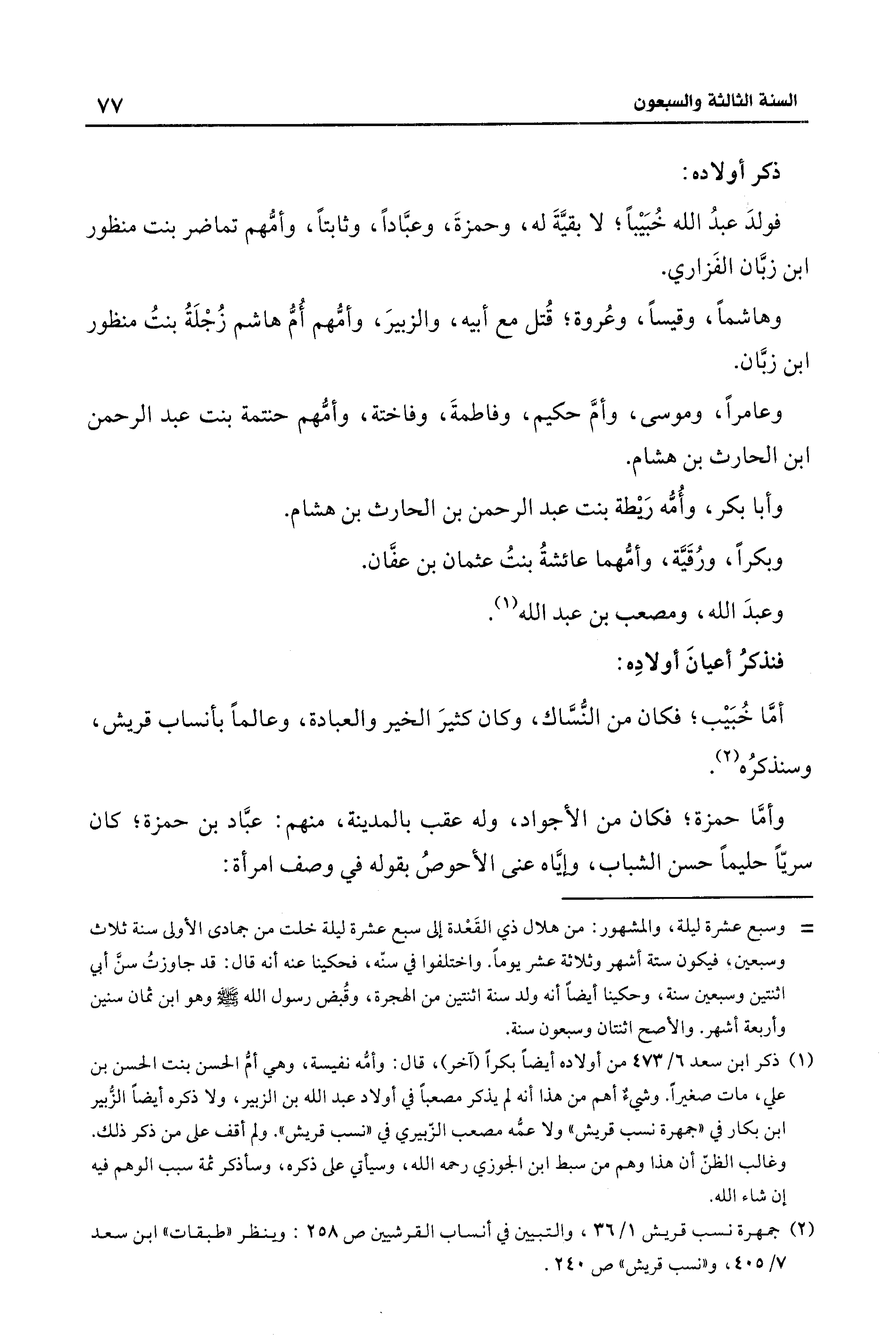 (¬1) ذكر ابن سعد 6/ 473 من أولاده أيضًا بكرًا (آخر)، قال: وأمُّه نفيسة، وهي أمُّ الحسن بنت علي، مات صغيرًا. وشيءٌ أهم من هذا أنَّه لم يذكر مصعبًا في أولاد عبد الله بن الزبير، ولا ذكره أيضًا الزُّبير بن بكار في "جمهرة نسب قريش" ولا عمُّه مصعب الزُّبيري في "نسب قريش". ولم أقف على من وغالب الظنِّ أن هذا وهم من سبط ابن الجوزي رحمه الله، وسيأتي على ذكره، وسأذكر ثمة سبب إن شاء الله.