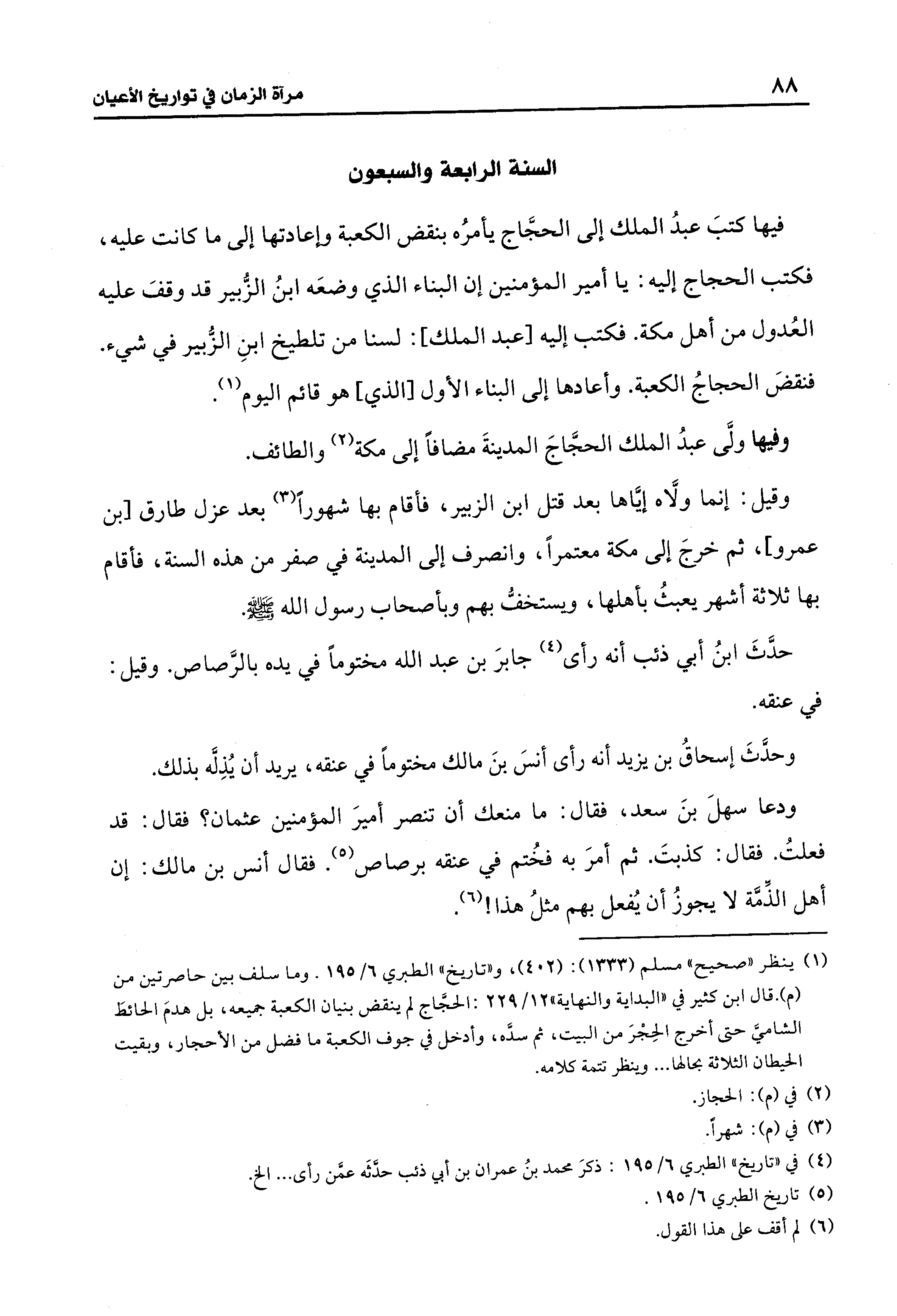 فيها كتبَ عبدُ الملك إلى الحجّاج يأمرُه بنقض الكعبة وإعادتها إلى ما كانت عليه، فكتب الحجاج إليه: يا أمير المؤمنين إن البناء الذي وضعَه ابنُ الزُّبير قد وقفَ عليه العُدول من أهل مكة. فكتب إليه [عبد الملك]: لسنا من تلطيخ ابنِ الزُّبير في شيء. فنقضَ الحجاجُ الكعبة. وأعادها إلى البناء الأول [الذي] هو قائم اليوم (¬1).