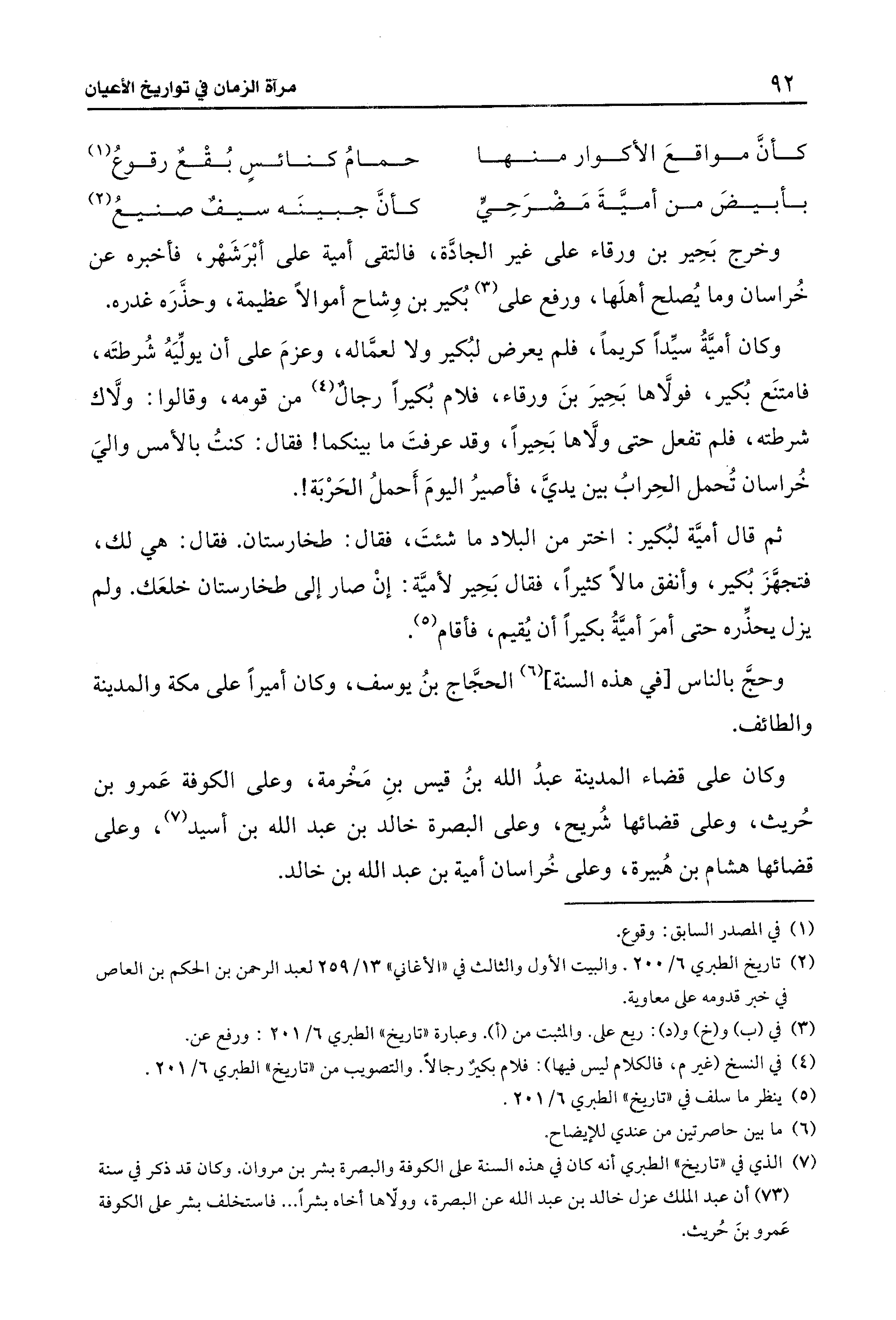 (¬7) الذي في "تاريخ" الطبري أنه كان في هذه السنة على الكوفة والبصرة بشر بن مروان. وكان قد ذكر في سنة (73) أن عبد الملك عزل خالد بن عبد الله عن البصرة، وولّاها أخاه بشرًا ... فاستخلفا بشر على الكوفة عَمرو بنَ حُريث.
