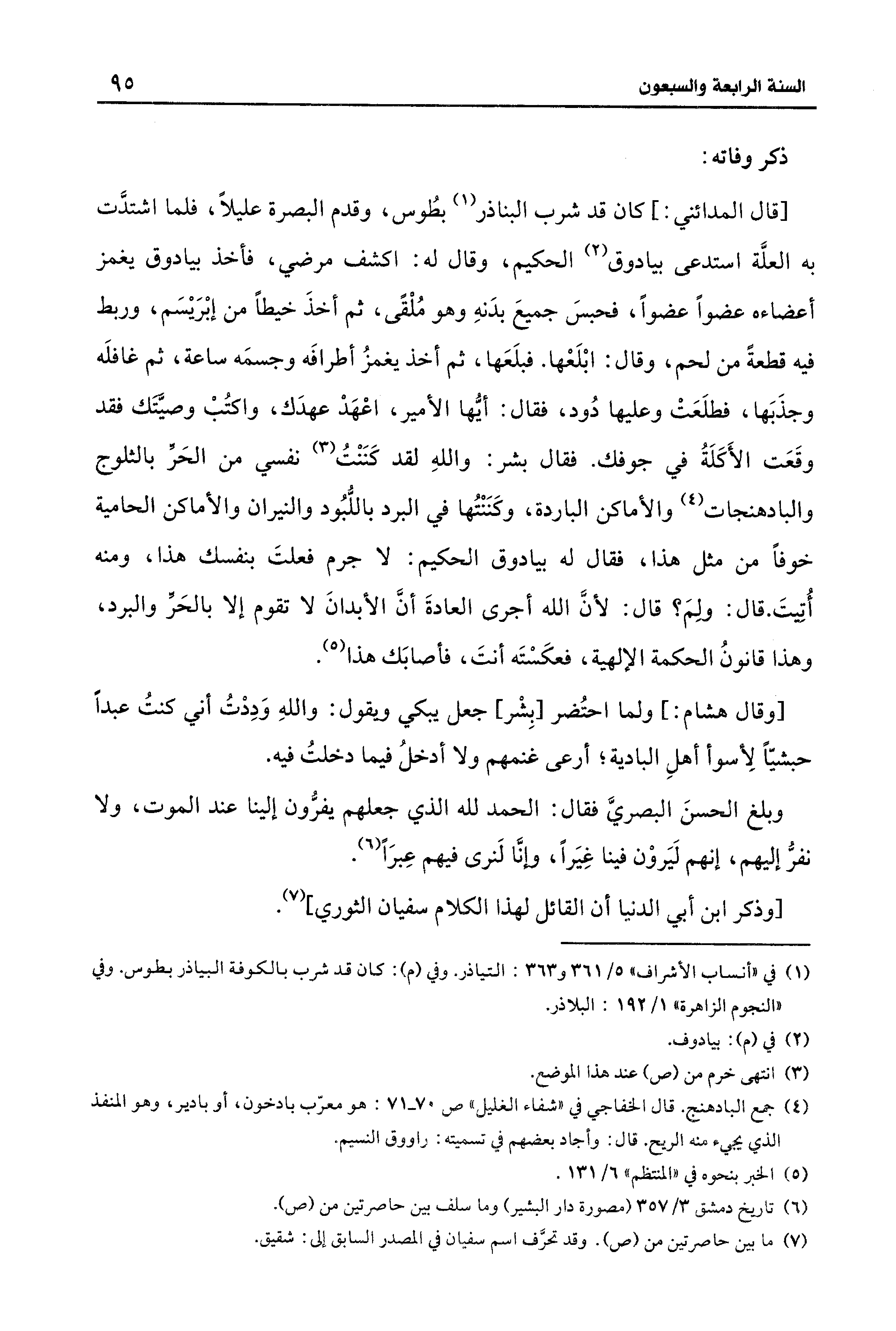 [قال المدائني: ] كان قد شرب البناذر (¬1) بطُوس، وقدم البصرة عليلًا، فلما اشتدَّت به العلَّة استدعى بيادوق (¬2) الحكيم، وقال له: اكشف مرضي، فأخذ بيادوق يغمز أعضاءه عضوًا عضوًا، فحبسَ جميعَ بدَنهِ وهو مُلْقًى، ثم أخذَ خيطًا من إبْرَيسَم، وربط فيه قطعةً من لحم، وقال: ابْلَعْها. فبلَعَها، ثم أخذ يغمزُ أطرافَه وجسمَه ساعة، ثم غافلَه وجذَبَها، فطلَعَتْ وعليها دُود، فقال: أيُّها الأمير، اعْهَدْ عهدَك، واكتُبْ وصيَّتَك فقد وقَعَت الأَكَلَةُ في جوفك. فقال بشر: واللهِ لقد كَنَنْتُ (¬3) نفسي من الحَرِّ بالثلوج والبادهنجات (¬4) والأماكن الباردة، وكَنَنْتُها في البرد باللُّبُود والنيران والأماكن الحامية خوفًا من مثل هذا، فقال له بيادوق الحكيم: لا جرم فعلتَ بنفسك هذا، ومنه أُتِيتَ. قال: ولمَ؟ قال: لأنَّ الله أجرى العادةَ أنَّ الأبدانَ لا تقوم إلا بالحَرِّ والبرد، وهذا قانونُ الحكمة الإلهية، فعكَسْتَه أنتَ، فأصابَك هذا (¬5).
