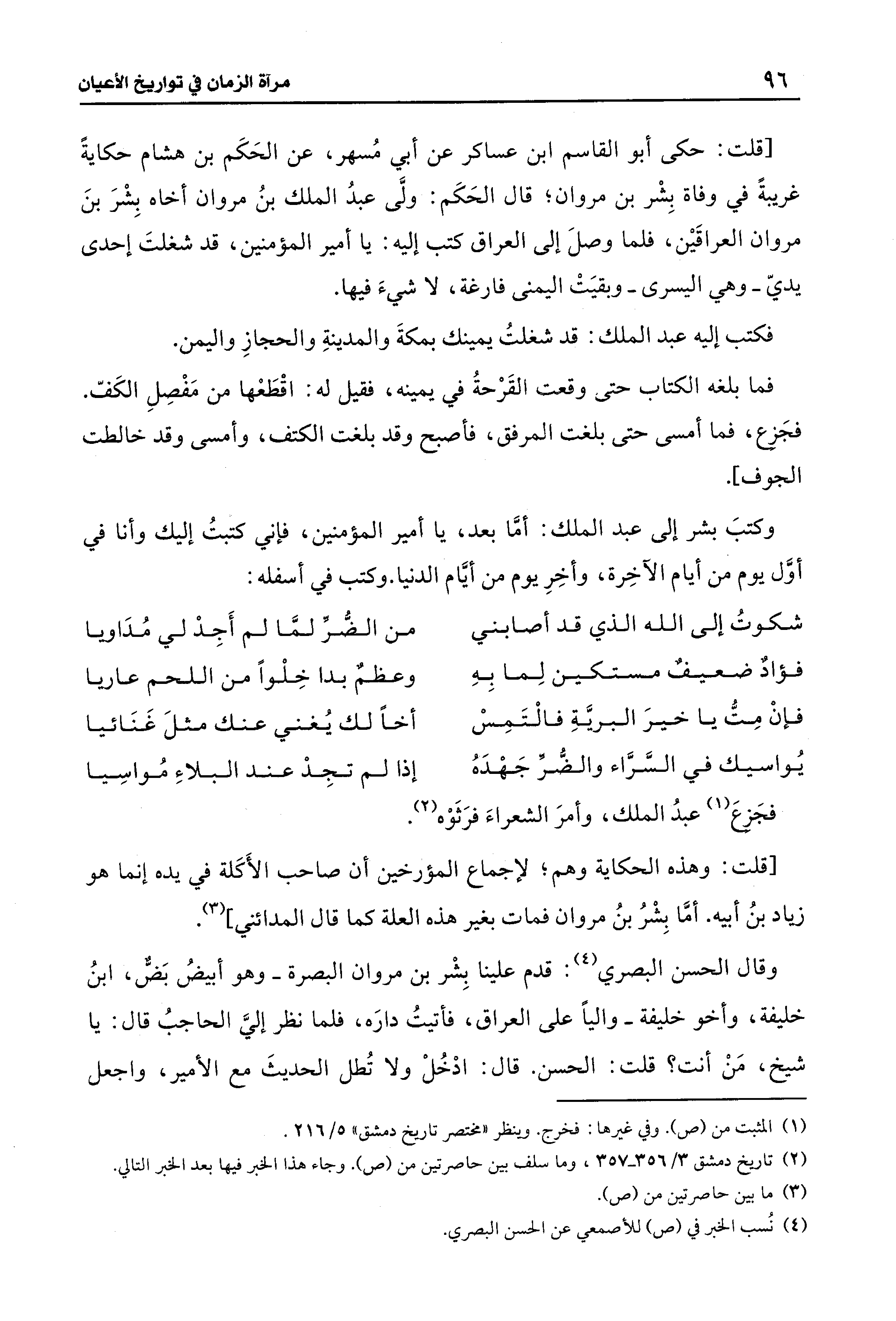 [قلت: حكى أبو القاسم ابن عساكر عن أبي مُسهر، عن الحَكَم بن هشام حكايةً غريبةً في وفاة بِشْر بن مروان؛ قال الحَكَم: ولَّى عبدُ الملك بنُ مروان أخاه بِشْرَ بنَ مروان العراقَين، فلما وصلَ إلى العراق كتب إليه: يا أمير المؤمنين، قد شغلتَ إحدى يديّ -وهي اليسرى- وبقيَتْ اليمنى فارغة، لا شيءَ فيها.