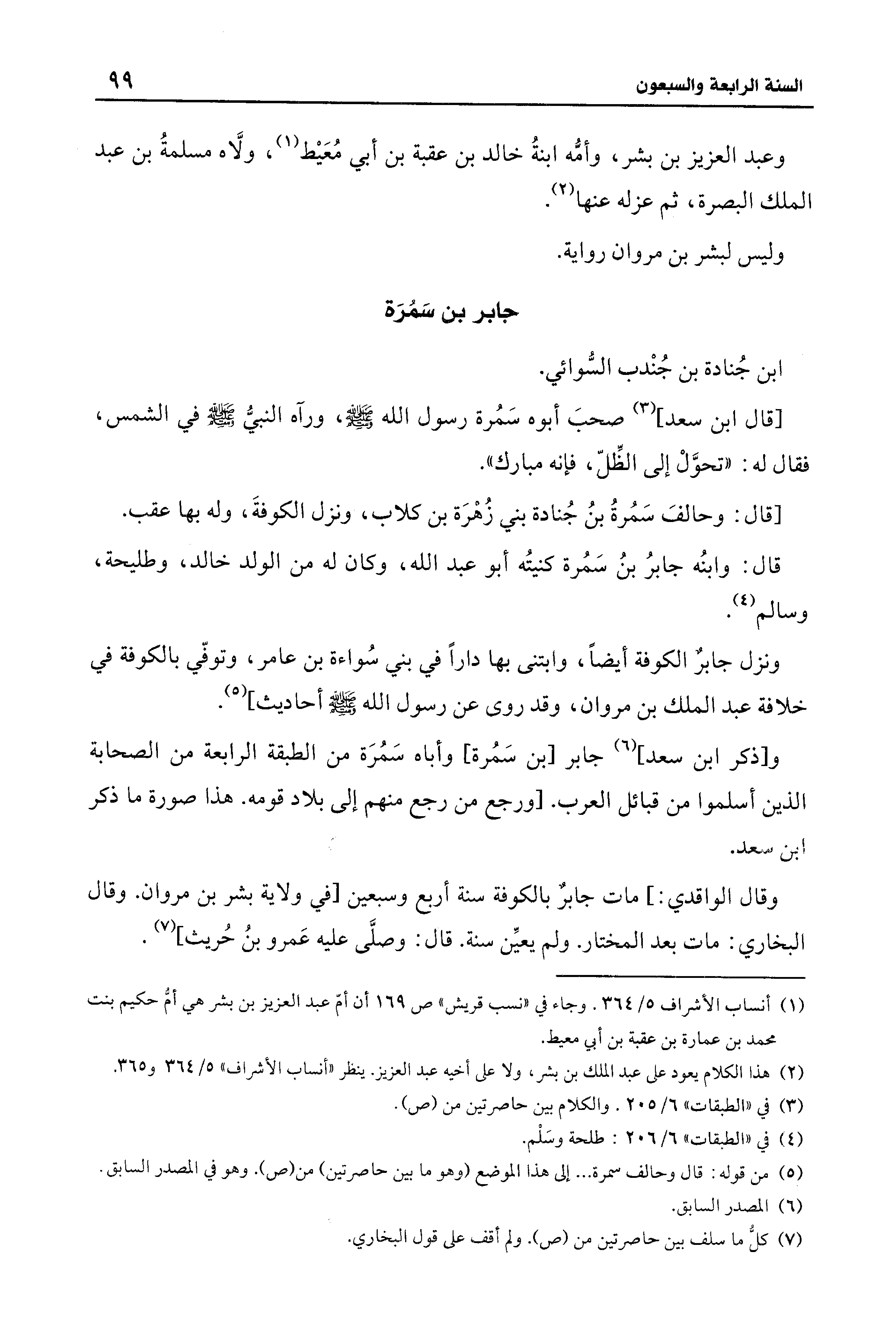و[ذكر ابن سعد] (¬6) جابر [بن سَمُرة] وأباه سَمُرَة من الطبقة الرابعة من الصحابة الذين أسلموا من قبائل العرب. [ورجع من رجع منهم إلى بلاد قومه. هذا صورة ما ذكر ابن سعد.
