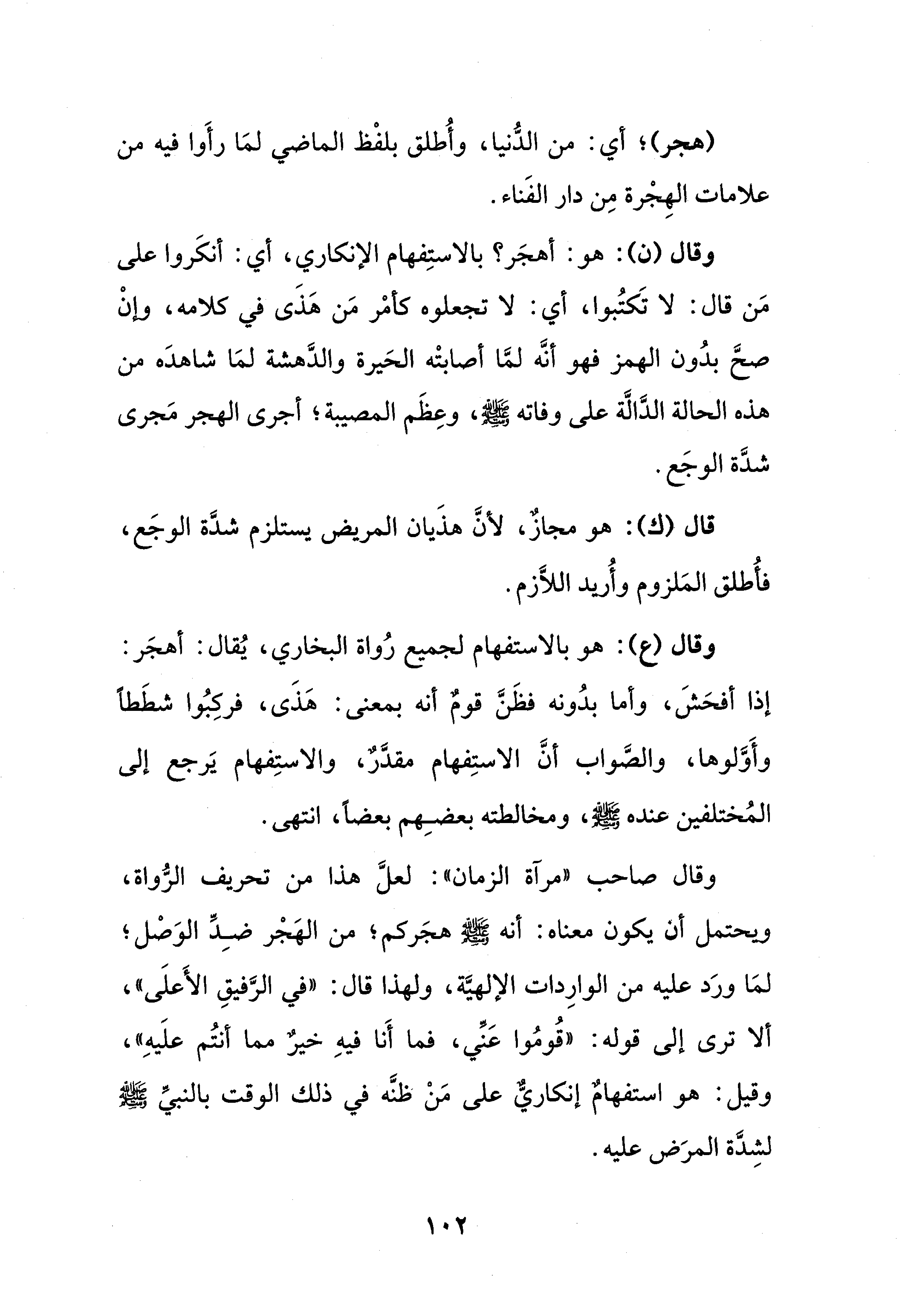 وقال (ن): هو: أهجَر؟ بالاستِفهام الإنكاري، أي: أنكَروا على مَن قال: لا تَكتُبوا، أي: لا تجعلوه كأمْر مَن هَذَى في كلامه، وإنْ صحَّ بدُون الهمز فهو أنَّه لمَّا أصابتْه الحَيرة والدَّهشة لمَا شاهدَه من هذه الحالة الدَّالَّة على وفاته - صلى الله عليه وسلم -، وعِظَم المصيبة؛ أجرى الهجر مَجرى شدَّة الوجَع.