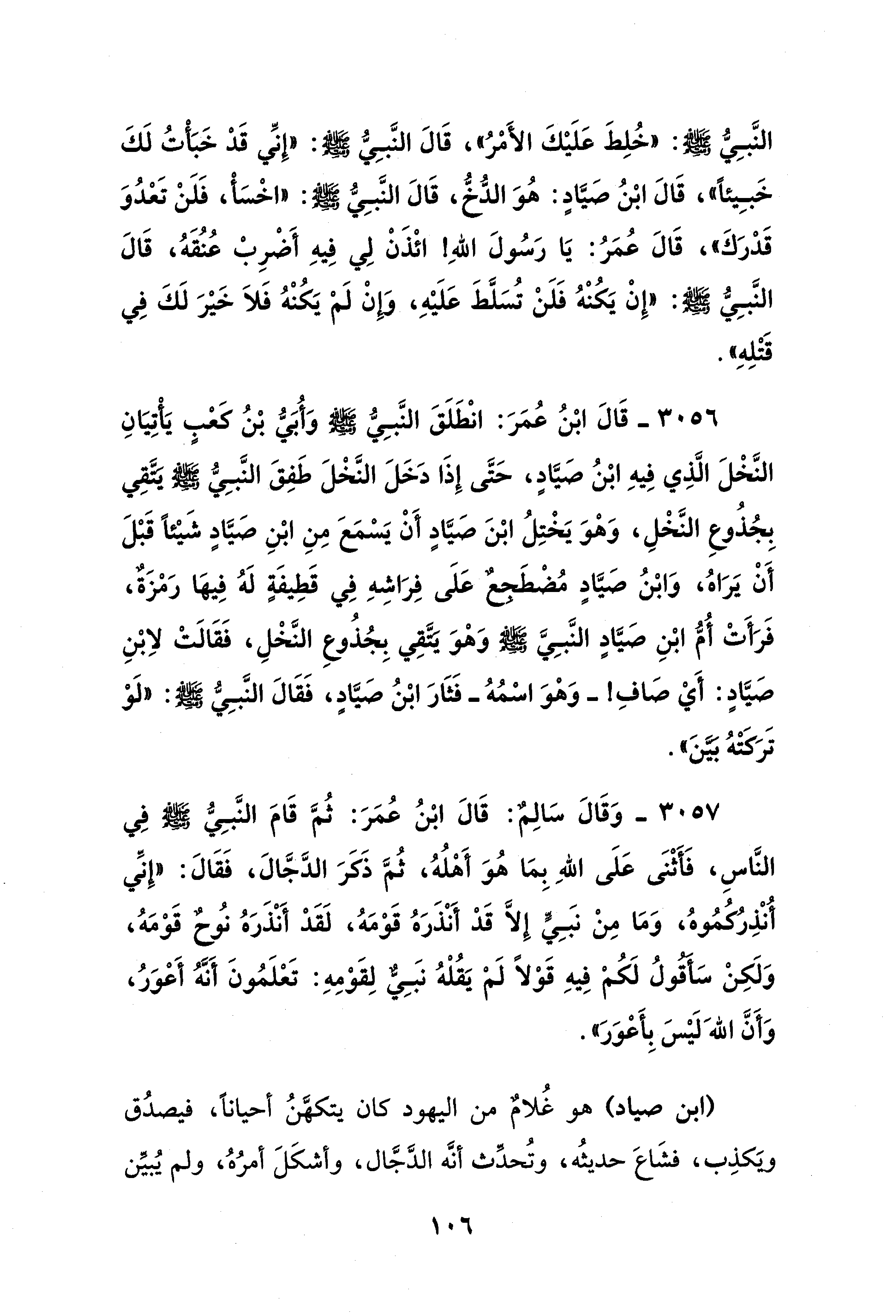 3056 - قَالَ ابْنُ عُمَرَ: انْطَلَقَ النَّبِيُّ - صَلَّى الله عَلَيْهِ وَسَلَّمَ - وَأُبَيُّ بْنُ كَعْبٍ يَأْتِيَانِ النَّخْلَ الَّذِي فِيهِ ابْنُ صَيَّادٍ، حَتَّى إِذَا دَخَلَ النَّخْلَ طَفِقَ النَّبِيُّ - صَلَّى الله عَلَيْهِ وَسَلَّمَ - يَتَّقِي بِجُذُوعِ النَّخْلِ، وَهْوَ يَخْتِلُ ابْنَ صَيَّادٍ أَنْ يَسْمَعَ مِنِ ابْنِ صَيَّادٍ شَيْئًا قَبْلَ أَنْ يَرَاهُ، وَابْنُ صيَّادٍ مُضْطَجعٌ عَلَى فِرَاشِهِ فِي قَطِيفَةٍ لَهُ فِيهَا رَمْزَةٌ، فَرَأَتْ أُمُّ ابْنِ صَيَّادٍ النَّبِيَّ - صلى الله عليه وسلم - وَهْوَ يَتَّقِي بِجُذُوعِ النَّخْلِ، فَقَالَتْ لاِبْنِ صَيَّادٍ: أَيْ صَافِ! -وَهْوَ اسْمُهُ- فَثَارَ ابْنُ صَيَّادٍ، فَقَالَ النَّبِيُّ - صَلَّى الله عَلَيْهِ وَسَلَّمَ -: "لَوْ تَرَكَتْهُ بيَّنَ".