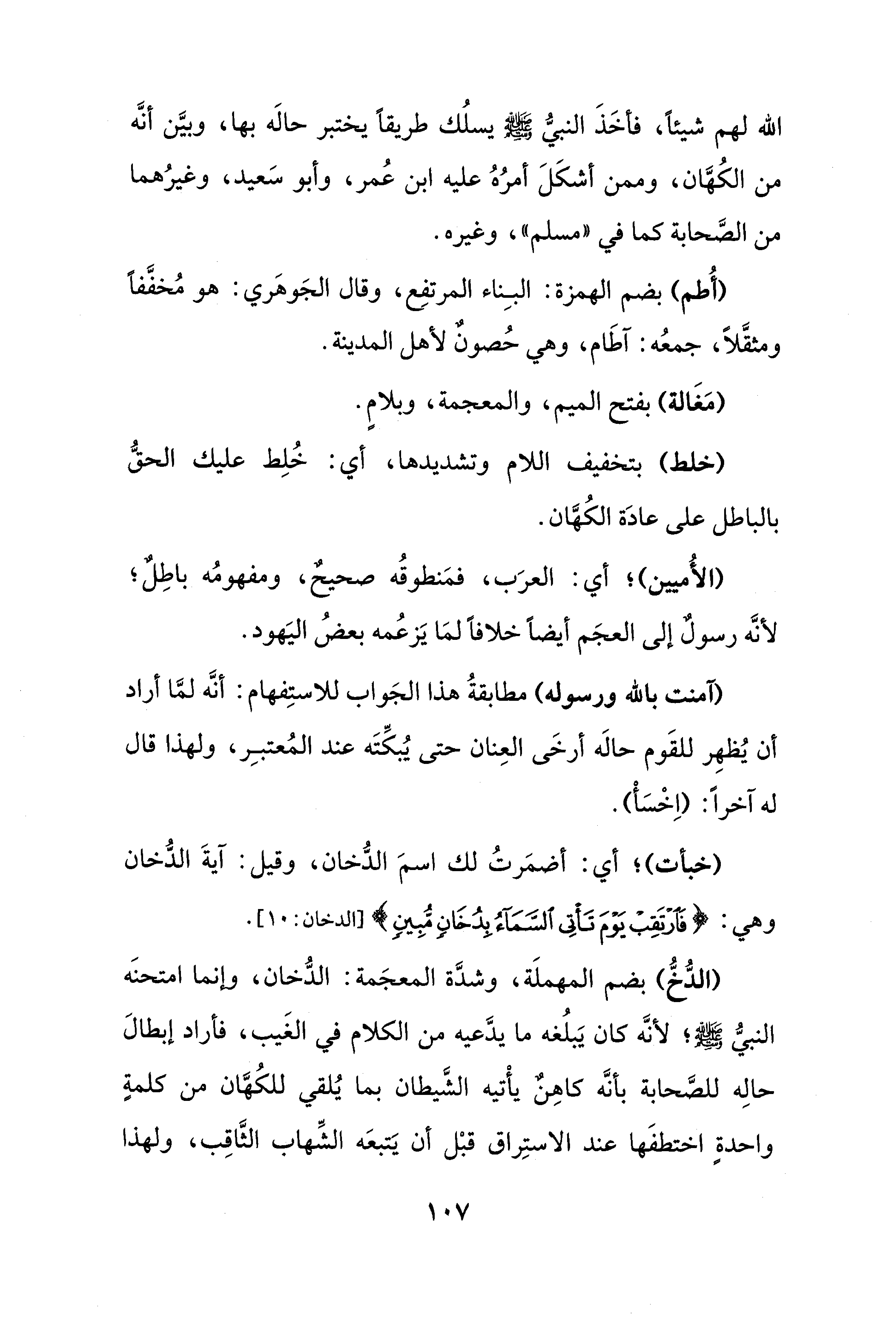 (الدُّخُّ) بضم المهملَة، وشدَّة المعجَمة: الدُّخان، وإنما امتحنَه النبيُّ - صلى الله عليه وسلم -؛ لأنَّه كان يَبلُغه ما يدَّعيه من الكلام في الغَيب، فأراد إبطالَ حالِه للصَّحابة بأنَّه كاهِنٌ يأْتيه الشَّيطان بما يُلقي للكُهَّان من كلمةٍ واحدةٍ اختطفَها عند الاستِراق قبْل أن يَتبعَه الشِّهاب الثَّاقِب، ولهذا