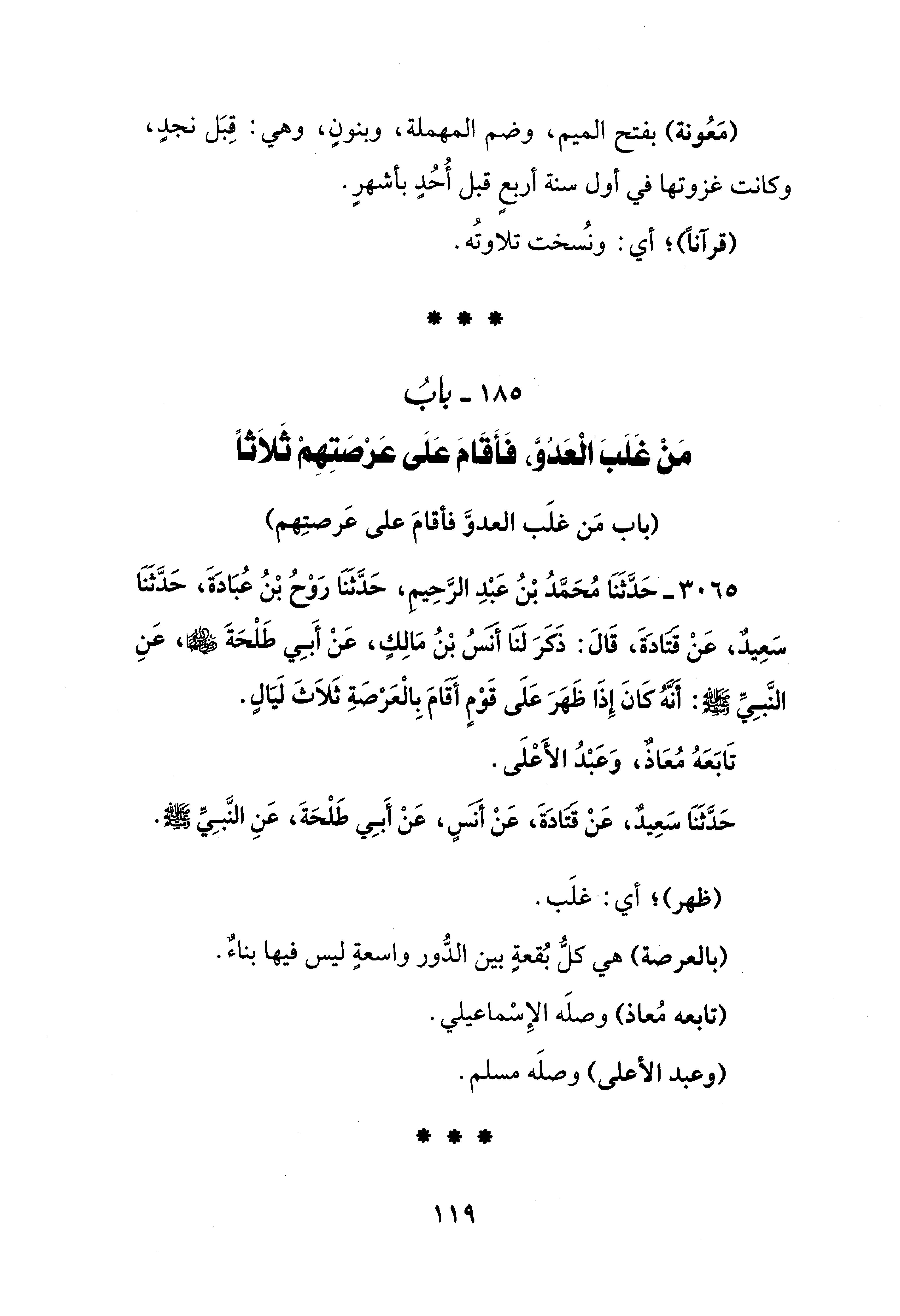 3065 - حَدَّثَنَا مُحَمَّدُ بْنُ عَبْدِ الرَّحِيم، حَدَّثَنَا رَوْحُ بْنُ عُبَادَةَ، حَدَّثَنَا سَعِيدٌ، عَنْ قتادَةَ، قَالَ: ذَكَرَ لنا أَنسُ بْنُ مَالِكٍ، عَنْ أَبِي طَلْحَةَ - رضي الله عنهما -، عَنِ النَّبِيِّ - صَلَّى الله عَلَيْهِ وَسَلَّمَ -: أنَّهُ كَانَ إِذَا ظَهَرَ عَلَى قَوْمٍ أقامَ بِالْعَرْصَةِ ثَلًاثَ لَيَالٍ.