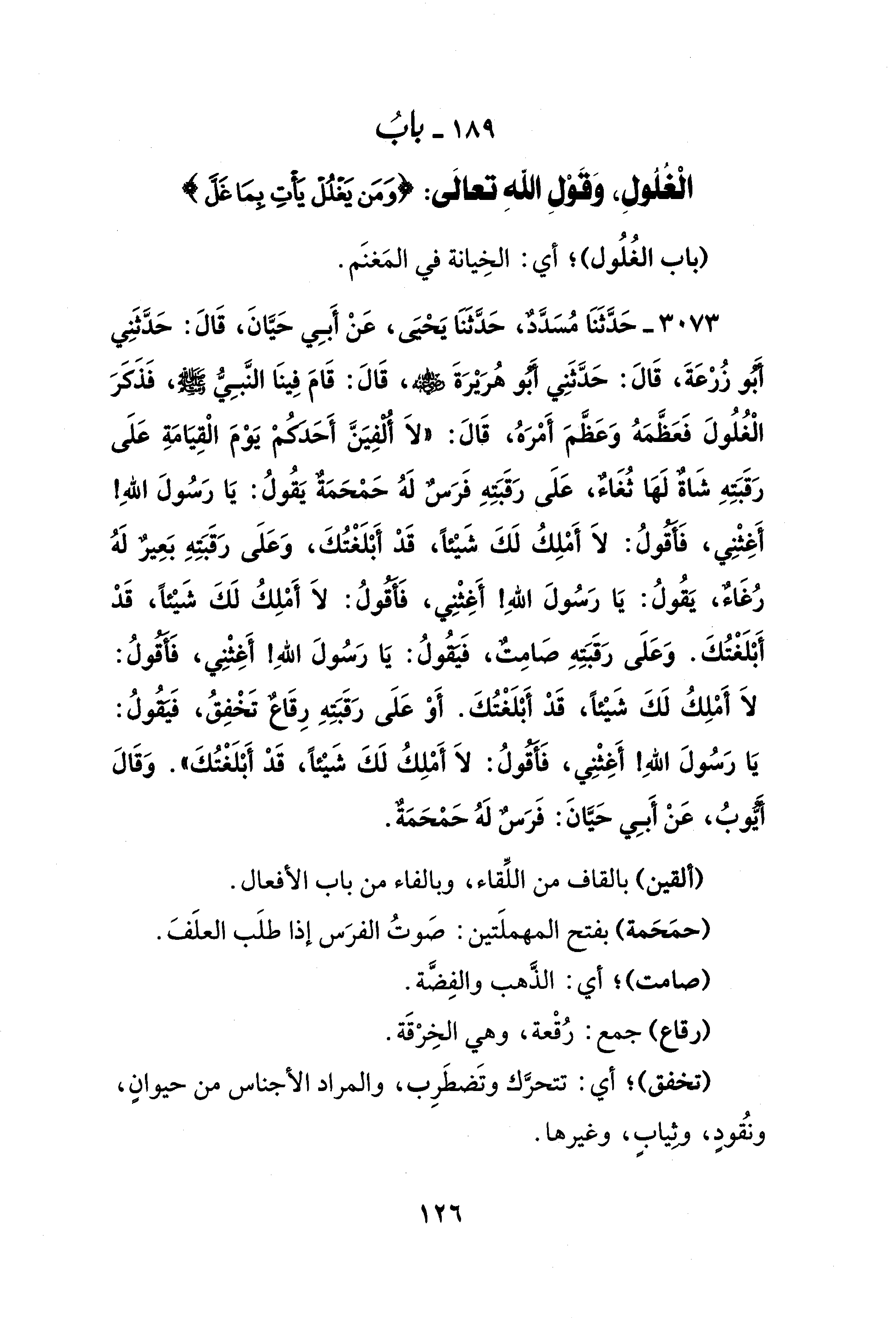 3073 - حَدَّثَنَا مُسَدَّدٌ، حَدَّثَنَا يَحْيَى، عَنْ أَبِي حَيَّانَ، قَالَ: حَدَّثَنِي أَبَو زُرْعَةَ، قَالَ: حَدَّثَنِي أَبَو هُرَيرَةَ - رضي الله عنه -، قَالَ: قَامَ فِينَا النَّبِيُّ - صَلَّى الله عَلَيْهِ وَسَلَّمَ -، فَذَكَرَ الْغُلُولَ فَعَظَّمَهُ وَعَظَّمَ أَمْرَهُ، قَالَ: "لا ألفِيَنَّ أَحَدَكُمْ يَوْمَ الْقِيَامَةِ عَلَى رَقَبَتِهِ شَاةٌ لَهَا ثُغَاءٌ، عَلَى رَقَبَتِهِ فَرَسٌ لَهُ حَمْحَمَةٌ يَقُولُ: يَا رَسُولَ اللهِ! أَغِثْنِي، فَأَقولُ: لا أَمْلِكُ لَكَ شَيْئًا، قَدْ أَبْلَغْتُكَ، وَعَلَى رَقَبَتِهِ بَعِيرٌ لَهُ رُغَاءٌ، يَقُولُ: يَا رَسُولَ اللهِ! أَغِثْنِي، فَأَقولُ: لا أَمْلِكُ لَكَ شَيْئًا، قَدْ أَبْلَغْتُكَ. وَعَلَى رَقَبَتِهِ صَامِتٌ، فَيَقُولُ: يَا رَسُولَ اللهِ! أَغِثْنِي، فَأَقولُ: لا أَمْلِكُ لَكَ شَيْئًا، قَدْ أَبْلَغْتُكَ. أَوْ عَلَى رَقَبَتِهِ رِقَاعٌ تَخْفِقُ، فَيقُولُ: يَا رَسُولَ اللهِ! أَغِثْنِي، فَأَقولُ: لا أَمْلِكُ لَكَ شَيْئًا، قَدْ أَبْلَغْتُكَ". وَقَالَ أَيُّوبُ، عَنْ أَبِي حَيَّانَ: فَرَسٌ لَهُ حَمْحَمَةٌ.
