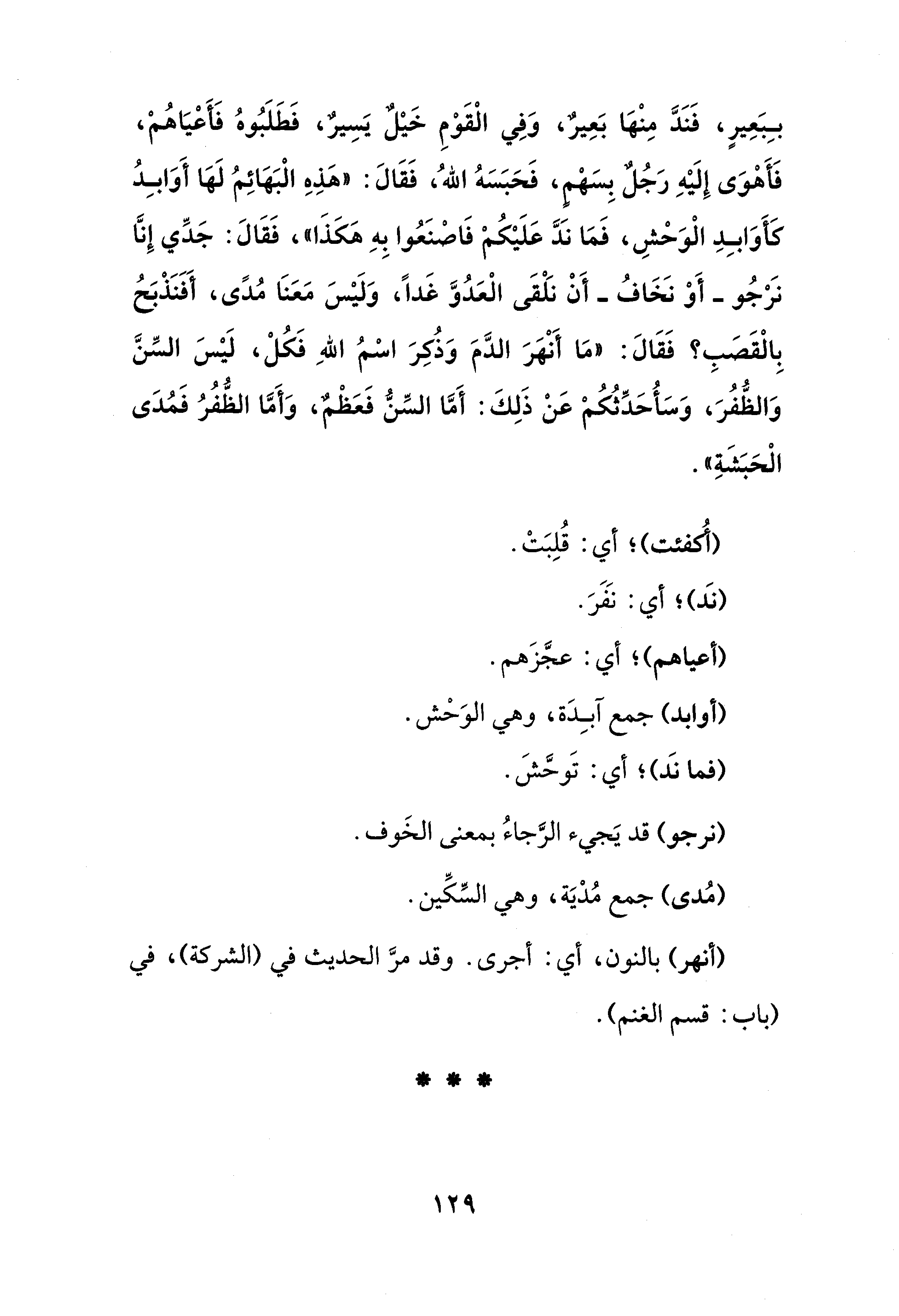 بِبَعِيرٍ، فَنَدَّ مِنْهَا بَعِيرٌ، وَفِي الْقَوْمِ خَيْل يَسِيرٌ، فَطَلَبُوهُ فَأَعْيَاهُمْ، فَأَهْوَى إِلَيْهِ رَجُلٌ بِسَهْمٍ، فَحَبَسَهُ اللهُ، فَقَالَ: "هَذِهِ الْبَهَائِمُ لَهَا أَوَابِدُ كَأَوَابِدِ الْوَحْشِ، فَمَا نَدَّ عَلَيْكُمْ فَاصْنَعُوا بِهِ هَكَذَا"، فَقَالَ: جَدِّي إِنَّا نَرْجُو -أَوْ نَخَافُ- أَنْ نلقَى الْعَدُوَّ غَدًا، وَلَيْسَ مَعَنَا مُدًى، أَفَنَذْبَحُ بِالْقَصَبِ؟ فَقَالَ: "مَا أَنْهَرَ الدَّمَ وَذُكِرَ اسْمُ اللهِ فَكُلْ، لَيْسَ السِّنَّ وَالظُّفُرَ، وَسأُحَدِّثُكُمْ عَنْ ذَلِكَ: أَمَّا السِّنُّ فَعَظْمٌ، وَأَمَّا الظُّفُرُ فَمُدَى الْحَبَشَةِ".