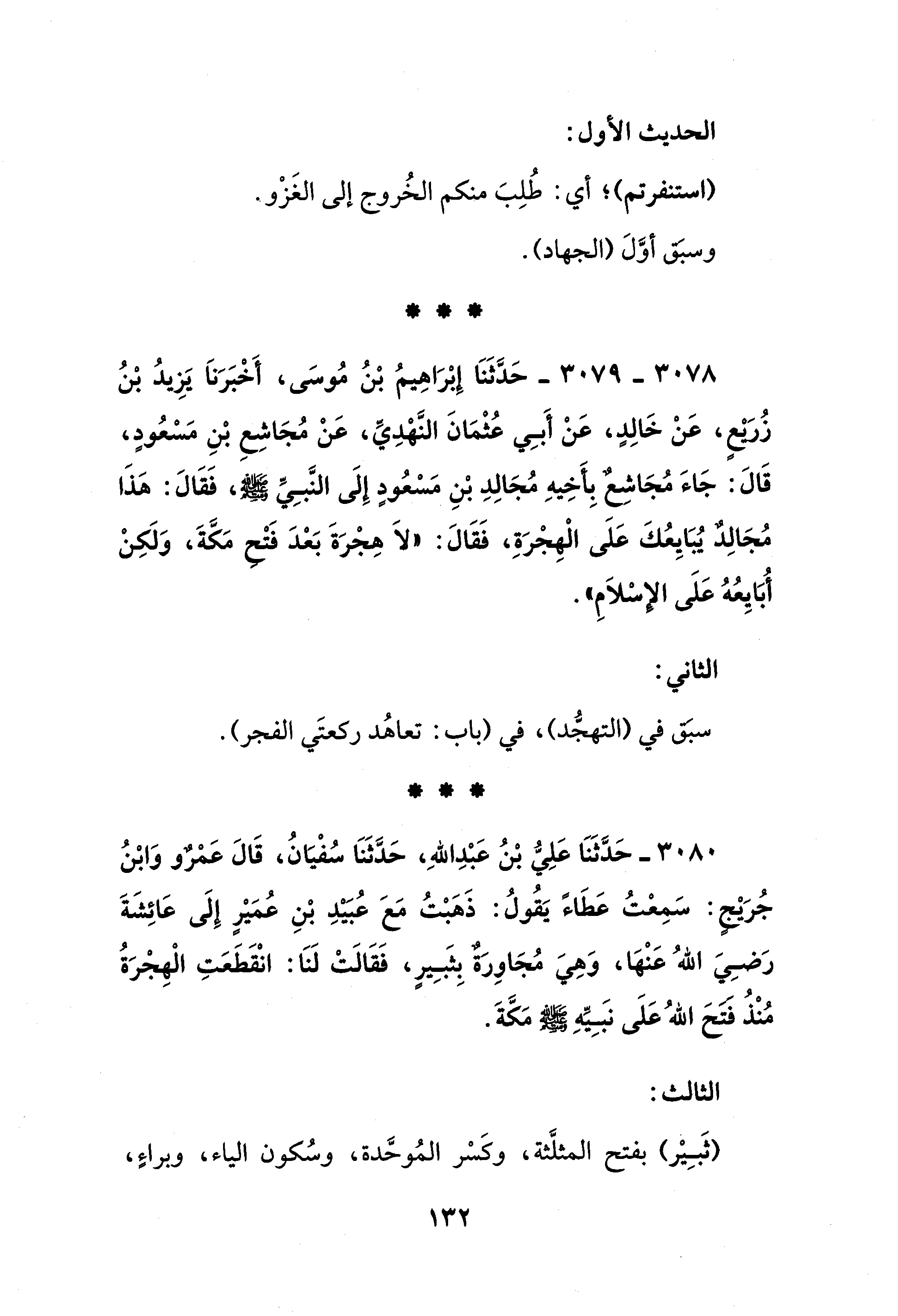 3078 - 3079 - حَدَّثَنَا إِبْرَاهِيمُ بْنُ مُوسَى، أَخْبَرَنَا يَزِيدُ بْنُ زُريعٍ، عَنْ خَالِدٍ، عَنْ أَبِي عُثْمَانَ النَّهْدِيِّ، عَنْ مُجَاشِعِ بْنِ مَسْعُودٍ، قَالَ: جَاءَ مُجَاشِعٌ بِأَخِيهِ مُجَالِدِ بْنِ مَسْعُودٍ إِلَى النَّبِيِّ - صلى الله عليه وسلم -، فَقَالَ: هَذَا مُجَالِدٌ يُبَايِعُكَ عَلَى الْهِجْرَةِ، فَقَالَ: "لا هِجْرَةَ بَعْدَ فَتْح مَكَّةَ، وَلَكِنْ أُبَايِعُهُ عَلَى الإِسْلَامِ".