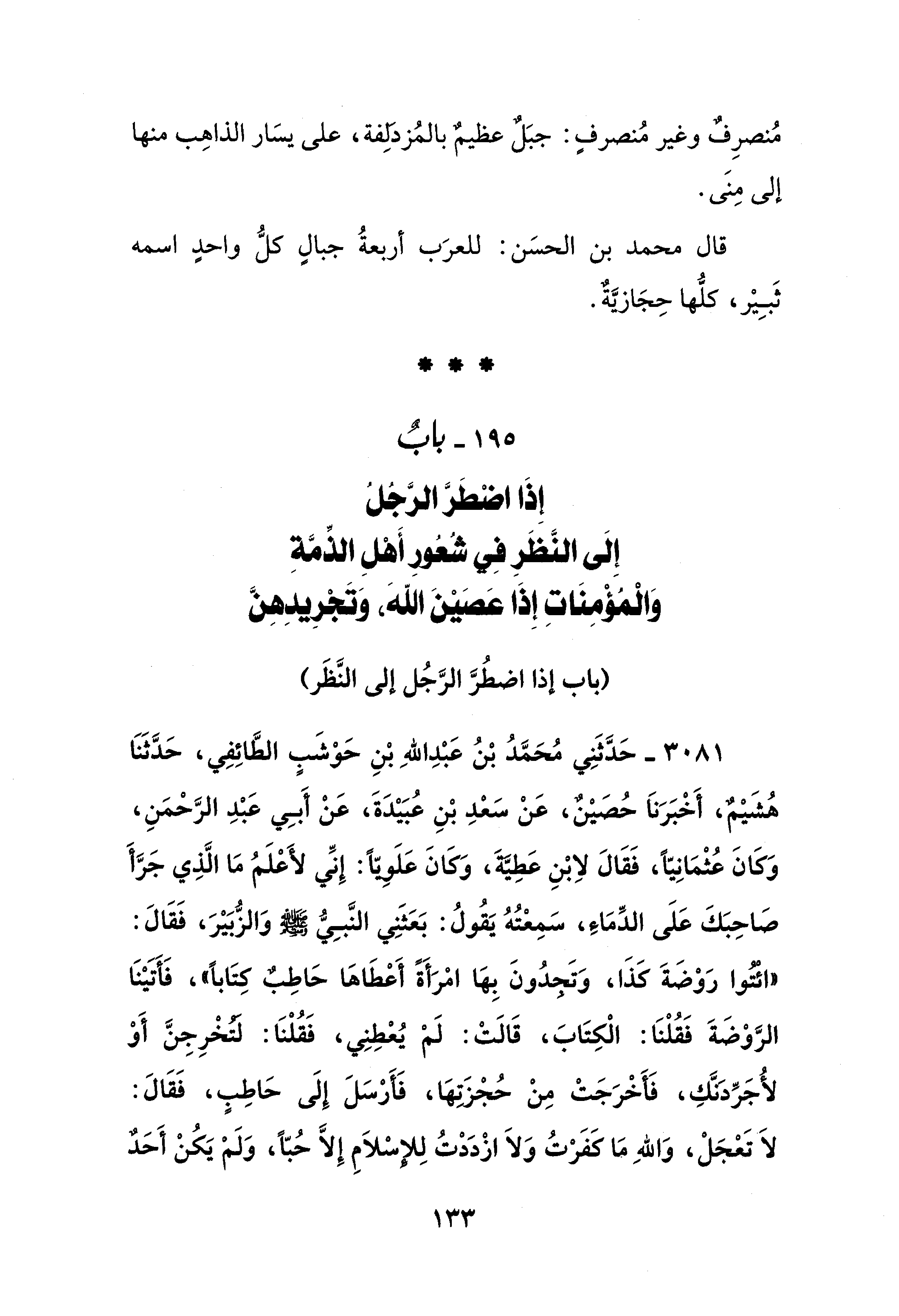 3081 - حَدَّثَنِي مُحَمَّدُ بْنُ عَبْدِ اللهِ بْنِ حَوْشَبٍ الطَّائِفِي، حَدَّثَنَا هُشَيْمٌ، أَخْبَرَنَا حُصَيْن، عَنْ سَعْدِ بْنِ عُبَيْدَةَ، عَنْ أَبِي عَبْدِ الرَّحْمَنِ، وَكَانَ عُثْمَانِيًّا، فَقَالَ لاِبْنِ عَطِيَّةَ، وَكَانَ عَلَوِيًّا: إِنِّي لأَعْلَمُ مَا الَّذِي جَرَّأَ صَاحِبَكَ عَلَى الدِّمَاءِ، سَمِعْتُهُ يَقُولُ: بَعَثنَي النَّبِيُّ - صَلَّى الله عَلَيْهِ وَسَلَّمَ - وَالزُّبَيْرَ، فَقَالَ: "ائْتُوا رَوْضَةَ كَذَا، وَتَجدُونَ بِهَا امْرَأَةً أَعْطَاهَا حَاطِبٌ كِتَابًا"، فَأَتَيْنَا الرَّوْضَةَ فَقُلْنَا: الْكِتَابَ، قَالَتْ: لَمْ يُعْطِنِي، فَقُلْنَا: لتخْرِجِنَّ أَوْ لأُجَرِّدَنَّكِ، فَأَخْرَجَتْ مِنْ حُجْزَتِهَا، فَأَرْسَلَ إِلَى حَاطِبٍ، فَقَالَ: لا تَعْجَلْ، وَاللهِ مَا كفَرْتُ وَلَا ازْدَدْتُ لِلإسْلَامِ إلا حُبًّا، وَلَمْ يَكُنْ أَحَدٌ