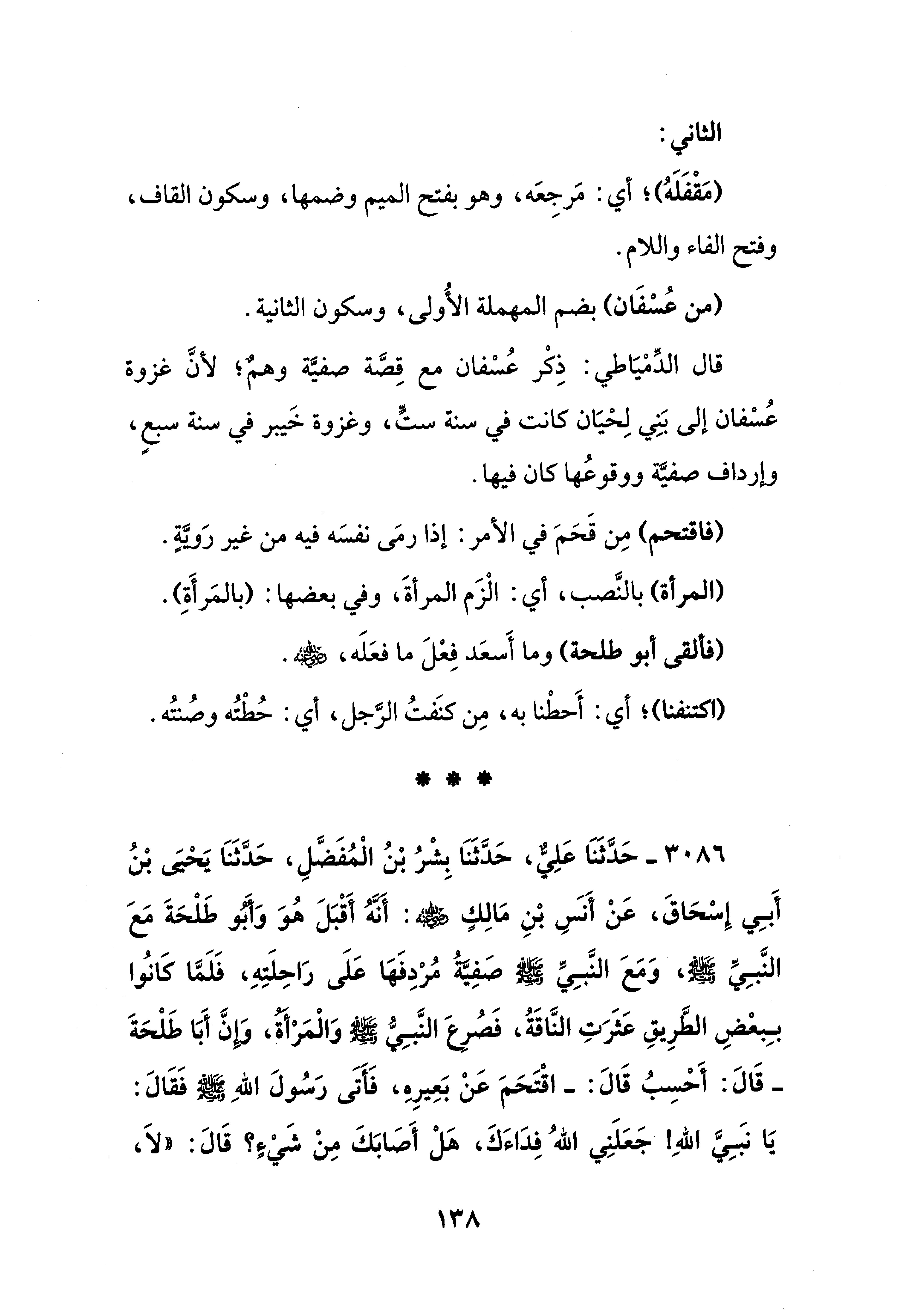 3086 - حَدَّثَنَا عَلِيٌّ، حَدَّثَنَا بِشْرُ بْنُ الْمُفَضَّلِ، حَدَّثَنَا يَحْيَى بْنُ أَبِي إِسْحَاقَ، عَنْ أَنس بْنِ مَالِكٍ - رضي الله عنه -: أَنَّهُ أَقْبَلَ هُوَ وَأَبُو طَلْحَةَ مَعَ النَّبِيِّ - صَلَّى الله عَلَيْهِ وَسَلَّمَ -، وَمَعَ النَّبِيِّ - صلى الله عليه وسلم - صَفِيَّةُ مُرْدِفَهَا عَلَى رَاحِلَتِهِ، فَلَمَّا كَانُوا بِبعْضِ الطَّرِيقِ عَثَرَتِ النَّاقَةُ، فَصُرِعَ النَّبِيُّ - صلى الله عليه وسلم - وَالْمَرْأَةُ، وَإِنَّ أَبَا طَلْحَةَ -قَالَ: أَحْسِبُ قَالَ:- اقْتَحَمَ عَنْ بَعِيرِهِ، فَأَتَى رَسُولَ اللهِ - صَلَّى الله عَلَيْهِ وَسَلَّمَ - فَقَالَ: يَا نبَيَّ اللهِ! جَعَلَنِي اللهُ فِدَاءَكَ، هَلْ أَصَابَكَ مِنْ شَيْءٍ؟ قَالَ: "لا،
