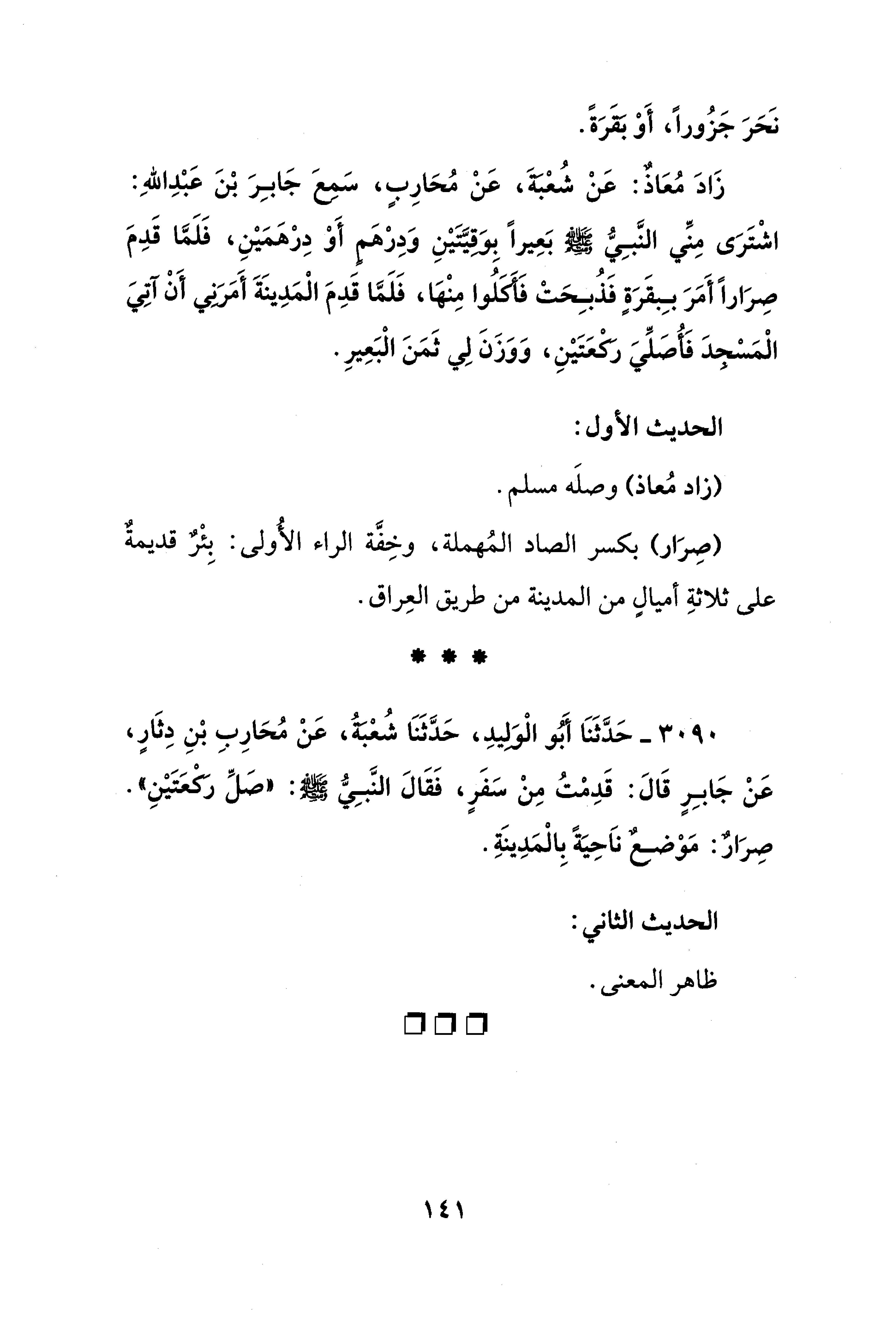 زَادَ مُعَاذٌ: عَنْ شُعْبَةَ، عَنْ مُحَارِبٍ، سَمِعَ جَابِرَ بْنَ عَبْدِ اللهِ: اشْتَرَى مِنَّي النَّبِيُّ - صلى الله عليه وسلم - بَعِيرًا بِوَقيَّتَيْنِ وَدِرْهَم أَوْ دِرْهَمَيْنِ، فَلَمَّا قَدِمَ صِرَارًا أَمَرَ بِبقَرَةٍ فَذُبِحَتْ فَأَكَلُوا مِنْهَا، فَلَمَّا قَدِمَ الْمَدِينَةَ أَمَرَنِي أَنْ آتِيَ الْمَسْجدَ فَأُصَلِّيَ رَكعَتَيْنِ، وَوَزَنَ لِي ثَمَنَ الْبَعِيرِ.