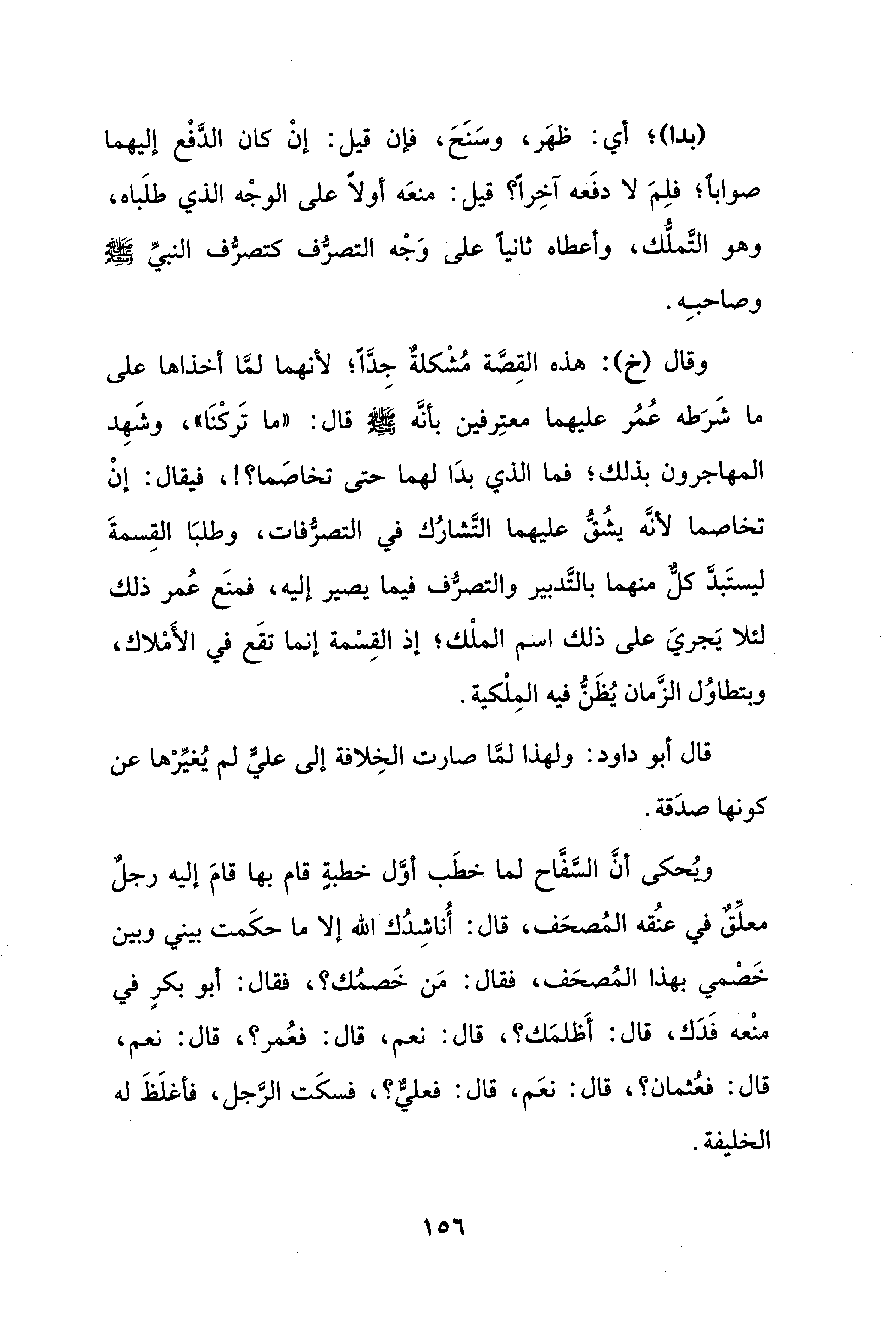 وقال (خ): هذه القِصَّة مُشْكلةٌ جِدًّا؛ لأنهما لمَّا أخذاها على ما شَرَطه عُمُر عليهما معتِرفين بأنَّه - صلى الله عليه وسلم - قال: "ما تَركْنَا"، وشَهِد المهاجرون بذلك؛ فما الذي بدَا لهما حتَّى تخاصَما؟!، فيقال: إنْ تخاصما لأنَّه يشُقُّ عليهما التَّشارُك في التصرُّفات، وطلبَا القِسمةَ ليستَبدَّ كلُّ منهما بالتَّدبير والتصرُّف فيما يصير إليه، فمنعَ عُمر ذلك لئلا يَجريَ على ذلك اسم الملْك؛ إذ القِسْمة إنما تقَع في الأَمْلاك، وبتطاوُل الزَّمان يُظَنُّ فيه المِلْكية.