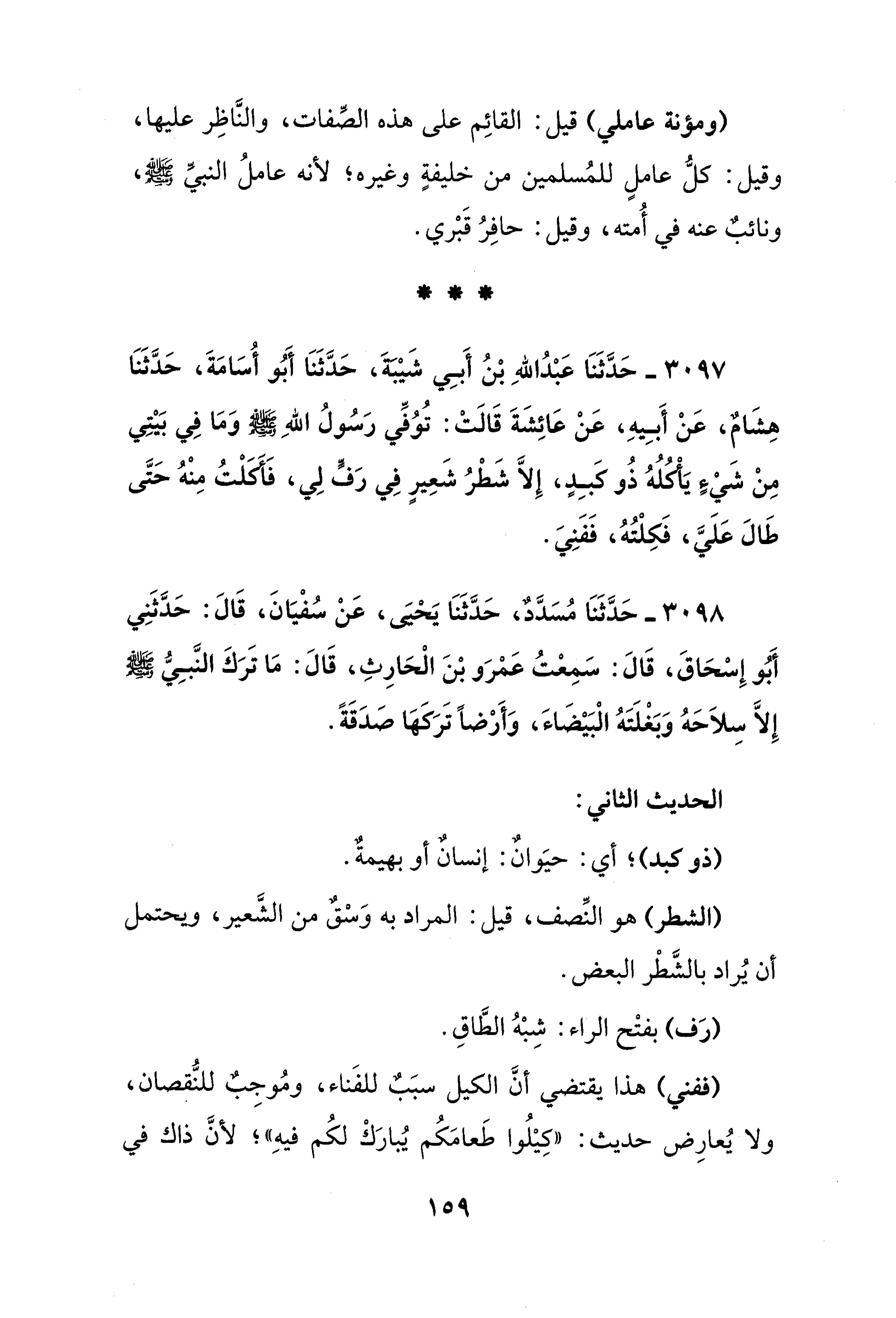 3097 - حَدَّثَنَا عَبْدُ اللهِ بْنُ أَبِي شَيْبَةَ، حَدَّثَنَا أَبُو أُسَامَةَ، حَدَّثَنَا هِشَامٌ، عَنْ أَبِيهِ، عَنْ عَائِشَةَ قَالَتْ: تُوُفِّي رَسُولُ اللهِ - صلى الله عليه وسلم - وَمَا فِي بَيْتِي مِنْ شَيْءٍ يَأْكلُهُ ذُو كَبِدٍ، إلا شَطْرُ شَعِيرٍ فِي رَفًّ لِي، فَأَكَلْتُ مِنْهُ حَتَّى طَالَ عَلَيَّ، فَكِلْتُهُ، فَفَنِيَ.