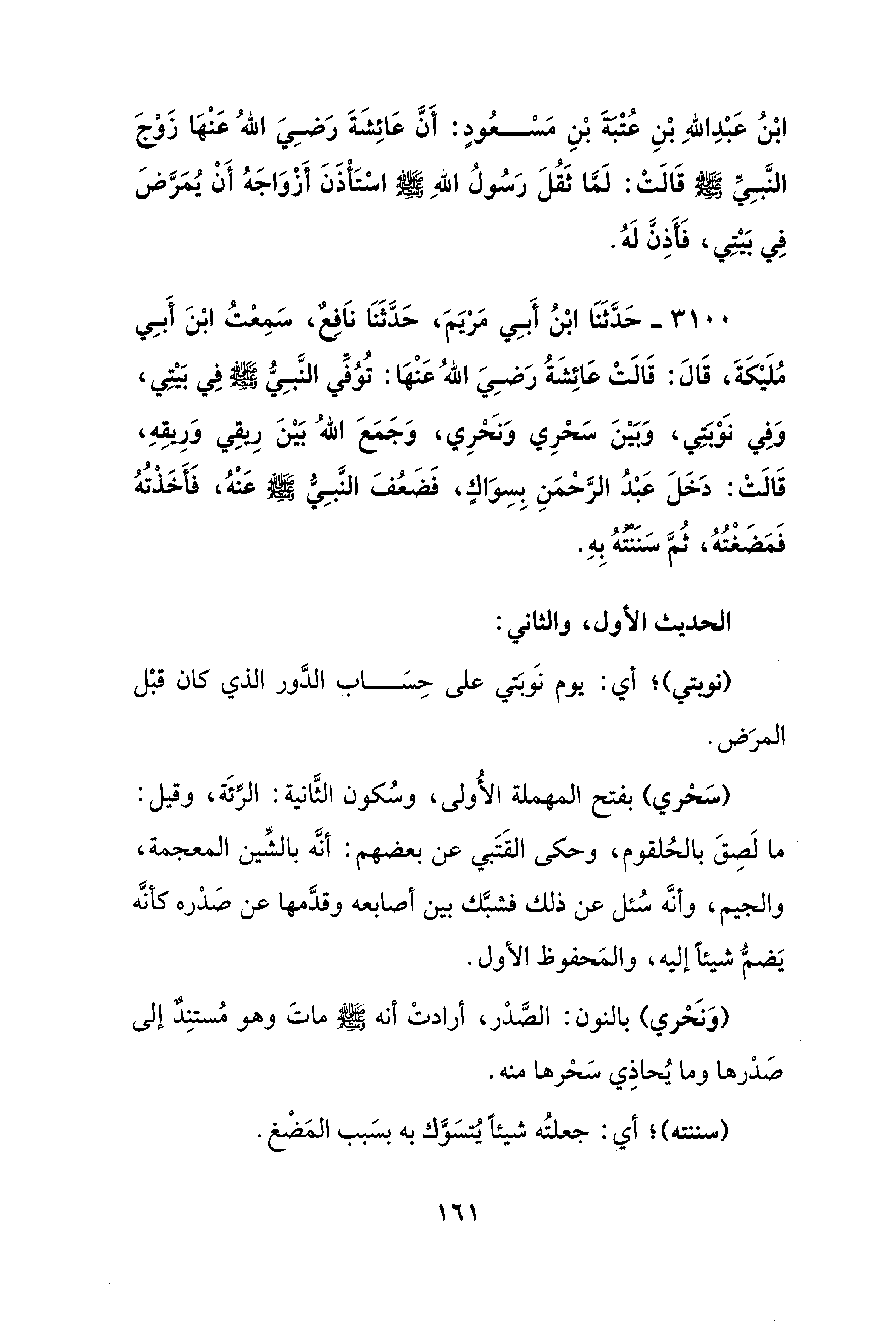 3100 - حَدَّثَنَا ابْنُ أَبِي مَرْيَمَ، حَدَّثَنَا نَافِعٌ، سَمِعْتُ ابْنَ أَبِي مُلَيْكَةَ، قَالَ: قَالَتْ عَائِشَةُ رَضِيَ اللهُ عَنْهَا: تُوُفَّي النَّبِيُّ - صَلَّى الله عَلَيْهِ وَسَلَّمَ - فِي بَيْتِي، وَفِي نَوْبَتِي، وَبَيْنَ سَحْرِي وَنَحْرِي، وَجَمَعَ اللهُ بَيْنَ رِيقِي وَرِيقِهِ، قَالَتْ: دَخَلَ عَبْدُ الرَّحْمَنِ بِسِوَاكٍ، فَضَعُفَ النَّبِيُّ - صَلَّى الله عَلَيْهِ وَسَلَّمَ - عَنْهُ، فَأَخَذْتُهُ فَمَضَغْتُهُ، ثُمَّ سَنَنْتُهُ بِهِ.