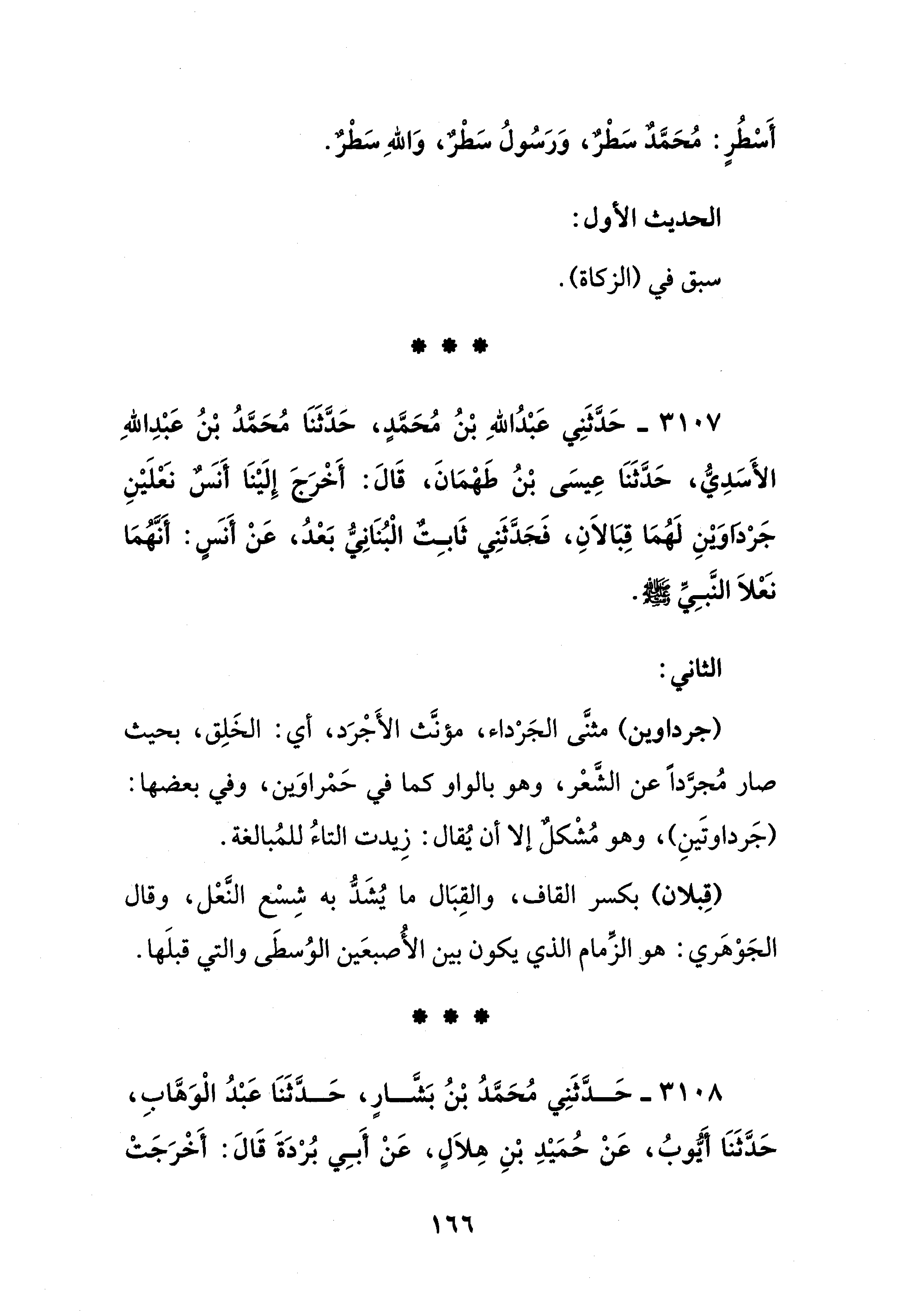 3107 - حَدَّثَنِي عَبْدُ اللهِ بْنُ مُحَمَّدٍ، حَدَّثَنَا مُحَمَّدُ بْنُ عَبْدِ اللهِ الأَسَدِيُّ، حَدَّثَنَا عِيسَى بْنُ طَهْمَانَ، قَالَ: أَخْرَجَ إِلَيْنَا أَنسٌ نَعْلَيْنِ جَرْداَوَيْنِ لَهُمَا قِبَالَانِ، فَحَدَّثَنِي ثَابِتٌ الْبُنَانِيُّ بَعْدُ، عَنْ أَنسٍ: أَنَّهُمَا نَعْلَا النَّبِيِّ - صَلَّى الله عَلَيْهِ وَسَلَّمَ -.
