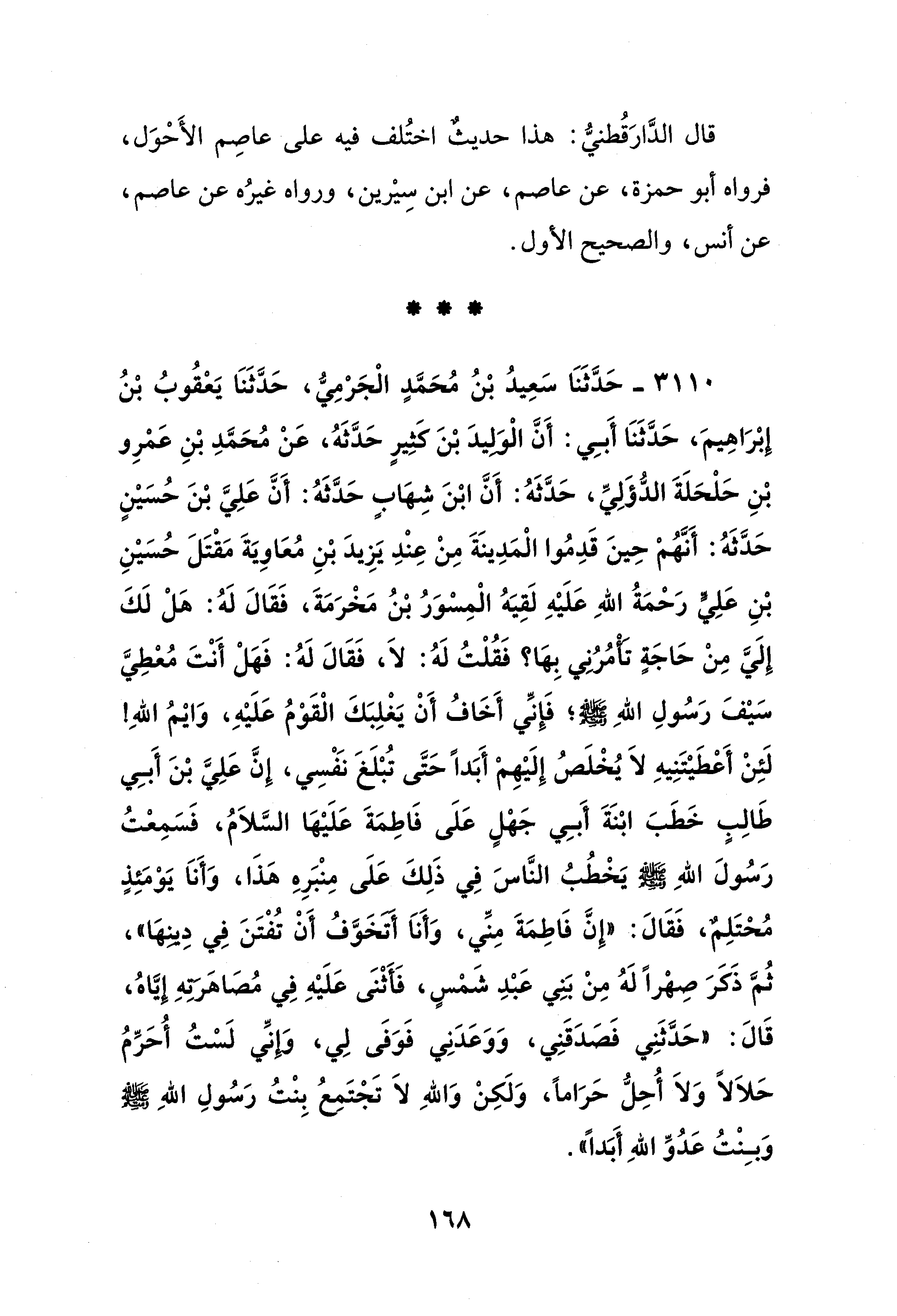 3110 - حَدَّثَنَا سَعِيدُ بْنُ مُحَمَّدٍ الْجَرْمِيُّ، حَدَّثَنَا يَعْقُوبُ بْنُ إِبْرَاهِيمَ، حَدَّثَنَا أَبِي: أَنَّ الْوَليدَ بْنَ كثِيرٍ حَدَّثَهُ، عَنْ مُحَمَّدِ بْنِ عَمْرِو بْنِ حَلْحَلَةَ الدُّؤَلِيَّ، حَدَّثَهُ: أَنَّ ابْنَ شِهَابٍ حَدَّثَهُ: أَنَّ عَلِيَّ بْنَ حُسَيْنٍ حَدَّثَهُ: أَنَّهُمْ حِينَ قَدِمُوا الْمَدِينَةَ مِنْ عِنْدِ يَزِيدَ بْنِ مُعَاوِيَةَ مَقْتَلَ حُسَيْنِ بْنِ عَلِيٍّ رَحْمَةُ اللهِ عَلَيْهِ لَقِيَهُ الْمِسْوَرُ بْنُ مَخْرَمَةَ، فَقَالَ لَهُ: هَلْ لَكَ إِلَيَّ مِنْ حَاجَةٍ تَأْمُرُنِي بِهَا؟ فَقُلْتُ لَهُ: لا، فَقَالَ لَهُ: فَهَلْ أَنْتَ مُعْطِيَّ سَيْفَ رَسُولِ اللهِ -صَلَّى الله عَلَيْهِ وَسَلَّمَ-؛ فَإِنِّي أَخَافُ أَنْ يَغْلِبَكَ الْقَوْمُ عَلَيْهِ، وَايْمُ اللهِ! لَئِنْ أَعْطَيْتَنِيهِ لا يُخْلَصُ إِلَيْهِمْ أَبَدًا حَتَّى تُبْلَغَ نَفْسِي، إِنَّ عَلِيَّ بْنَ أَبِي طَالِبٍ خَطَبَ ابْنَةَ أَبِي جَهْلٍ عَلَى فَاطِمَةَ عَلَيْهَا السَّلَامُ، فَسَمِعْتُ رَسُولَ اللهِ - صَلَّى الله عَلَيْهِ وَسَلَّمَ - يَخْطُبُ النَّاسَ فِي ذَلِكَ عَلَى مِنْبَرِهِ هَذَا، وَأَنَا يَوْمَئِذٍ مُحْتَلِمٌ، فَقَالَ: "إِنَّ فَاطِمَةَ مِنِّي، وَأَنَا أتخَوَّفُ أَنْ تُفْتَنَ فِي دِينِهَا"، ثُمَّ ذَكرَ صِهْرًا لَهُ مِنْ بَنِي عَبْدِ شَمْسٍ، فَأَثْنَى عَلَيْهِ فِي مُصَاهَرَتِهِ إِيَّاهُ، قَالَ: "حَدَّثَنِي فَصَدَقَنِي، وَوَعَدَنِي فَوَفَى لِي، وَإِنَّي لَسْتُ أحُرِّمُ حَلَالًا وَلَا أُحِلُّ حَرَامًا، وَلَكِنْ وَاللهِ لا تَجْتَمِعُ بِنْتُ رَسُولِ اللهِ -صَلَّى الله عَلَيْهِ وَسَلَّمَ- وَبِنْتُ عَدُوِّ اللهِ أَبَدًا".
