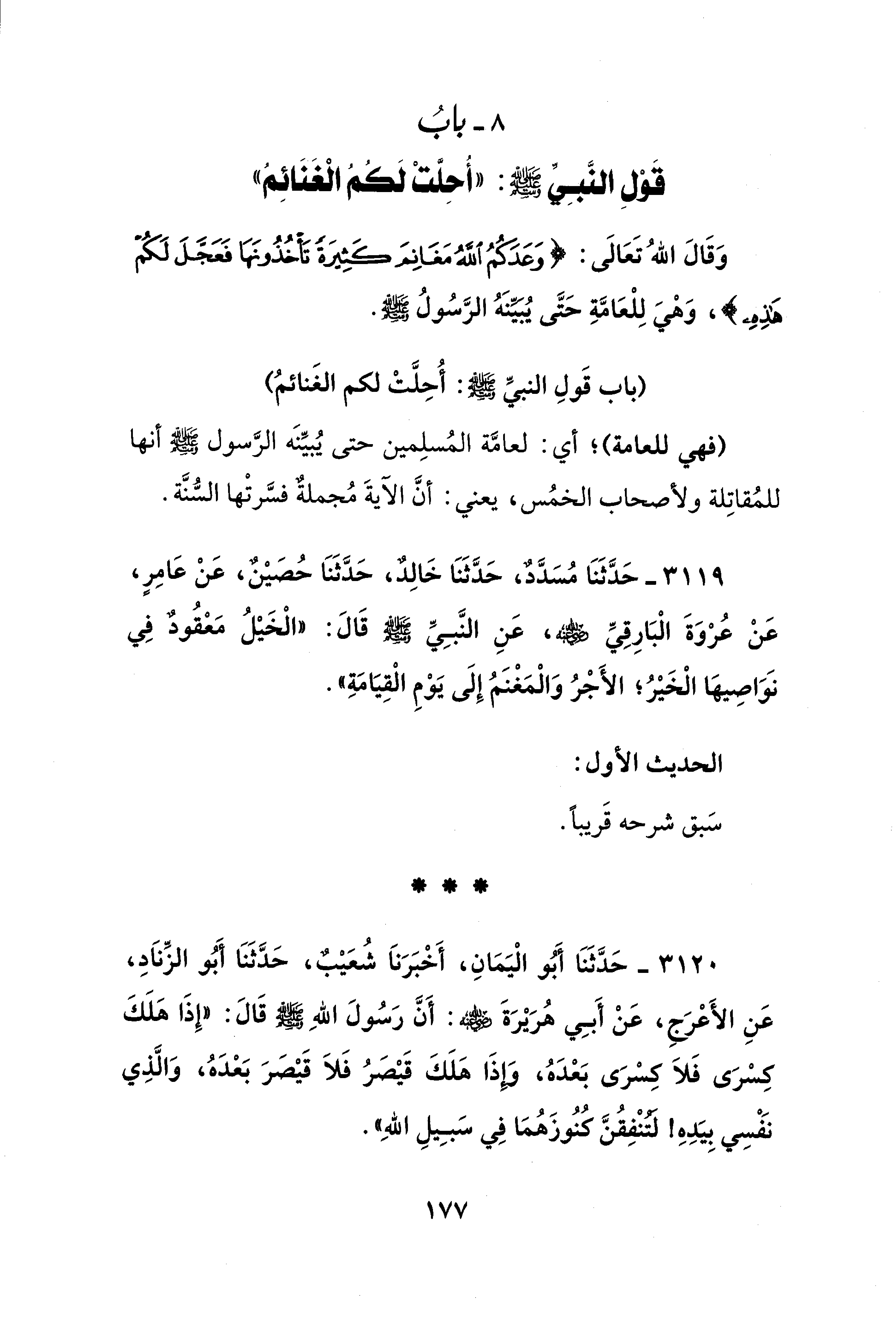 3119 - حَدَّثَنَا مُسَدَّدٌ، حَدَّثَنَا خَالِدٌ، حَدَّثَنَا حُصَيْنٌ، عَنْ عَامِرٍ، عَنْ عُرْوَةَ الْبَارِقِيِّ - رضي الله عنه -، عَنِ النَّبِيِّ - صلى الله عليه وسلم - قَالَ: "الْخَيْلُ مَعْقُودٌ فِي نَوَاصِيهَا الْخَيْرُ؛ الأَجْرُ وَالْمَغْنَمُ إِلَى يَوْمِ الْقِيَامَةِ".