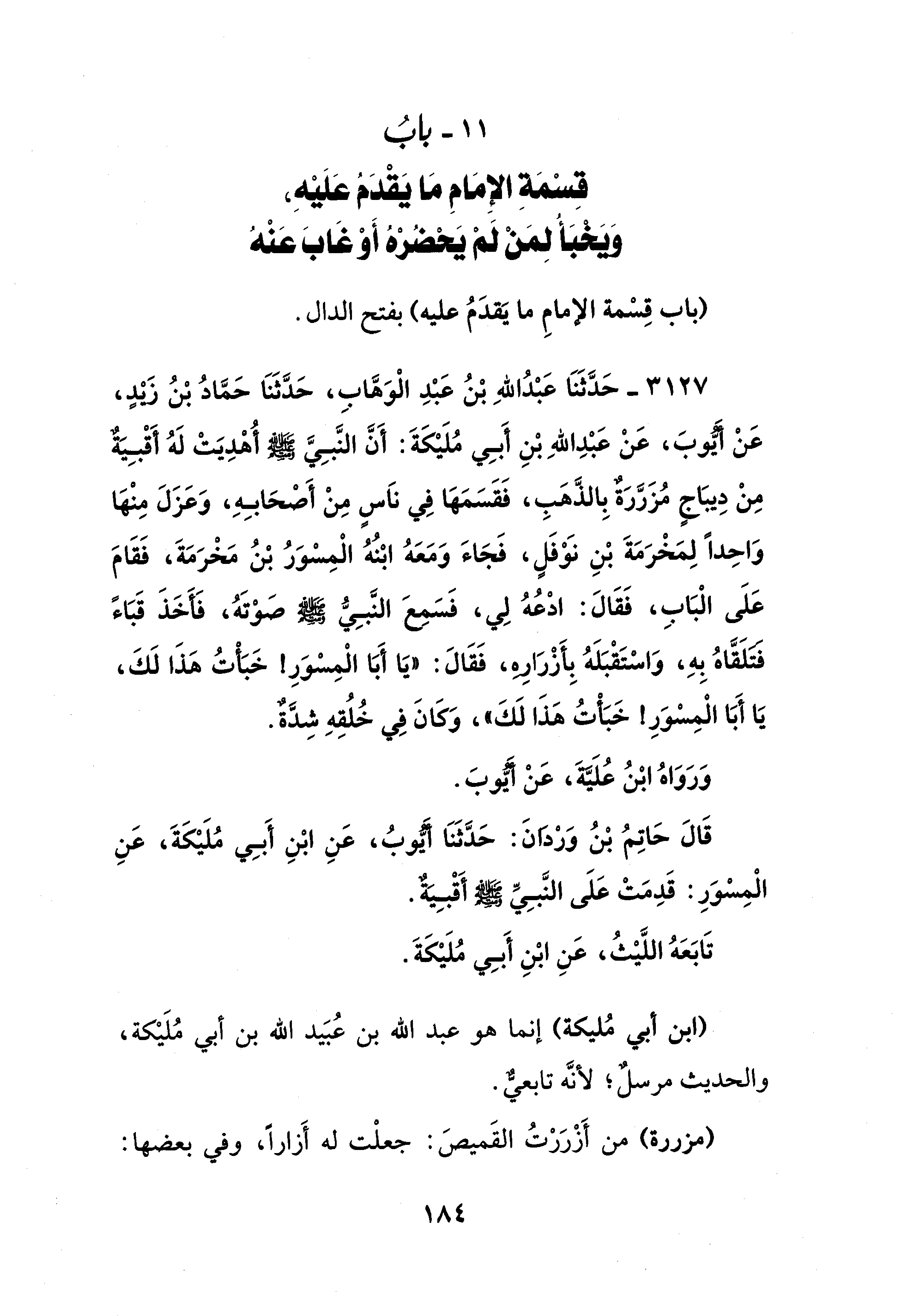 3127 - حَدَّثَنَا عَبْدُ اللهِ بْنُ عَبْدِ الْوَهَّابِ، حَدَّثَنَا حَمَّادُ بْنُ زيدٍ، عَنْ أَيُّوبَ، عَنْ عَبْدِ اللهِ بْنِ أَبِي مُلَيْكَةَ: أَنَّ النَّبِيَّ - صلى الله عليه وسلم - أُهْدِيَتْ لَهُ أَقْبِيةٌ مِنْ دِيبَاجٍ مُزَرَّرَةٌ بِالذَّهَبِ، فَقَسَمَهَا فِي نَاسٍ مِنْ أَصْحَابِهِ، وَعَزَلَ مِنْهَا وَاحِدًا لِمَخْرَمَةَ بْنِ نوفَلٍ، فَجَاءَ وَمَعَهُ ابْنُهُ الْمِسْوَرُ بْنُ مَخْرَمَةَ، فَقَامَ عَلَى الْبَابِ، فَقَالَ: ادْعُهُ لِي، فَسَمِعَ النَّبِيُّ - صَلَّى الله عَلَيْهِ وَسَلَّمَ - صَوْتَهُ، فَأَخَذَ قَبَاءً فتلَقَّاهُ بِهِ، وَاسْتَقْبَلَهُ بِأَزْرَارِهِ، فَقَالَ: "يَا أَبَا الْمِسْوَرِ! خَبَأْتُ هَذَا لَكَ، يَا أَبَا الْمِسْوَرِ! خَبَأْتُ هَذَا لَكَ"، وَكَانَ فِي خُلُقِهِ شِدَّةٌ.