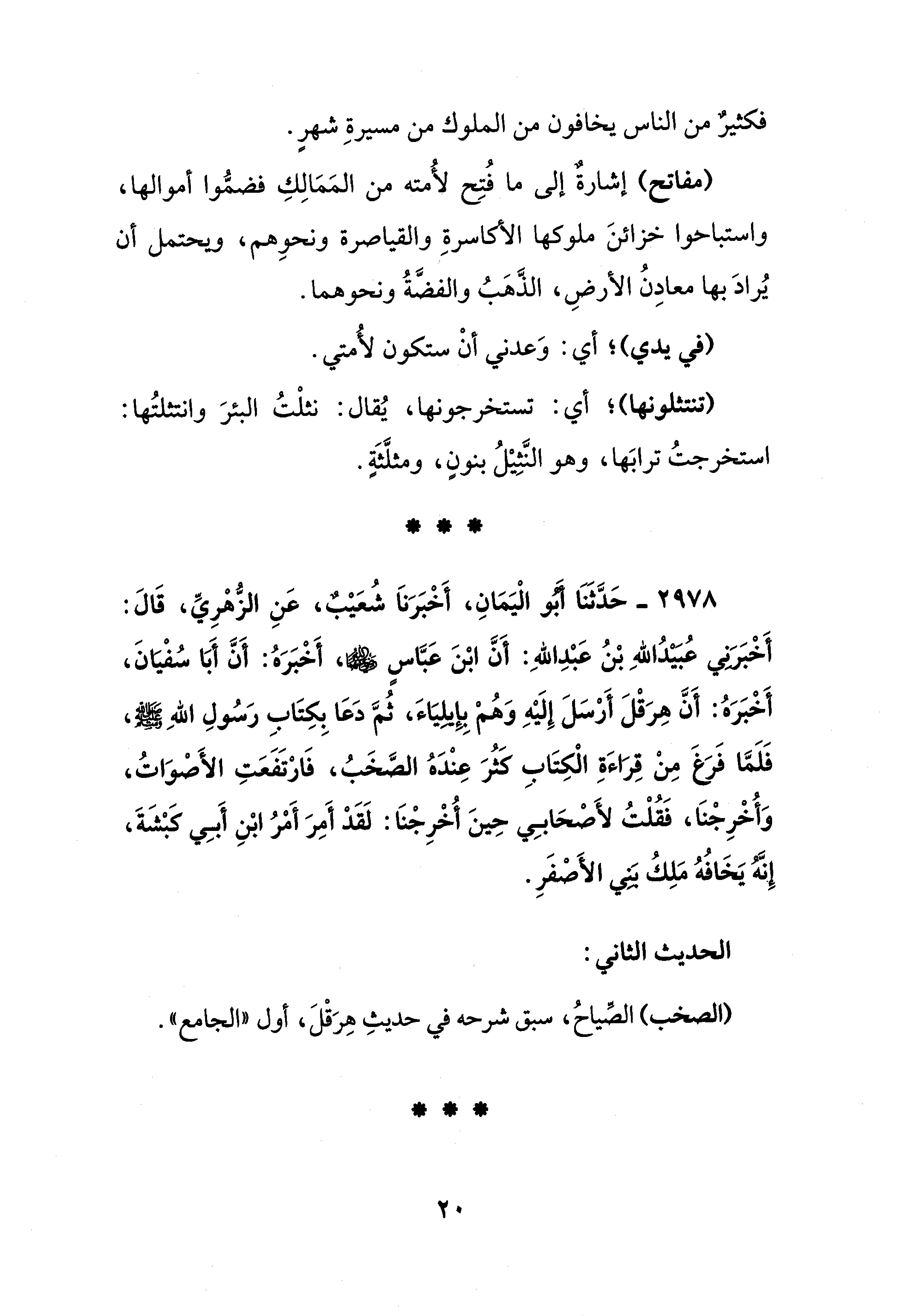2978 - حَدَّثَنَا أَبُو الْيَمَانِ، أَخْبَرَنَا شُعَيْبٌ، عَنِ الزُّهْرِيِّ، قَالَ: أَخْبَرَنِي عُبَيْدُ اللهِ بْنُ عَبْدِ اللهِ: أَنَّ ابْنَ عَبَّاسٍ - رضي الله عنهما -، أَخْبَرَهُ: أَنَّ أَبَا سُفْيَانَ، أَخْبَرَهُ: أَنَّ هِرَقْلَ أَرْسَلَ إِلَيْهِ وَهُمْ بِإِيلِيَاءَ، ثُمَّ دَعَا بِكِتَابِ رَسُولِ اللهِ - صلى الله عليه وسلم -، فَلَمَّا فَرَغَ مِنْ قِرَاءَةِ الْكِتَابِ كَثُرَ عِنْدَهُ الصَّخَبُ، فَارْتَفَعَتِ الأَصْوَاتُ، وَأُخْرِجْنَا، فَقُلْتُ لأَصْحَابِي حِينَ أُخْرِجْنَا: لَقَدْ أَمِرَ أَمْرُ ابْنِ أَبِي كَبْشَةَ، إِنَّهُ يَخَافُهُ مَلِكُ بَنِي الأَصْفَرِ.