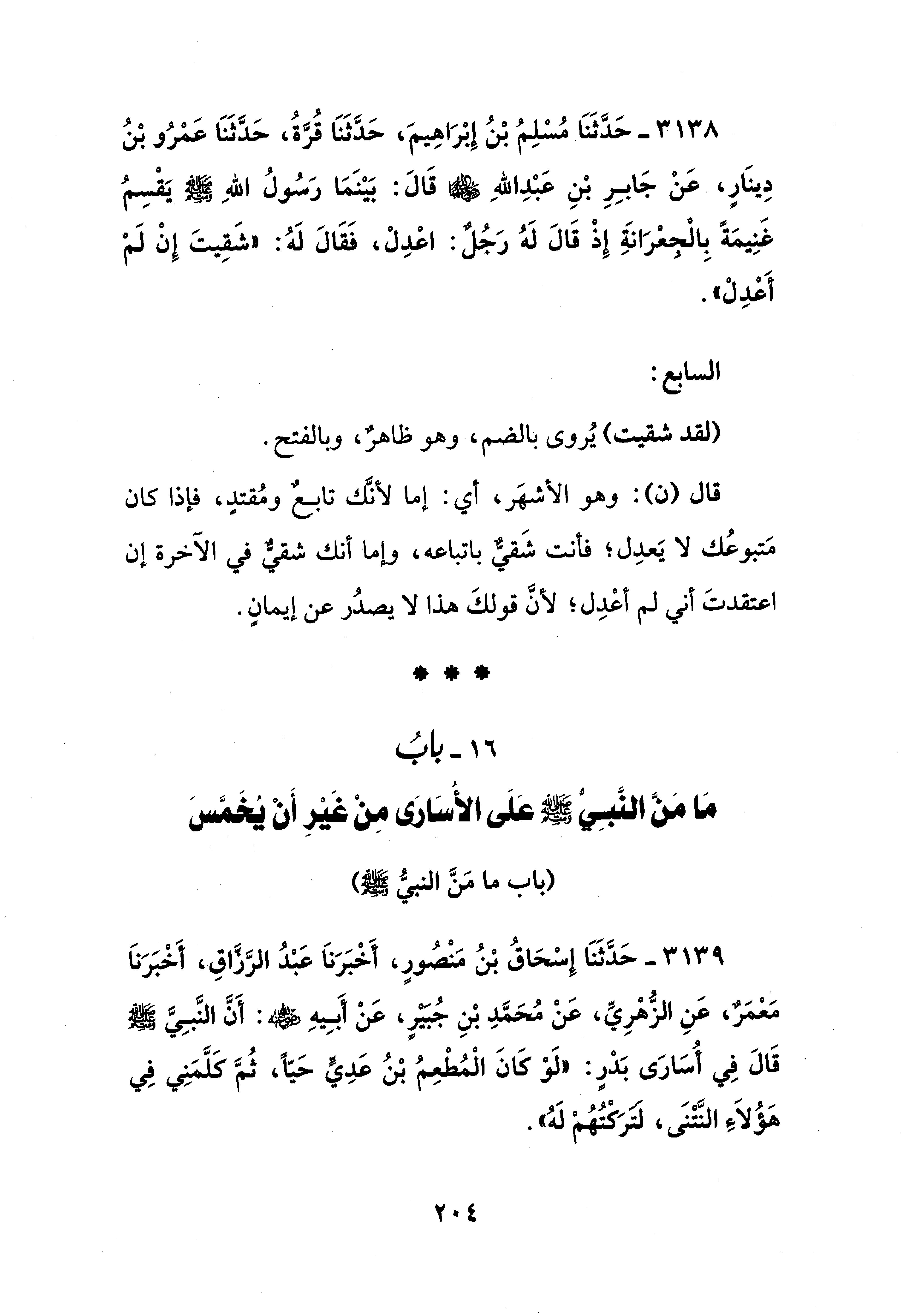 3138 - حَدَّثَنَا مُسْلِمُ بْنُ إِبْرَاهِيمَ، حَدَّثَنَا قُرَّةُ، حَدَّثَنَا عَمْرُو بْنُ دِينَارٍ، عَنْ جَابِرِ بْنِ عَبْدِ اللهِ - رضي الله عنهما - قَالَ: بَيْنَمَا رَسُولُ اللهِ - صَلَّى الله عَلَيْهِ وَسَلَّمَ - يَقْسِمُ غَنِيمَةً بِالْجِعْرَانَةِ إِذْ قَالَ لَهُ رَجُلٌ: اعْدِلْ، فَقَالَ لَهُ: "شَقِيتَ إِنْ لَمْ أَعْدِلْ".