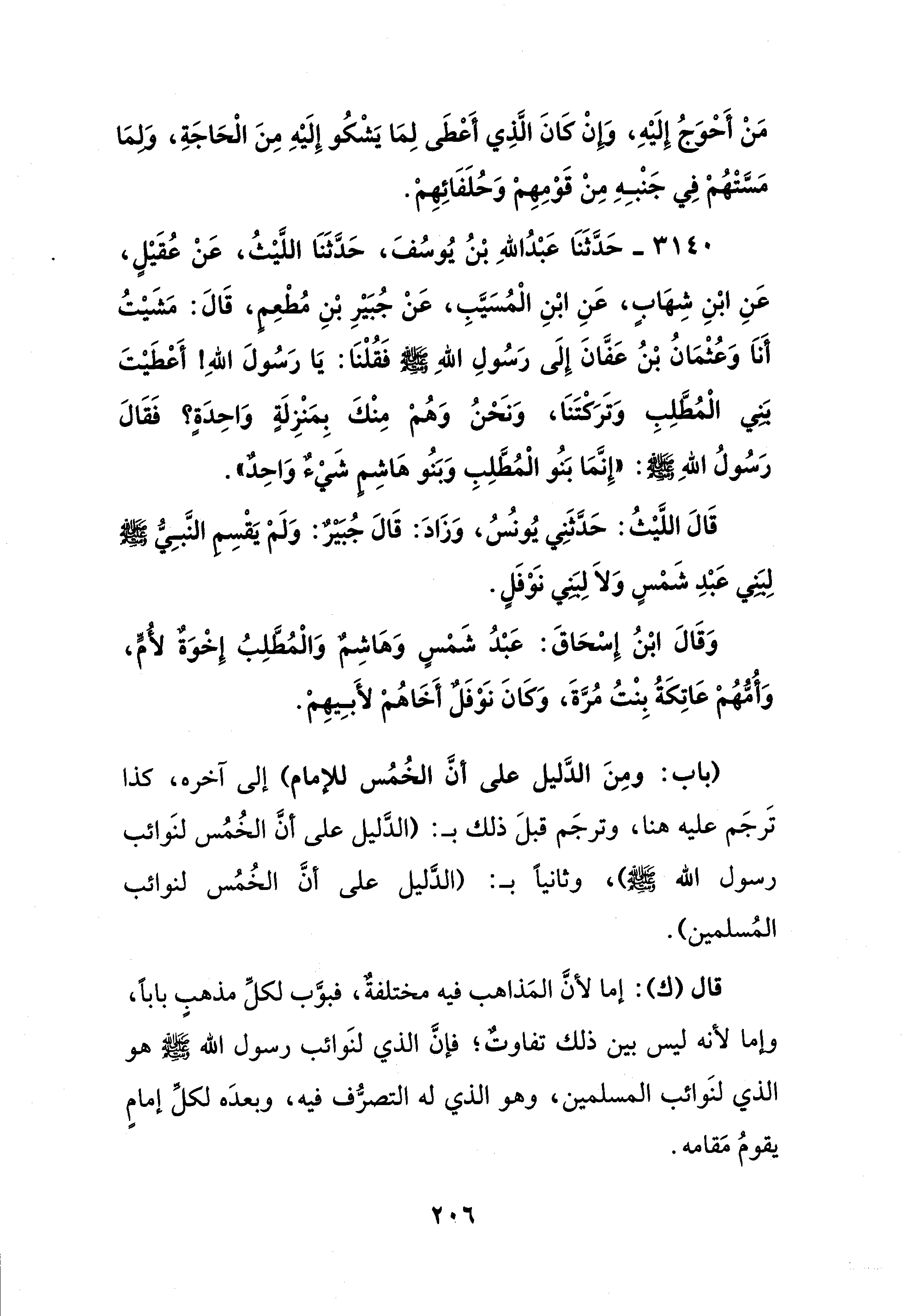 3140 - حَدَّثَنَا عَبْدُ اللهِ بْنُ يُوسُفَ، حَدَّثَنَا اللَّيْثُ، عَنْ عُقَيْلٍ، عَنِ ابْنِ شِهَابٍ، عَنِ ابْنِ الْمُسَيَّبِ، عَنْ جُبَيْرِ بْنِ مُطْعِمٍ، قَالَ: مَشَيْتُ أَنَا وَعُثْمَانُ بْنُ عَفَّانَ إِلَى رَسُولِ اللهِ - صلى الله عليه وسلم - فَقُلْنَا: يَا رَسُولَ اللهِ! أَعْطَيْتَ بَنِي الْمُطَّلِبِ وَتَرَكْتَنَا، وَنَحْنُ وَهُمْ مِنْكَ بِمَنْزِلَةٍ وَاحِدَةٍ؟ فَقَالَ رَسُولُ اللهِ - صَلَّى الله عَلَيْهِ وَسَلَّمَ -: "إِنَّمَا بَنُو الْمُطَّلِبِ وَبَنُو هَاشِمٍ شَيْءٌ وَاحِدٌ".